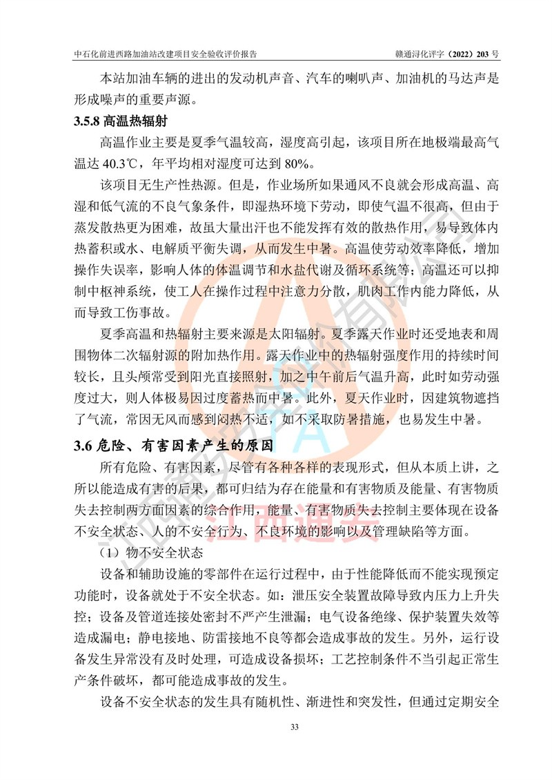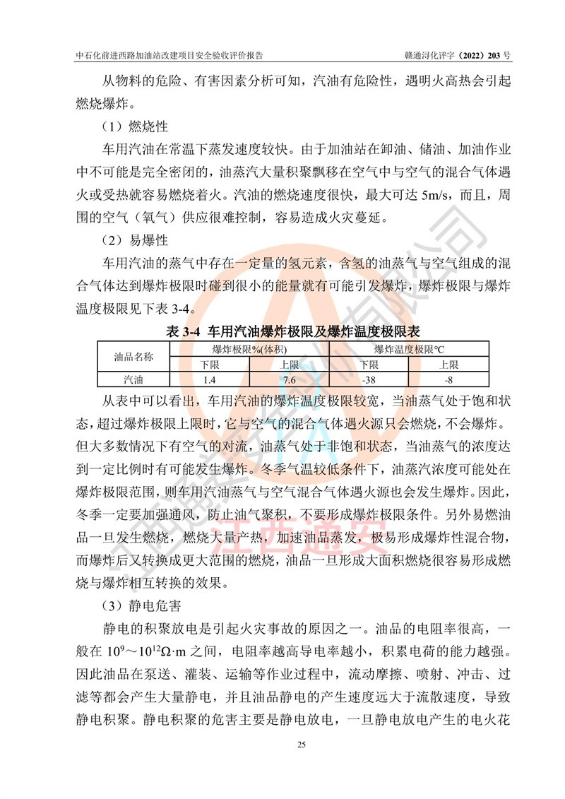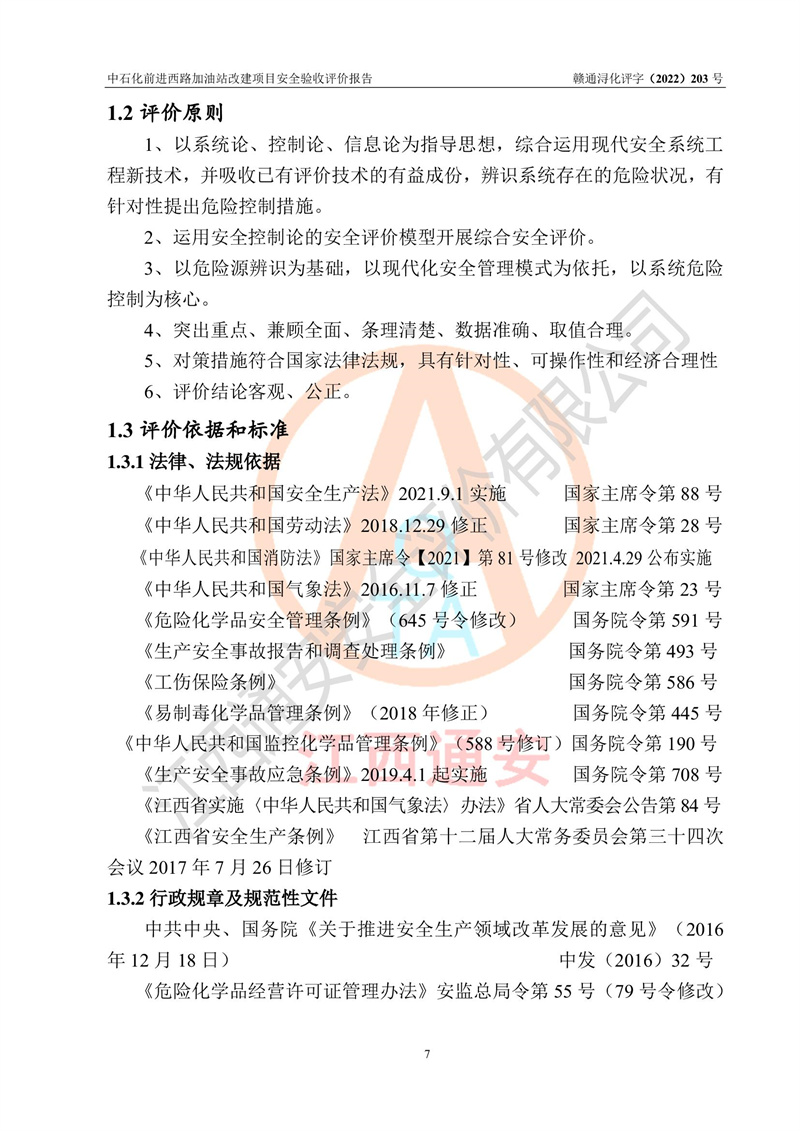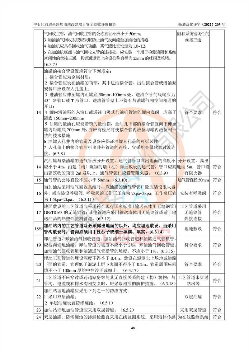 评价结论 | 中国石化销售股份有限公司江西九江濂溪石油分公司前进西路加油站改建项目涉及的安全条件、安全生产条件、安全生产管理符合《危险化学品经营许可证管理办法》、《汽车加油加气加氢站技术标准》等**有关法规、标准、规范要求,能满足成品油零售经营单位的安全条件,具备项目竣工验收的条件。 | |||