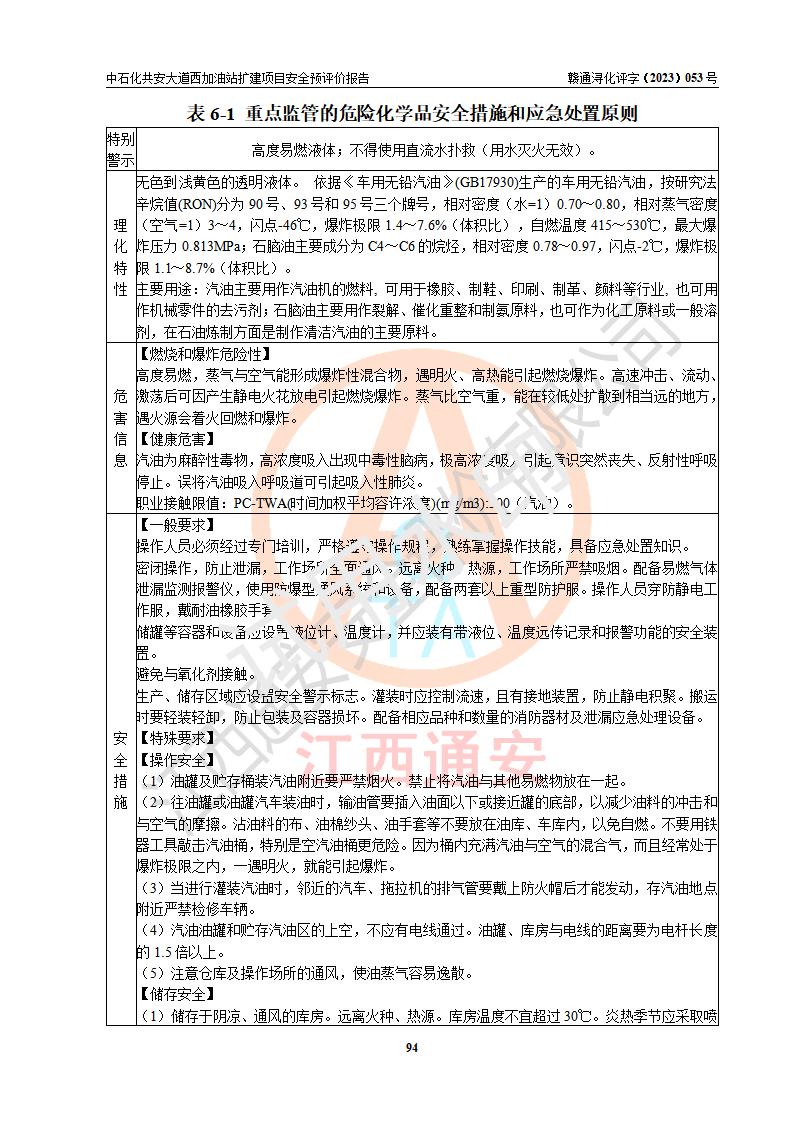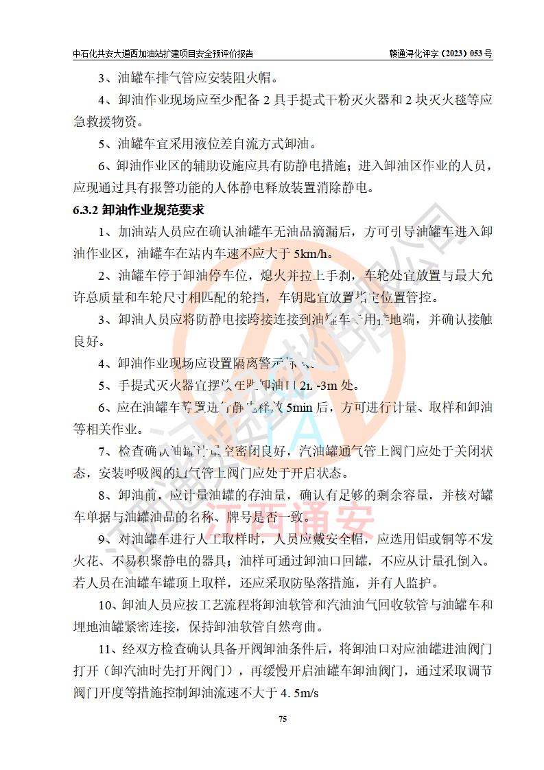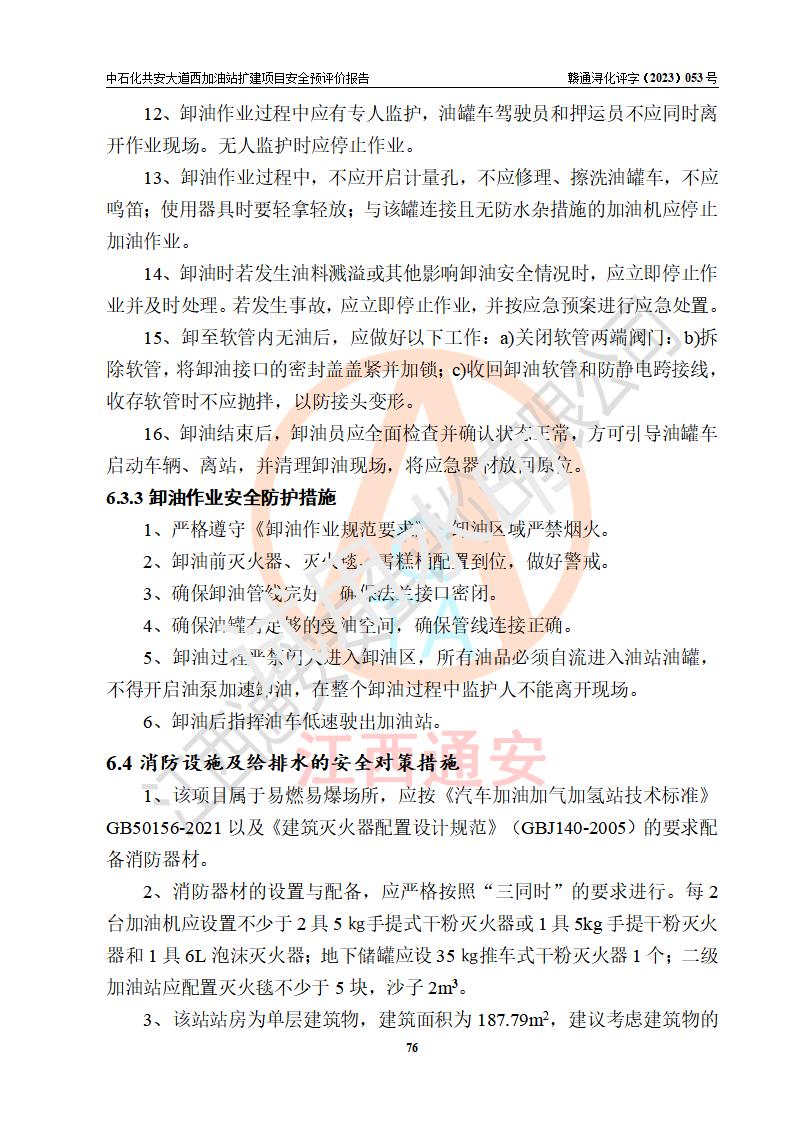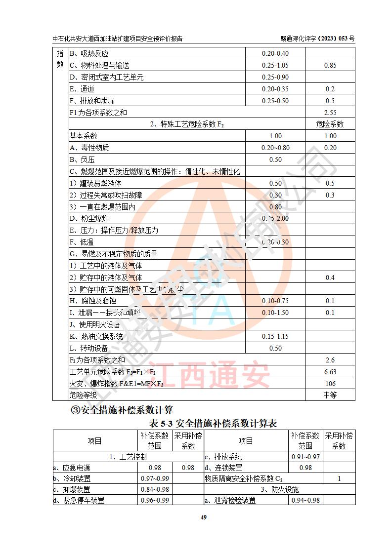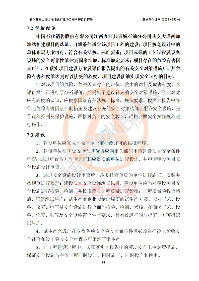 评价结论 | 中国石化销售股份有限公司江西九江共青城石油分公司共安大道西加油站扩建项目的选址、自然条件适宜该项目工程的建设;项目规划设计中的总体布局方案可行,符合有关法规、标准要求;项目选择的工艺过程及设备设施的安全可靠性能达到**法规、标准规定要求;项目存在的危险有害因素可控,在落实项目建设方案及评价报告提出的有关安全对策措施后,其危险有害程度能达到可以接受的程度,项目建设能够实现安全运行的目标。 | |||