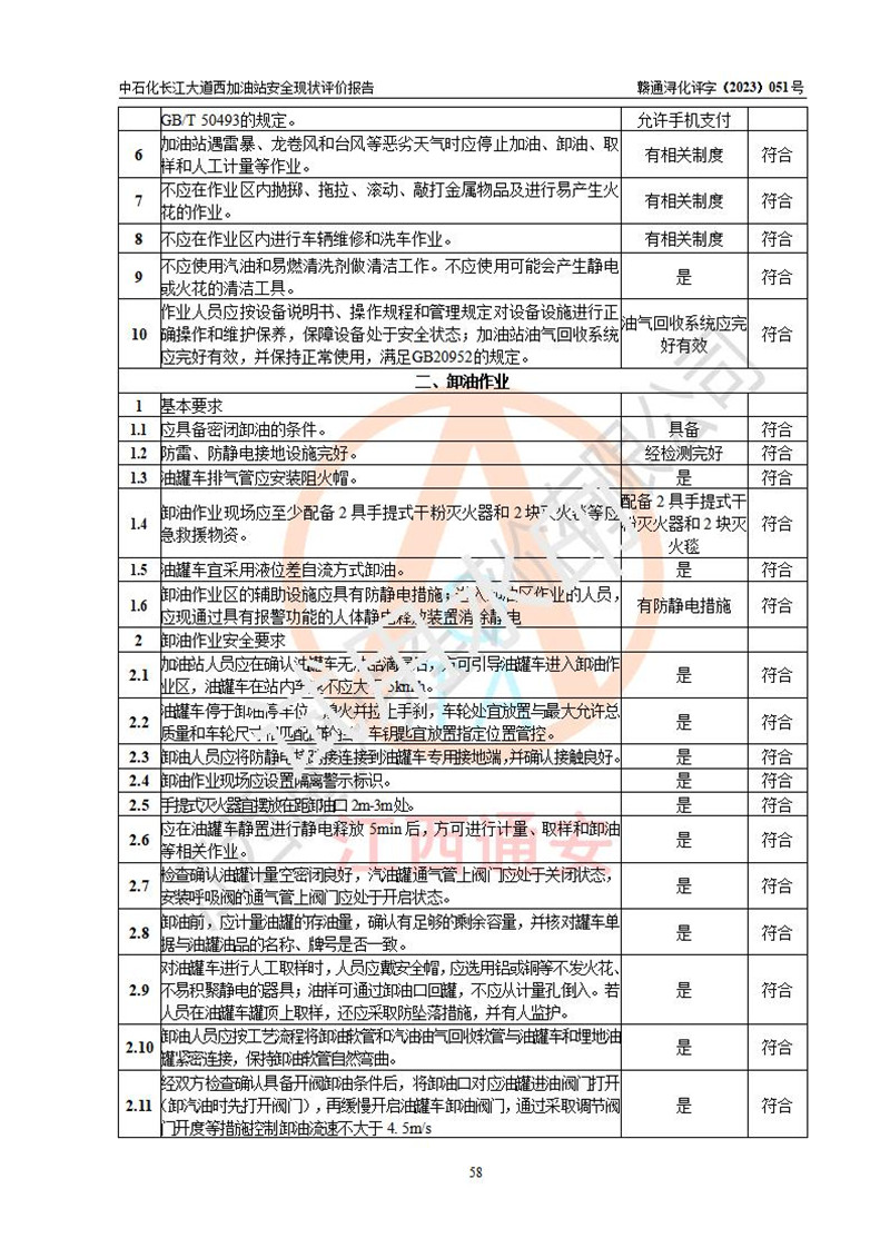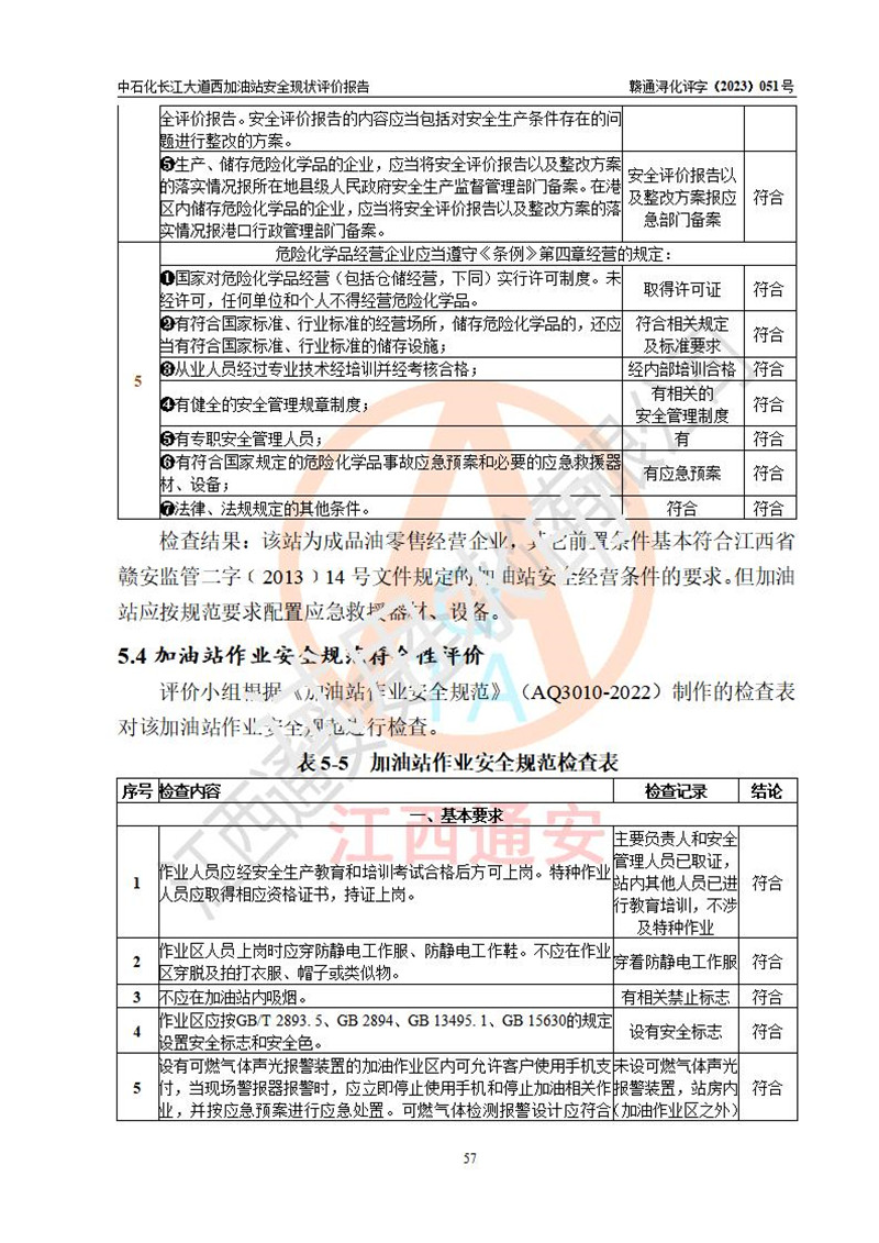 评价结论 | 中国石化销售股份有限公司江西九江浔阳石油分公司长江大道西加油站涉及的安全条件、安全经营条件、安全生产管理符合《危险化学品经营许可证管理办法》、《汽车加油加气加氢站技术标准》等**有关法规、标准、规范要求,能满足危险化学品经营安全条件。 | |||