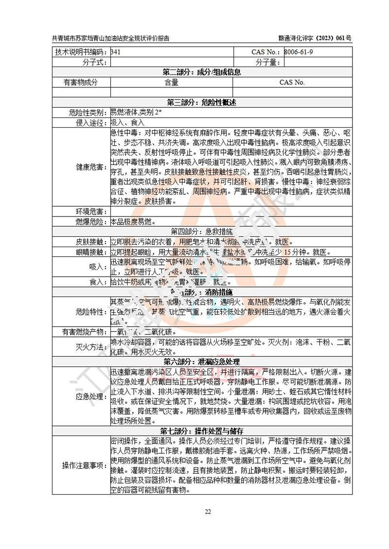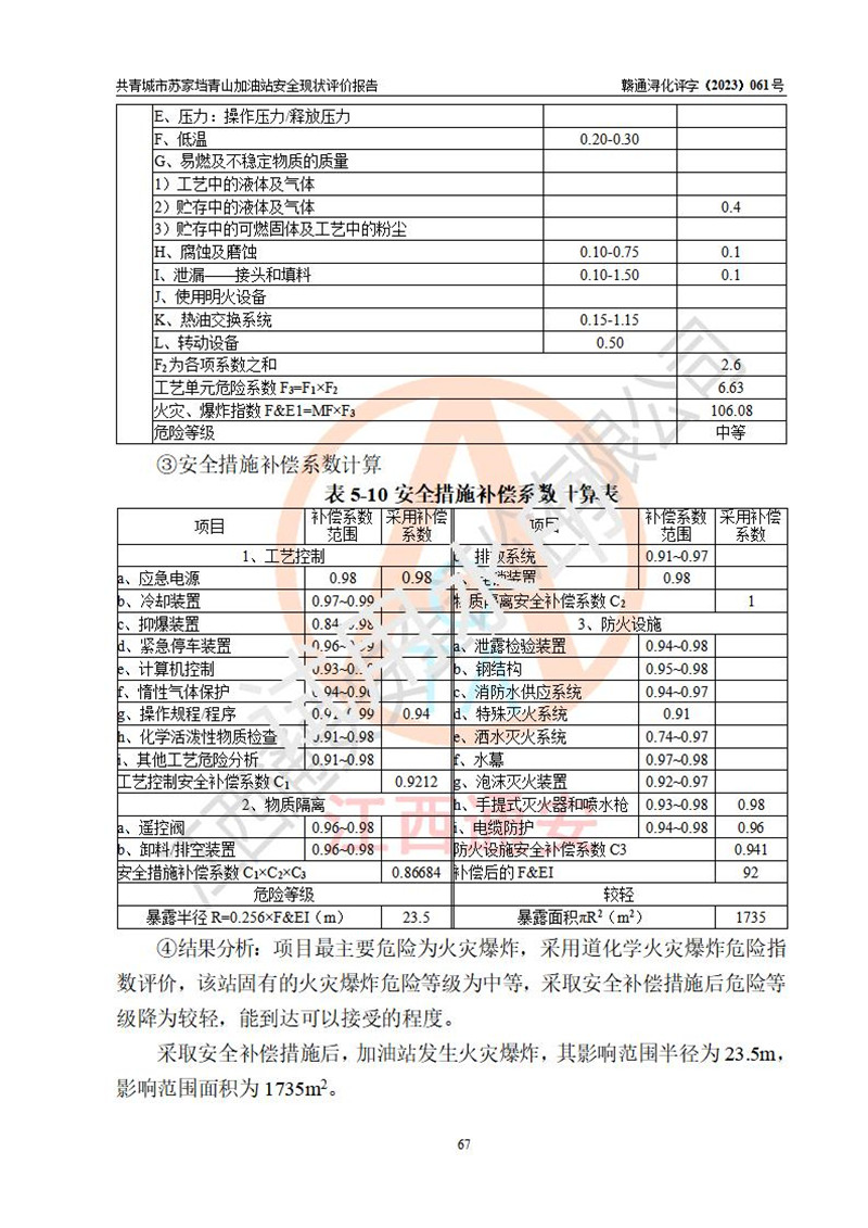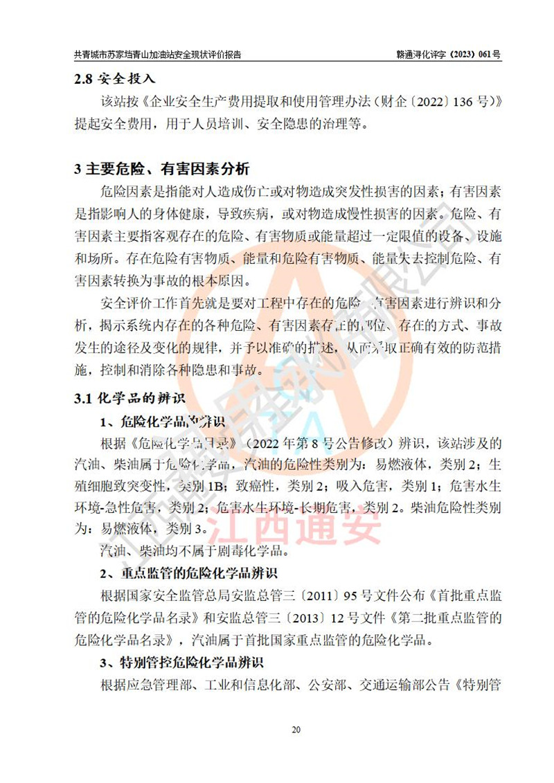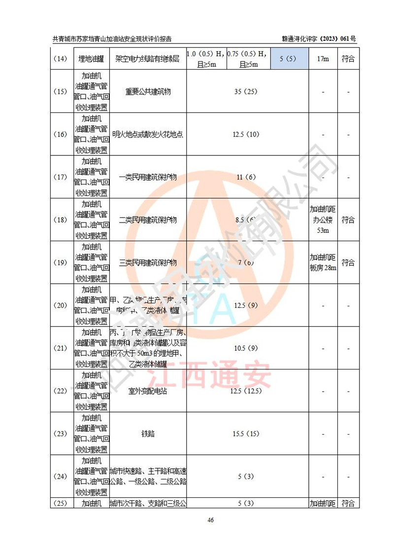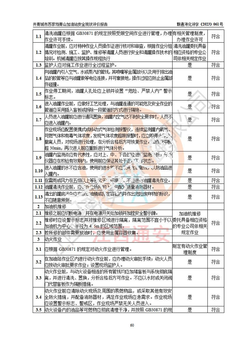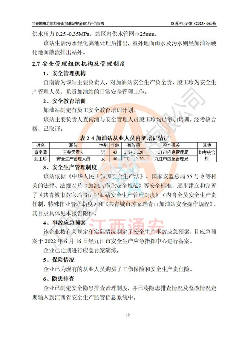 评价结论 | 共青城市苏家垱青山加油站涉及的安全条件、安全经营条件、安全生产管理符合《危险化学品经营许可证管理办法》、《汽车加油加气加氢站技术标准》等**有关法规、标准、规范要求,能满足危险化学品经营安全条件。 | |||
