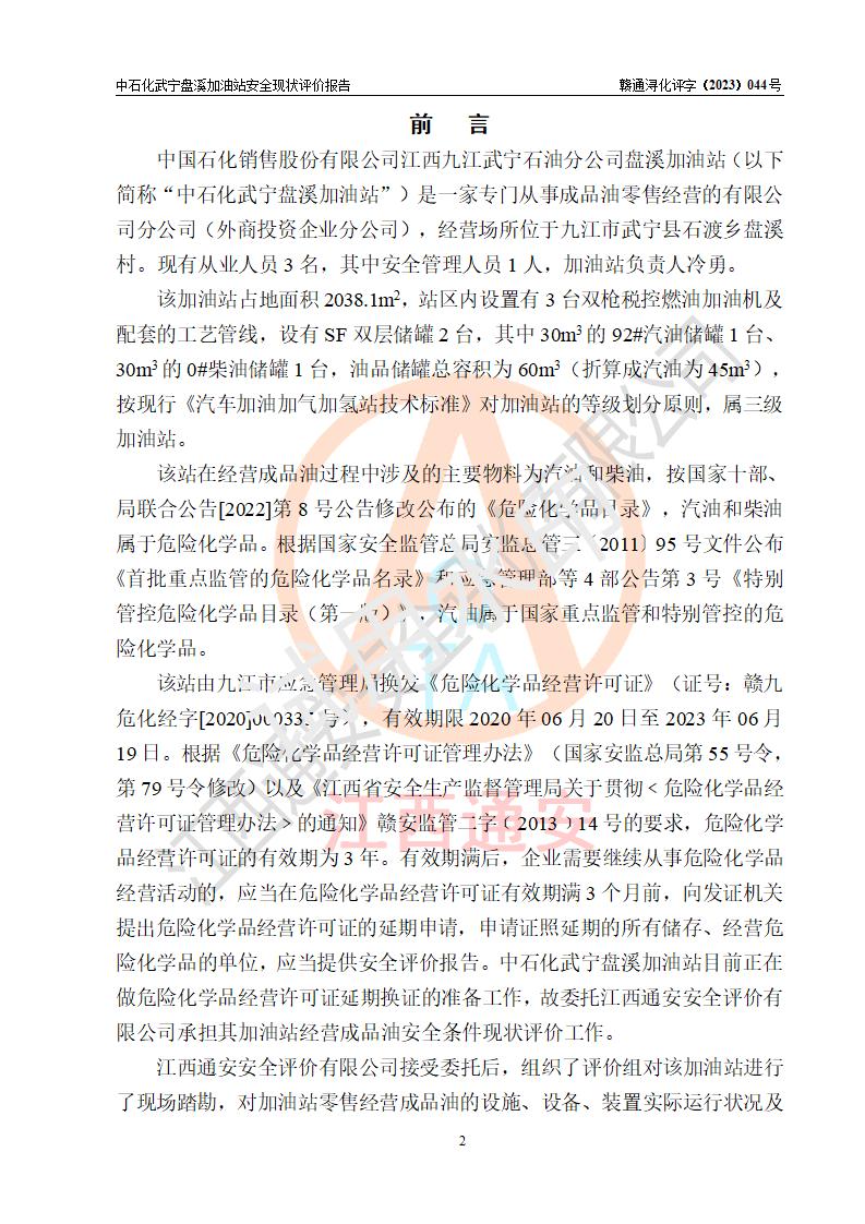 项目简介 | 中国石化销售股份有限公司江西九江武宁石油分公司盘溪加油站是一家专门从事成品油零售经营的有限公司分公司(外商投资企业分公司),经营场所位于九江市武宁县石渡乡盘溪村。现有从业人员3名,其中安全管理人员1人,加油站负责人冷勇。 该加油站占地面积2038.1m2,站区内设置有3台双枪税控燃油加油机及配套的工艺管线,设有SF双层储罐2台,其中30m3的92#汽油储罐1台、30m3的0#柴油储罐1台,油品储罐总容积为60m3(折算成汽油为45m3),按现行《汽车加油加气加氢站技术标准》对加油站的等级划分原则,属三级加油站。 该站由九江市应急管理局换发《危险化学品经营许可证》(证号:赣九危化经字[2020]000335号),**期限2020年06月20日至2023年06月19日。 | |||