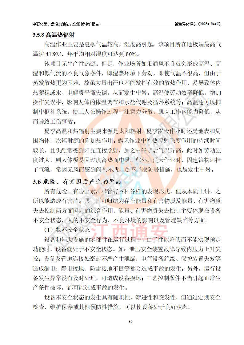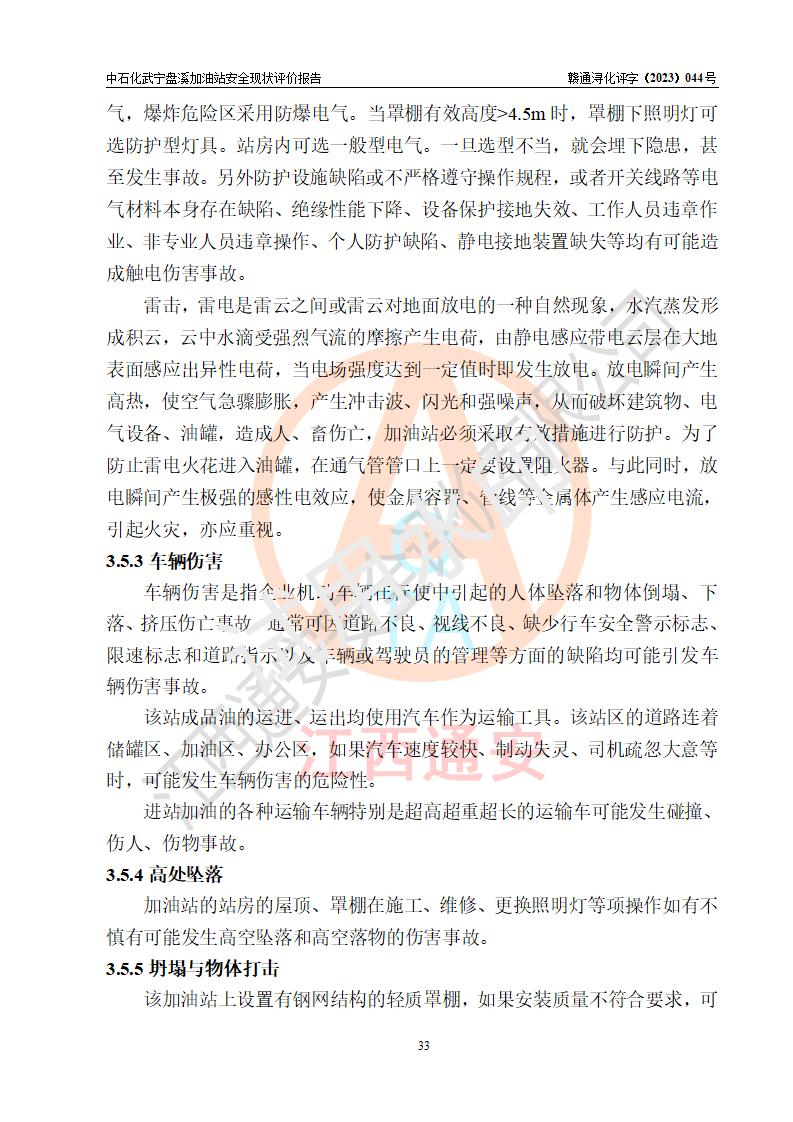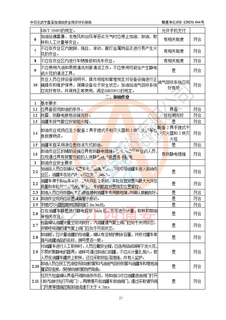 评价结论 | 中国石化销售股份有限公司江西九江武宁石油分公司盘溪加油站储罐和通气管距站外通信线安全间距不足,企业整改后符合《汽车加油加气加氢站技术标准》中的相关要求,涉及的其他安全条件、安全经营条件、安全生产管理符合《危险化学品经营许可证管理办法》、《汽车加油加气加氢站技术标准》等**有关法规、标准、规范要求。 | |||