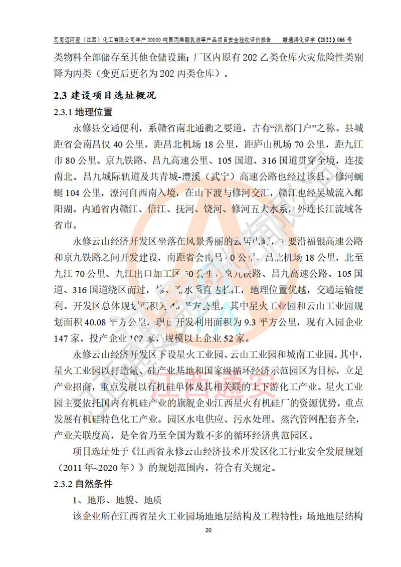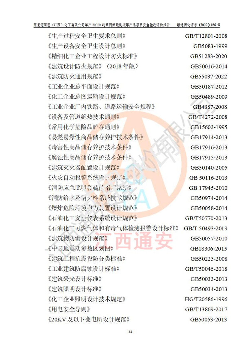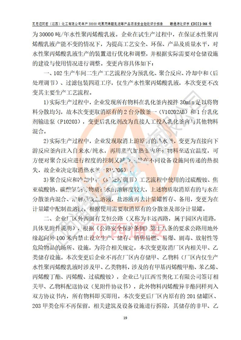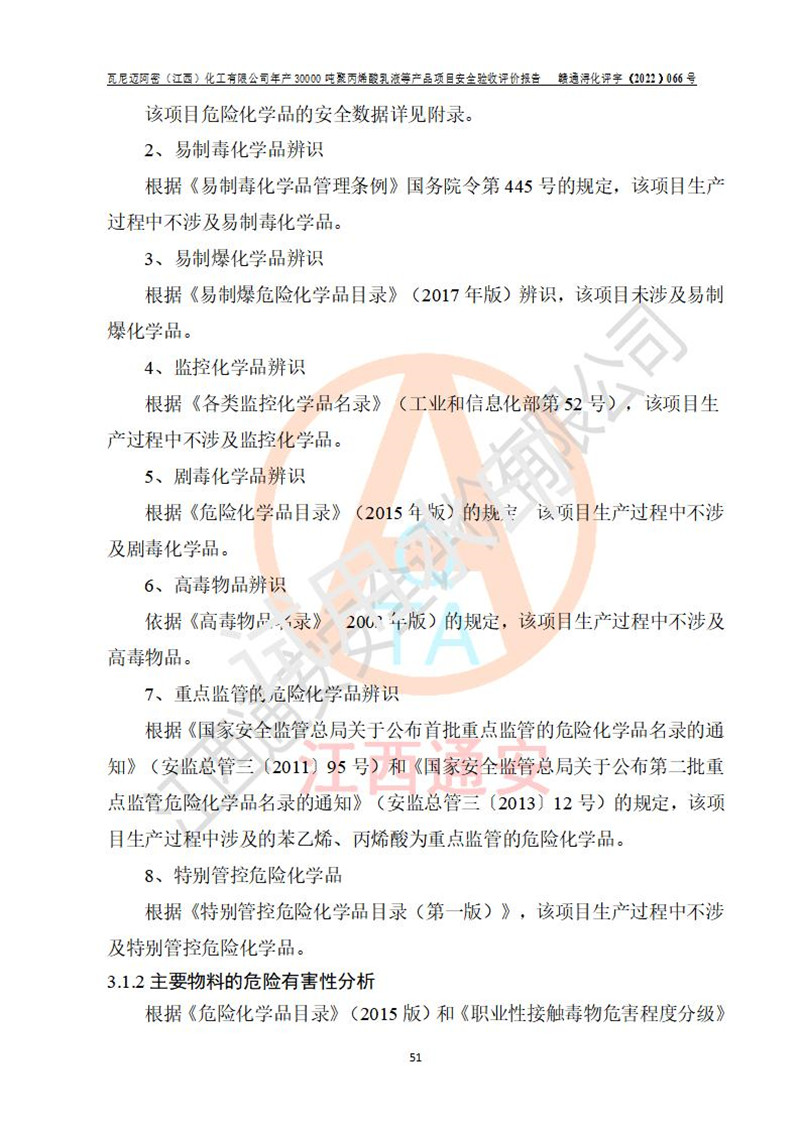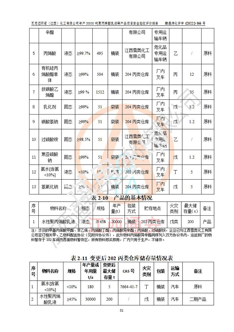 评价报告名称 | 瓦尼迈阿密(江西)化工有限公司年产30000吨聚丙烯酸乳液等产品项目安全验收评价报告 | |||||||