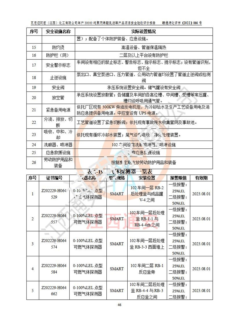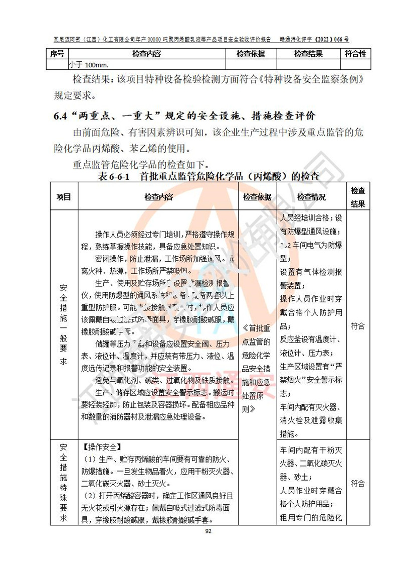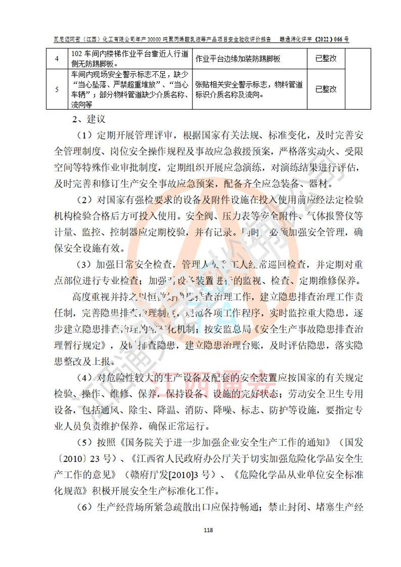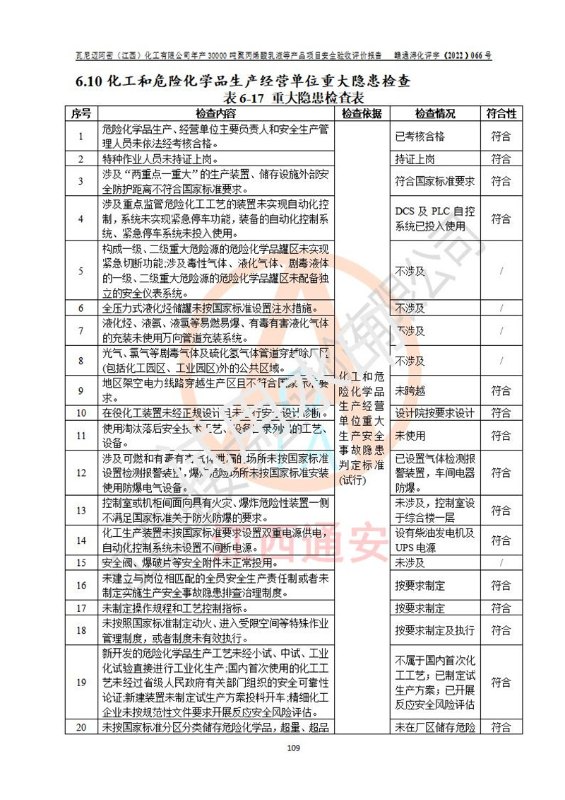 评价结论 | 经评价组评价,瓦尼迈阿密(江西)化工有限公司年产30000吨聚丙烯酸乳液等产品项目现场总体布局、设备布置、自控系统情况与安全设计变更图纸一致;企业在役装置涉及重点监管危险化学品,相关自控系统配置与安全设计变更相符并正常投用;企业主要负责人、安全负责人均不属于新入职,企业主要负责人及安全负责人已取得危险化学品生产企业主要负责人及安全管理人员考核合格证,符合三年专项整治要求。 瓦尼迈阿密(江西)化工有限公司年产30000吨聚丙烯酸乳液等产品项目配套安全装置、防护设施以及采取的安全技术措施及安全管理措施符合**有关法规、标准、规范要求,在落实本评价报告有关对策措施后,项目风险可控,其安全生产条件和安全管理方面具备竣工安全验收的条件。 | |||||||