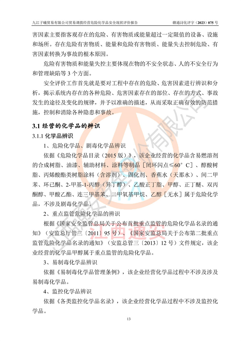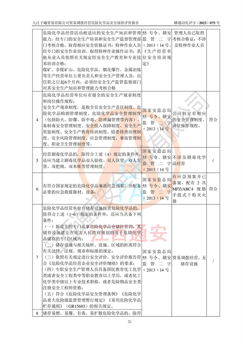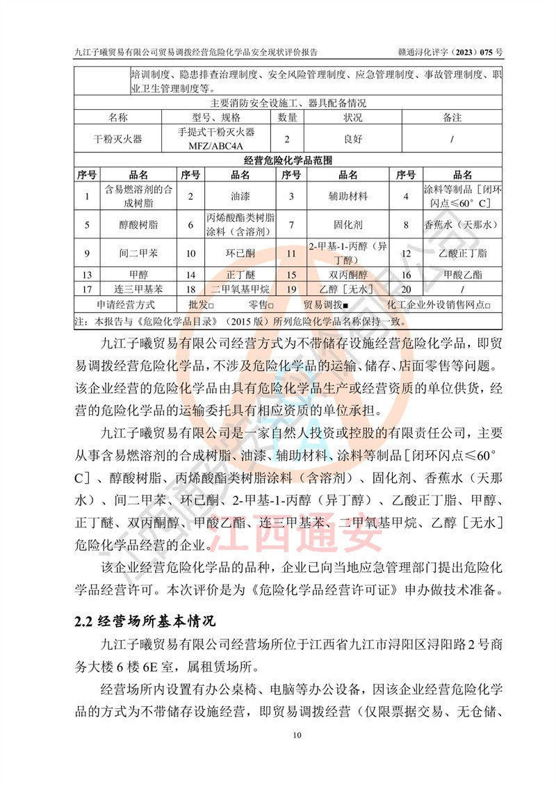 评价结论 | 九江子曦贸易有限公司贸易调拨经营危险化学品的安全条件符合**有关法规、标准、规范要求,落实评价报告有关建议后,风险可控,具备危险化学品经营安全条件。 | |||