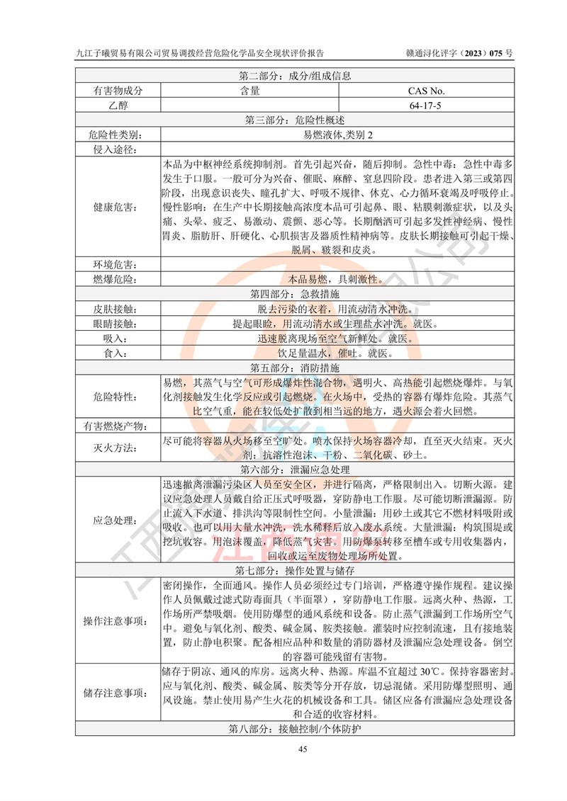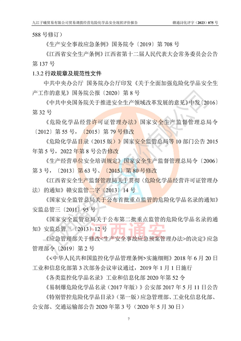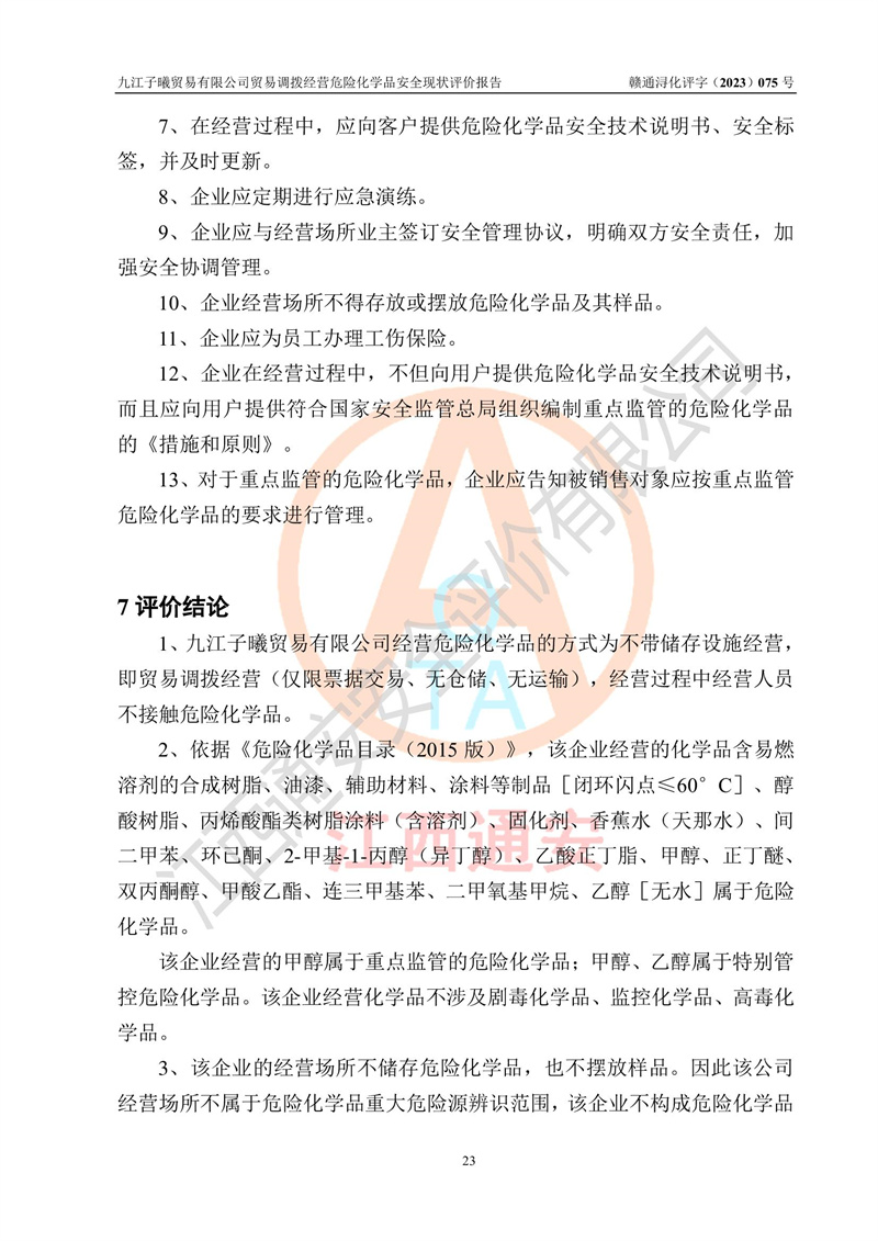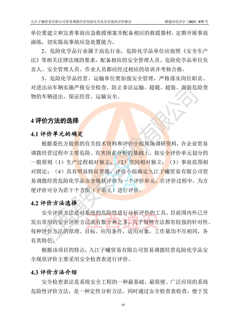 评价结论 | 九江子曦贸易有限公司贸易调拨经营危险化学品的安全条件符合**有关法规、标准、规范要求,落实评价报告有关建议后,风险可控,具备危险化学品经营安全条件。 | |||