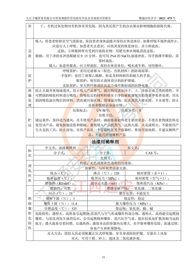 项目简介 | 九江子曦贸易有限公司是一家从事**化学产品销售等业务的公司,成立于2023年05月25日,注册资本30万元,法定**人刘希,经营场所位于江西省九江市浔阳区浔阳路2号商务大楼6层6E-1室,属租赁场所。该企业经营方式为不带储存设施经营危险化学品,即贸易调拨经营危险化学品,企业不涉及危险化学品的运输、储存、店面零售、经营场所样品摆放。 该企业经营的含易燃溶剂的合成树脂、油漆、辅助材料、涂料等制品[闭环闪点≤60°C]、醇酸树脂、丙烯酸酯类树脂涂料(含溶剂)、固化剂、香蕉水(天那水)、间二甲苯、环已酮、2-甲基-1-丙醇(异丁醇)、乙酸正丁脂、甲醇、正丁醚、双**醇、甲酸乙酯、连**基苯、二甲氧基甲烷、乙醇[无水]属于危险化学品。 | |||