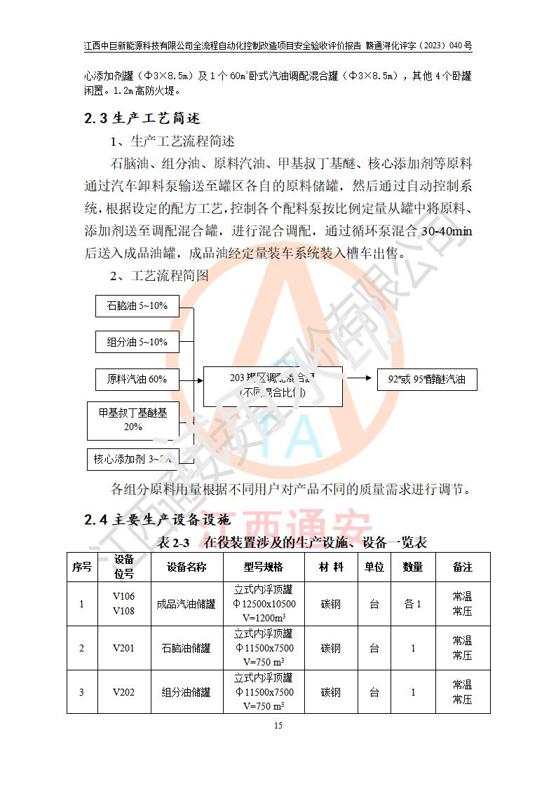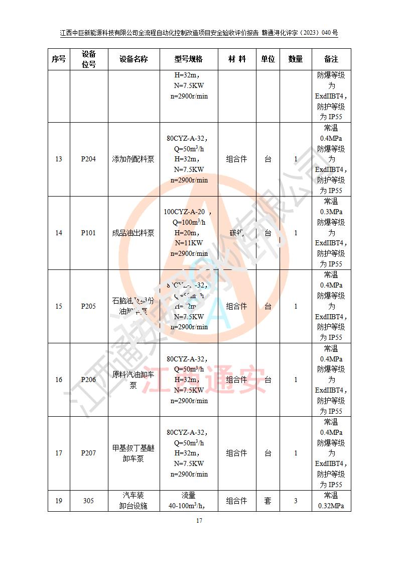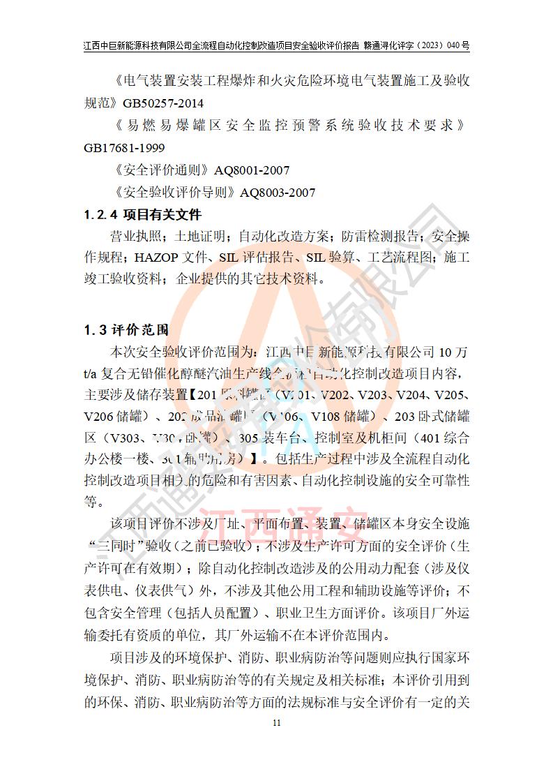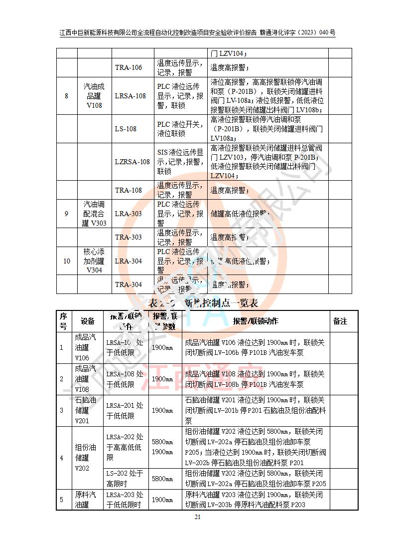 评价结论 | 江西中巨新能源科技有限公司10万t/a复合无铅催化醇醚汽油生产线全流程自动化控制改造项目自控设施生产现场情况与安全设计图纸一致(资质单位设计),按设计要求,完善了PLC、SIS、GDS系统。项目选择的仪表设备设施的安全可靠性能达到赣应急字〔2021〕190 号文件等**法规、标准规定要求。 项目风险可控,其安全生产条件和安全管理方面具备竣工安全验收的条件。 | |||||