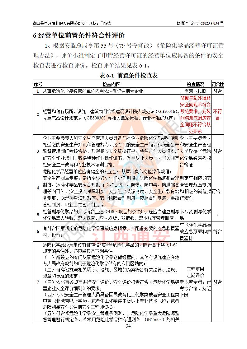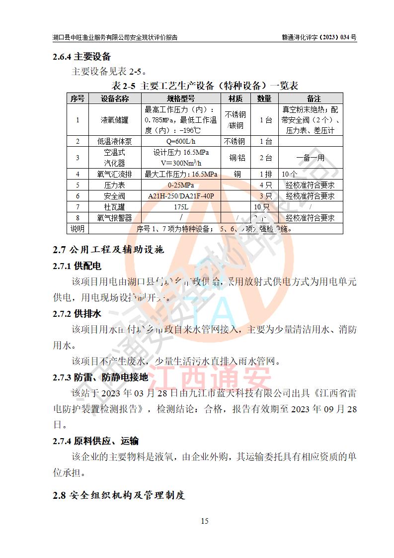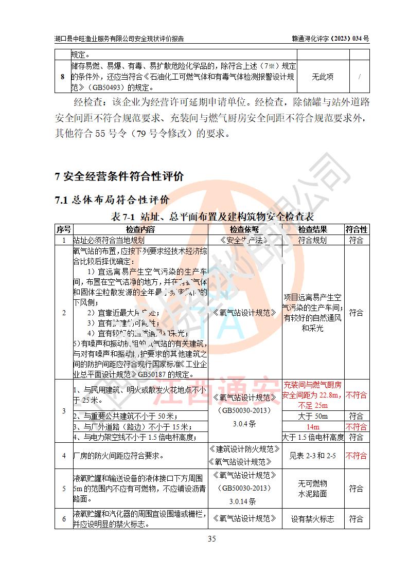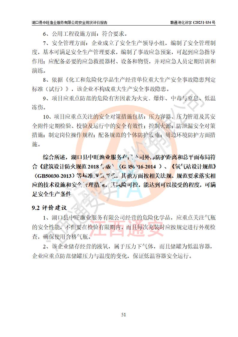 评价结论 | 湖口县中旺渔业服务有限公司外部防护距离和总平面布局符合《建筑设计防火规范2018年版》(GB50016-2014 )、《氧气站设计规范》(GB50030-2013)等标准规范要求,其他方面按相关法规、规范要求落实相应的技术设施和安全管理措施,其风险可控,能达到可以接受的程度,可满足安全生产条件。 | |||