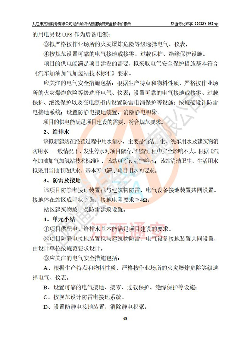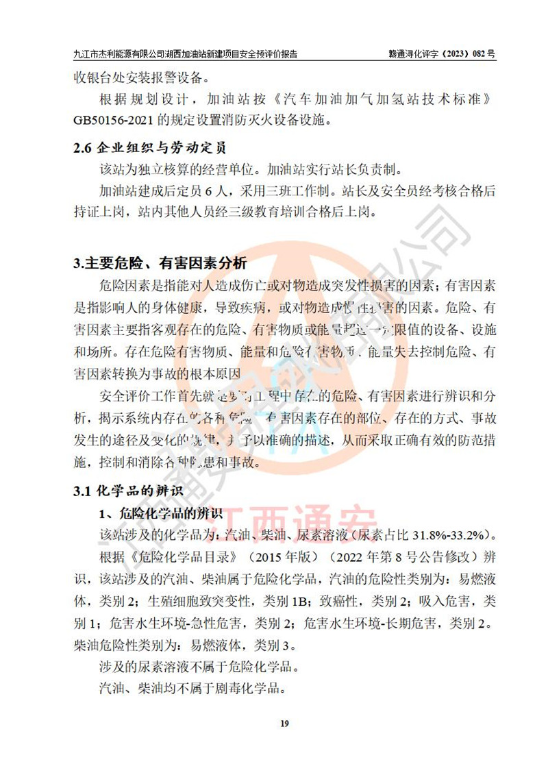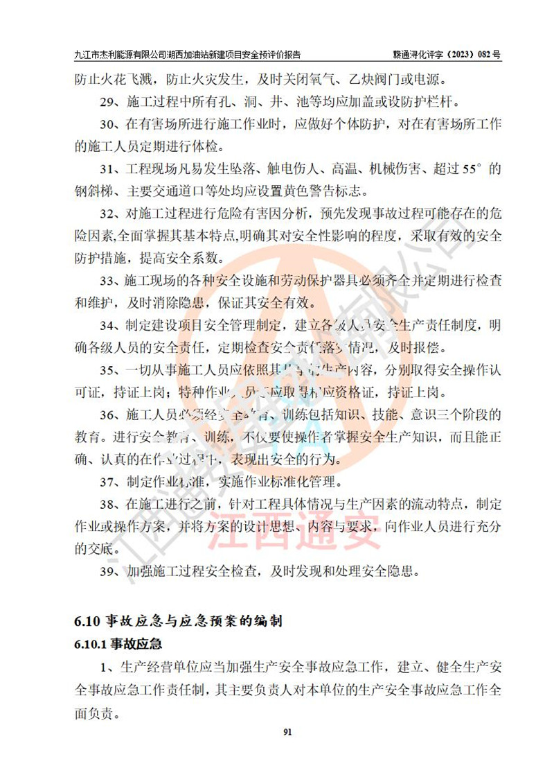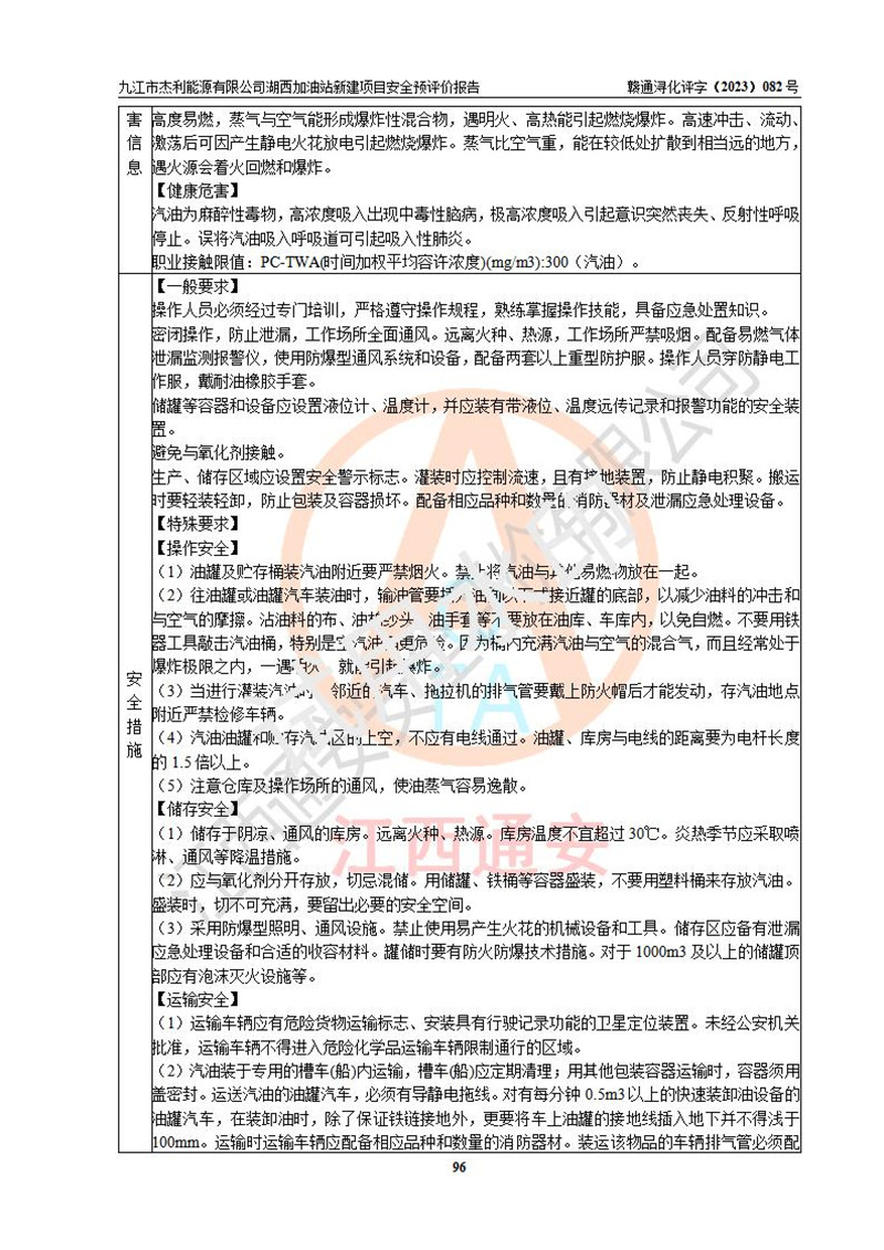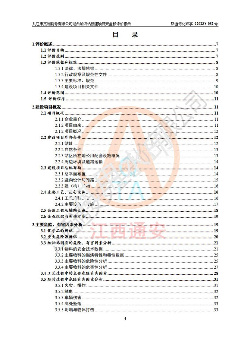 评价结论 | 九江市杰利能源有限公司湖西加油站新建项目的选址、自然条件适宜该项目工程的建设;项目规划设计中的总体布局方案可行,符合有关法规、标准要求;项目选择的工艺过程及设备设施的安全可靠性能达到**法规、标准规定要求;项目存在的危险有害因素可控,在落实项目建设方案及评价报告提出的有关安全对策措施后,其危险有害程度能达到可以接受的程度,项目建设能够实现安全运行的目标。 | |||