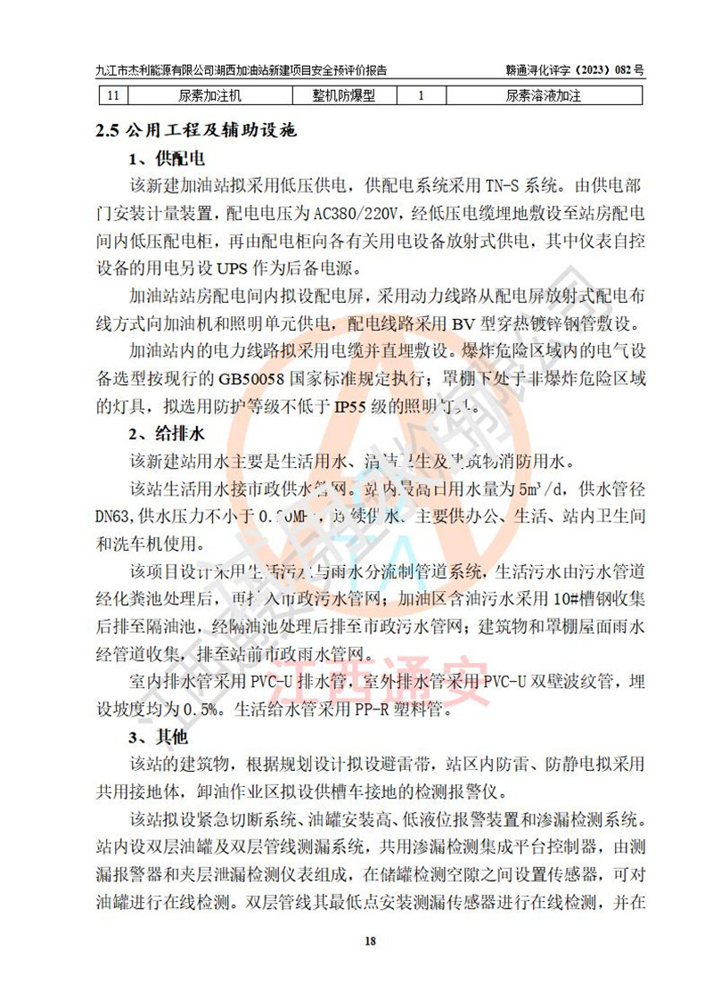 项目简介 | 九江市杰利能源有限公司于2023年03月09日取得营业执照,注册地址位于江西省九江市彭泽县马当镇杨柳村与湖西村交界处,经营范围:成品油批发(不含危险化学品),食品销售,餐饮服务等等(除依法经批准的项目外,凭营业执照依法自主开展经营活动)。依据江西省商务厅文件(赣商务办运行字【2017】1号),在九江市彭泽县马当镇杨柳村与湖西村交界处新建一座二级加油站(站名为湖西加油站)。 该项目已取得备案通知书,项目统一代码为2111-360430-04-01-213892,该项目的建设用地已取得彭泽县自然资源局颁发的不动产权证书:赣(2021)彭泽县不动产权第0010108号。 拟新建加油站总用地面积为7200m2,站内拟设2台4枪和4台双枪潜油泵加油机及配套的工艺管线,拟设SF油品储罐4台,其中40m3的0#柴油储罐1台、40m3的92#汽油储罐1台、50m3的0#柴油储罐1台、50m3的95#汽油和0#柴油储罐1台(从中隔断,汽油和柴油各25m3),油罐总容积为180m3(折算成汽油容积为122.5m3),按现行的《汽车加油加气加氢站技术标准》对加油站的等级划分,属二级加油站。 | |||