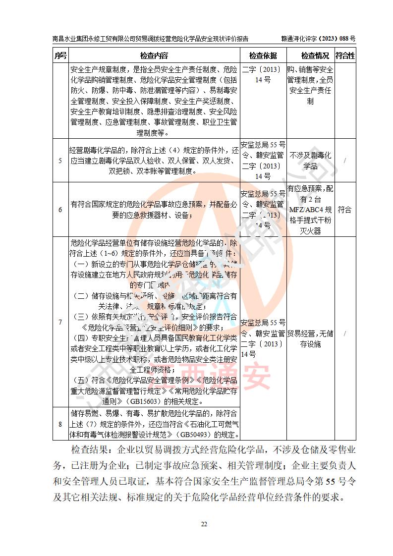 评价结论 | 南昌水业集团永修工贸有限公司贸易调拨经营危险化学品的安全条件符合**有关法规、标准、规范要求,具备危险化学品经营安全条件。 | |||