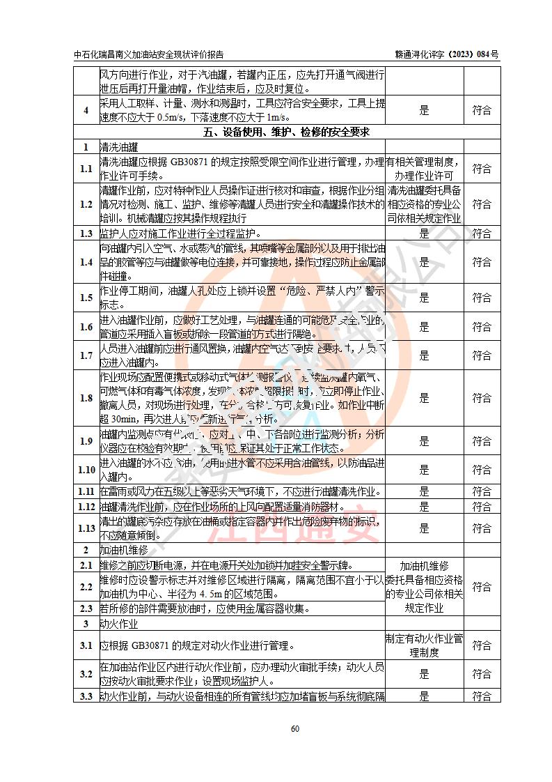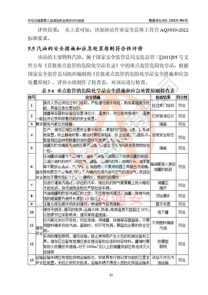 评价结论 | 中国石化销售股份有限公司江西九江瑞昌石油分公司南义加油站涉及的安全条件、安全经营条件、安全生产管理符合《危险化学品经营许可证管理办法》、《汽车加油加气加氢站技术标准》等**有关法规、标准、规范要求,能满足危险化学品经营安全条件。 | |||
