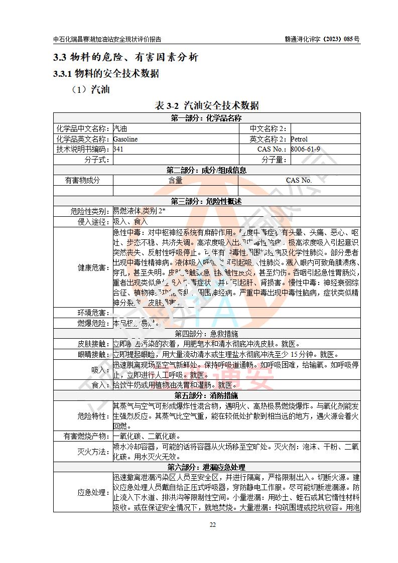 项目简介 | 中国石化销售股份有限公司江西九江瑞昌石油分公司赛湖加油站是一家专门从事成品油零售经营的有限公司分公司(外商投资企业分公司),经营场所位于江西省瑞昌市浔阳东路。现有从业人员8名,其中安全管理人员1人,加油站负责人陈小勇。 该加油站占地面积2907m2,站区内设置有6台双枪税控燃油加油机及配套的工艺管线,设有SF双层储罐5台,其中30m3的92#汽油储罐2台、30m3的95#汽油储罐1台、30m3的98#汽油储罐1台、30m3的0#柴油储罐1台,油品储罐总容积为150m3(折算成汽油为135m3),按现行《汽车加油加气加氢站技术标准》对加油站的等级划分原则,属二级加油站。 该站由九江市应急管理局换发《危险化学品经营许可证》(证号:赣九危化经字[2020]000327号),**期限2020年08月27日至2023年08月26日。 | |||