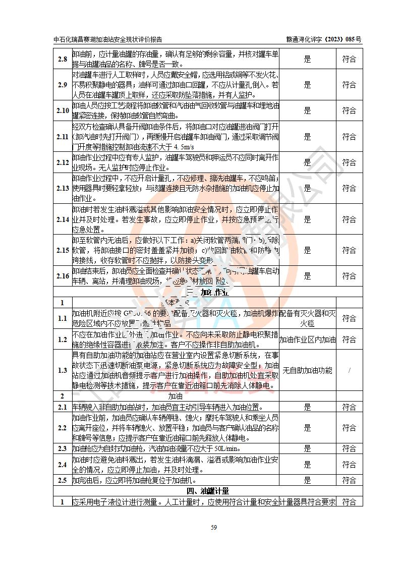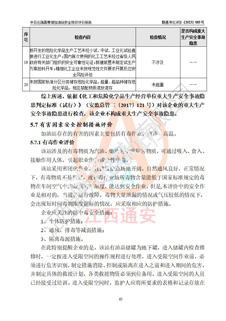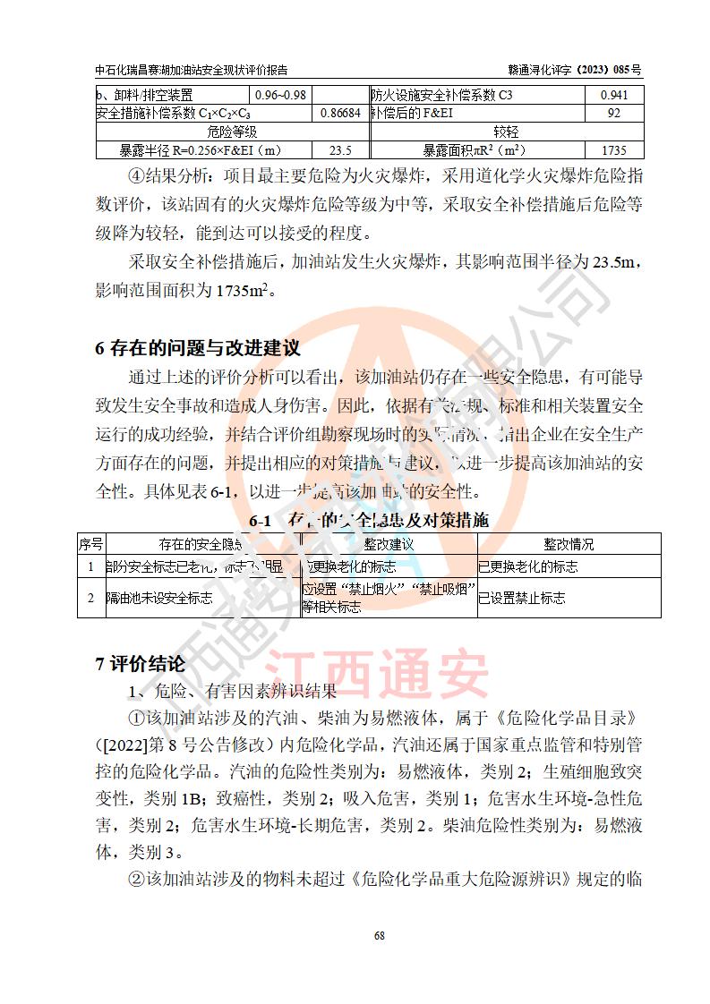 评价结论 | 中国石化销售股份有限公司江西九江瑞昌石油分公司赛湖加油站涉及的安全条件、安全经营条件、安全生产管理符合《危险化学品经营许可证管理办法》、《汽车加油加气加氢站技术标准》等**有关法规、标准、规范要求,能满足危险化学品经营安全条件。 | |||