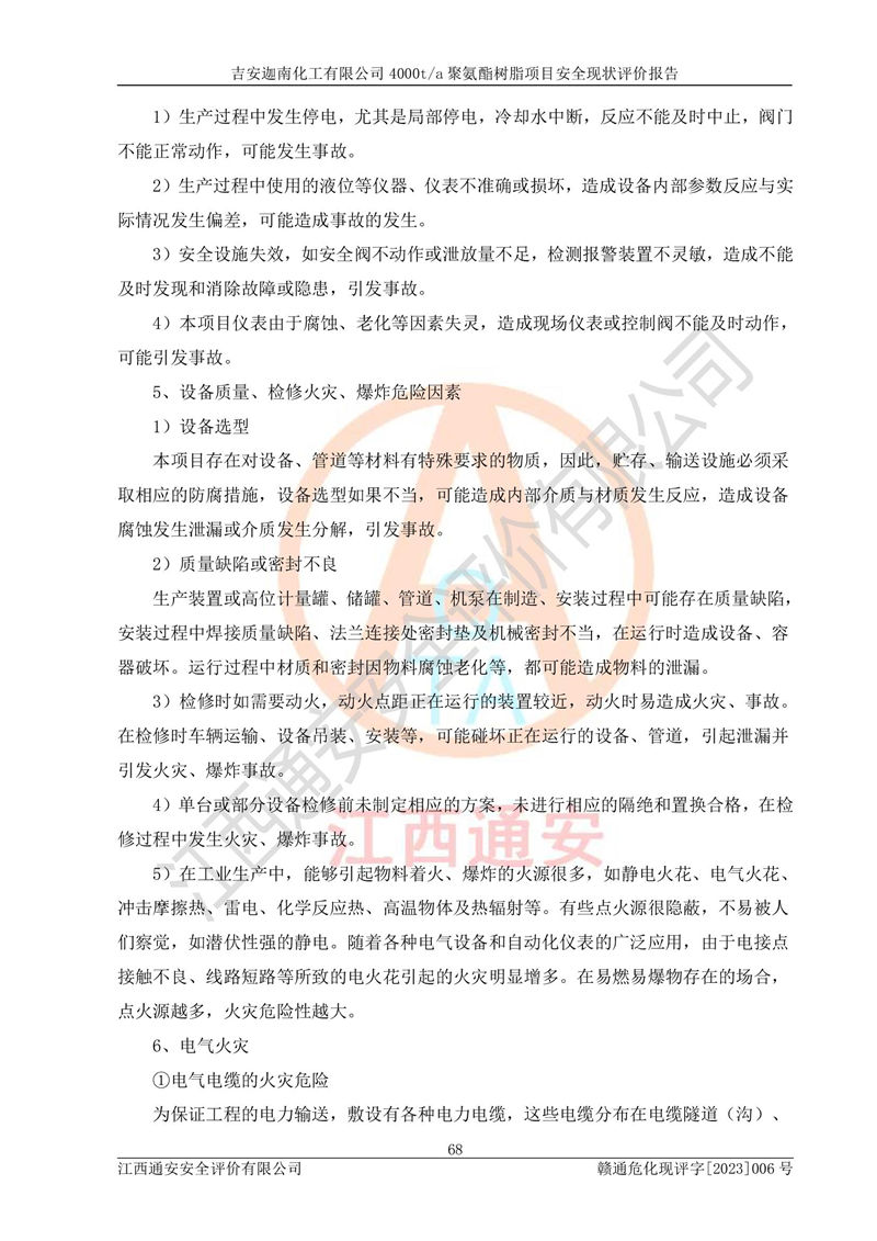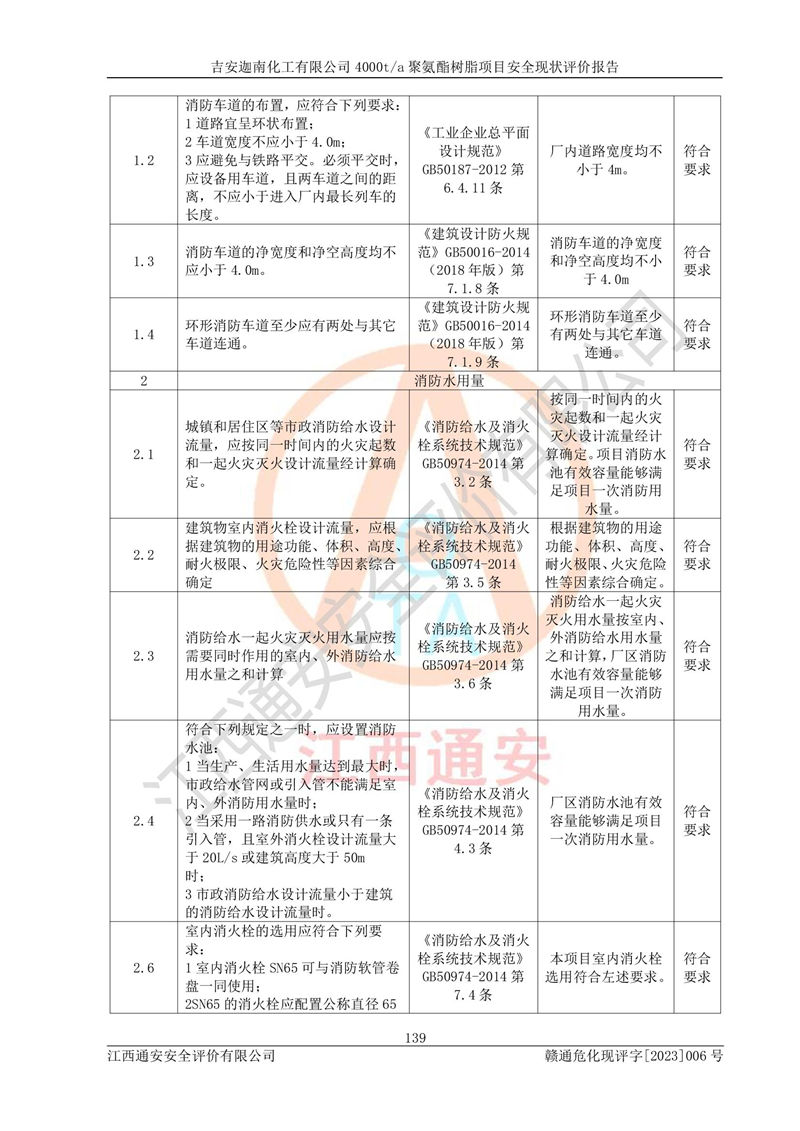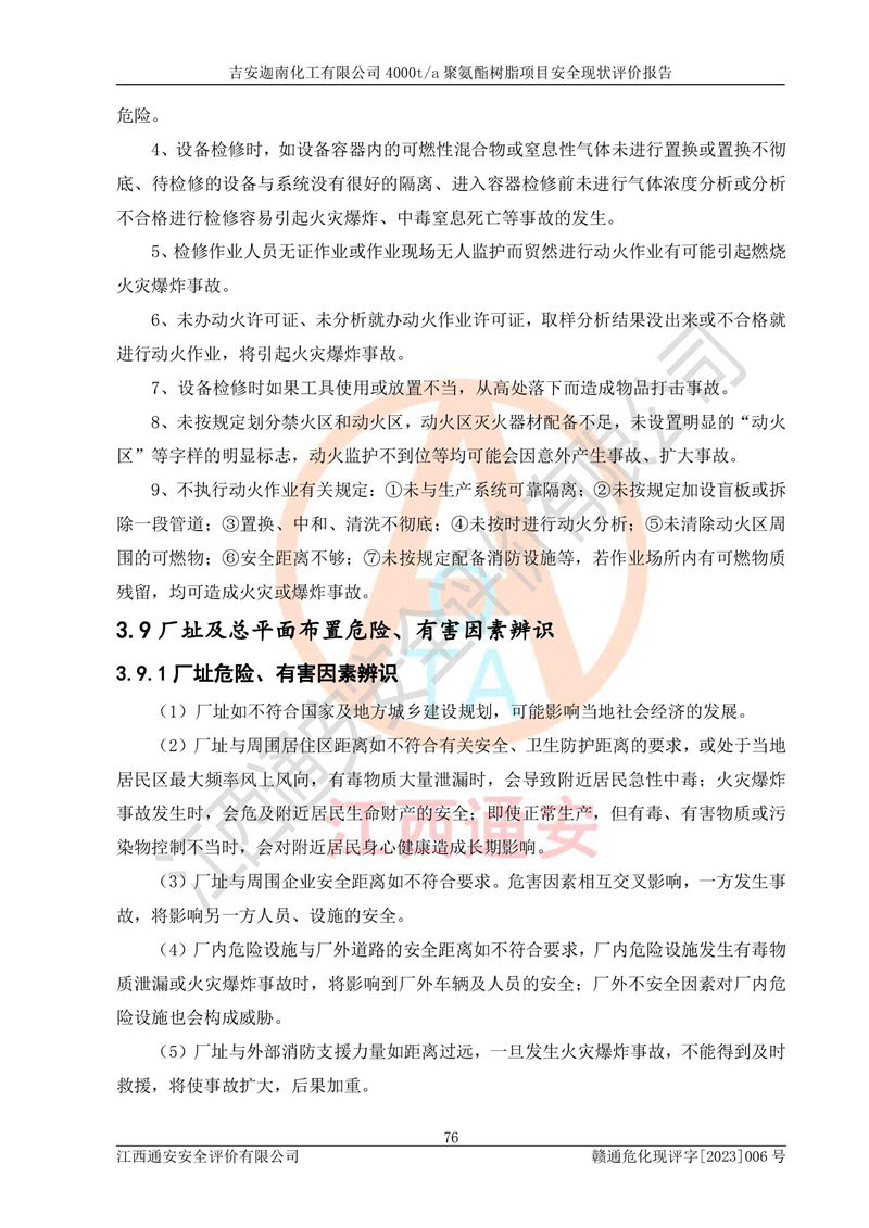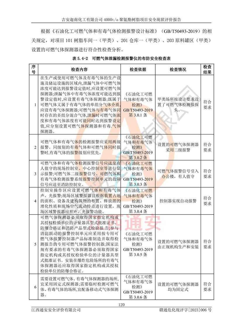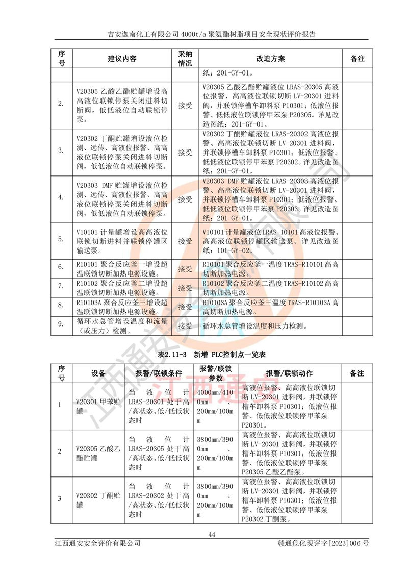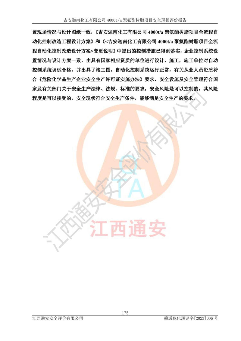 评价结论 | 本报告认为,吉安迦南化工有限公司4000t/a聚氨酯树脂项目在役生产装置现场情况与设计图纸一致,《吉安迦南化工有限公司4000t/a聚氨酯树脂项目全流程自动化控制改造工程设计方案》和《<吉安迦南化工有限公司4000t/a聚氨酯树脂项目全流程自动化控制改造设计方案>变更说明》中提出的控制措施已得到落实,企业控制系统设置情况与设计方案一致,由具有**相应资质的单位进行设计、施工,施工单位对自动控制系统调试合格,并出具了竣工图,自动化控制系统运行正常,有关从业人员资质符合《危险化学品生产企业安全生产许可证实施办法》要求,安全设施及安全管理符合**及有关部门关于安全生产法律、法规、标准的要求,安全风险是可以控制的,其风险程度是可以接受的,安全现状符合安全生产条件,能够满足安全生产的要求。 | ||||