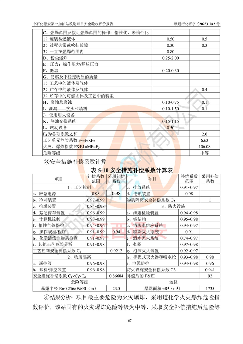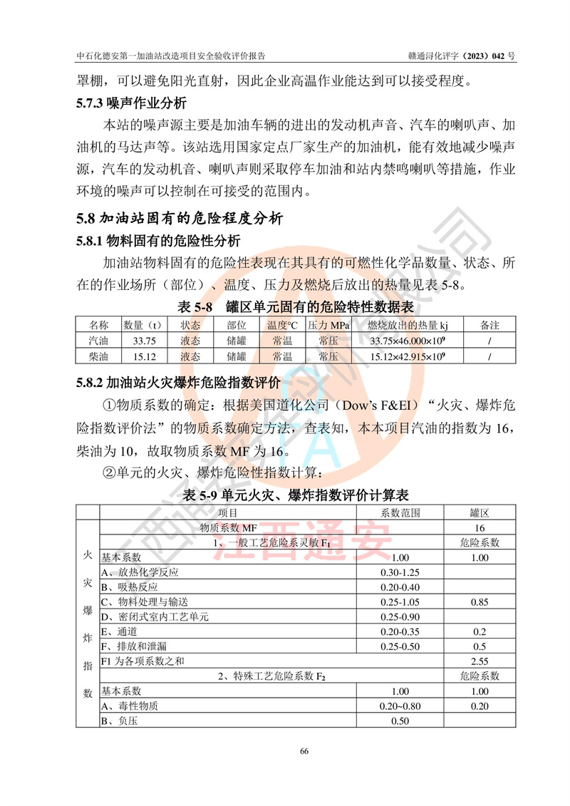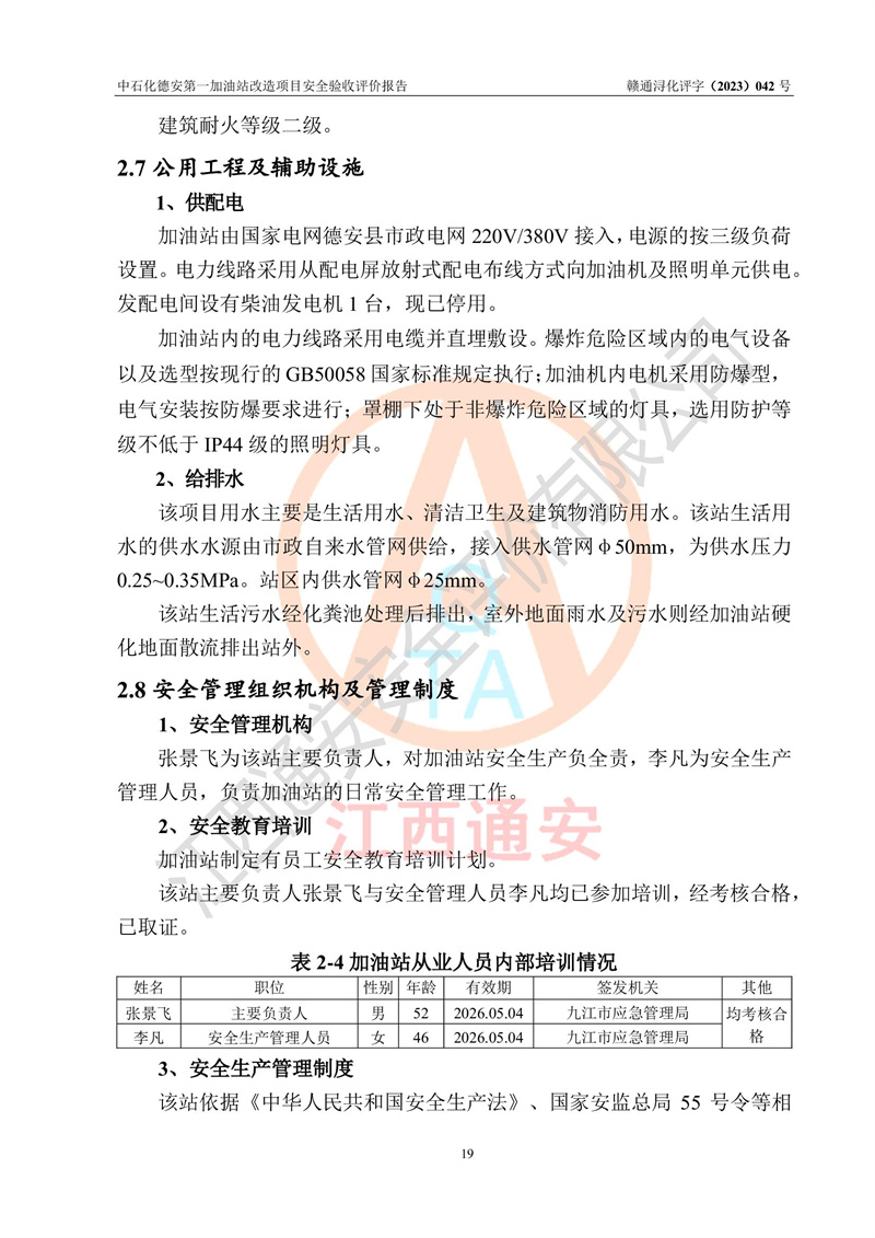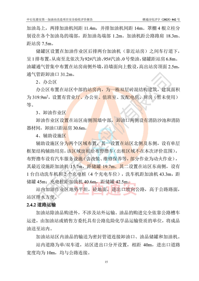 评价结论 | 中国石化销售股份有限公司江西九江德安石油分公司**加油站改造项目涉及的安全条件、安全生产条件、安全生产管理符合《危险化学品经营许可证管理办法》、《汽车加油加气加氢站技术标准》等**有关法规、标准、规范要求,能满足成品油零售经营单位的安全条件,具备项目竣工验收的条件。 | |||