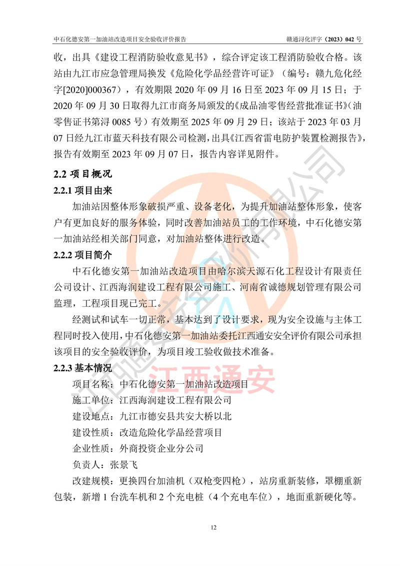 评价报告名称 | 中国石化销售股份有限公司江西九江德安石油分公司**加油站改造项目安全验收评价报告 | |||