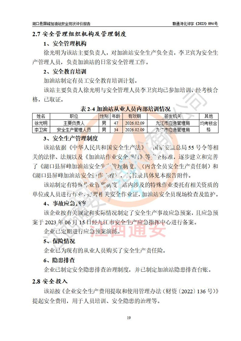 项目简介 | 湖口县屏峰加油站是一家专门从事成品油零售经营的个人独资企业,经营场所位于九江市湖口县屏峰集镇。现有从业人员3名,其中安全管理人员1人,加油站负责人徐光明。 该加油站占地面积900m2,站区内设置有2台单枪税控燃油加油机及配套的工艺管线,设有SF双层储罐2台,其中30m3的92#汽油储罐1台、30m3的0#柴油储罐1台,油品储罐总容积为60m3(折算成汽油为45m3),按现行《汽车加油加气加氢站技术标准》对加油站的等级划分原则,属三级加油站。 该站由九江市应急管理局换发《危险化学品经营许可证》(证号:赣九危化经字[2020]000347号),**期限2020年09月09日至2023年09月08日。 | |||