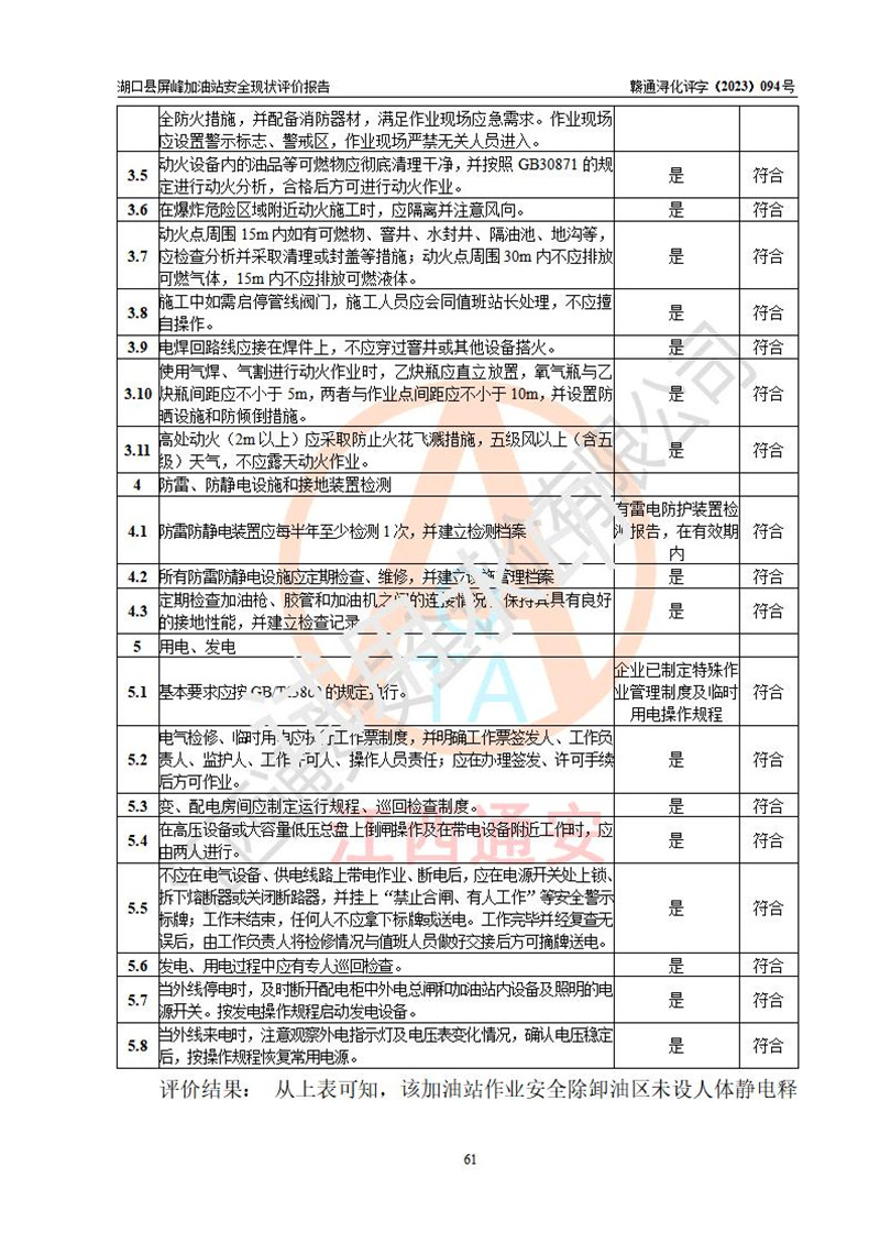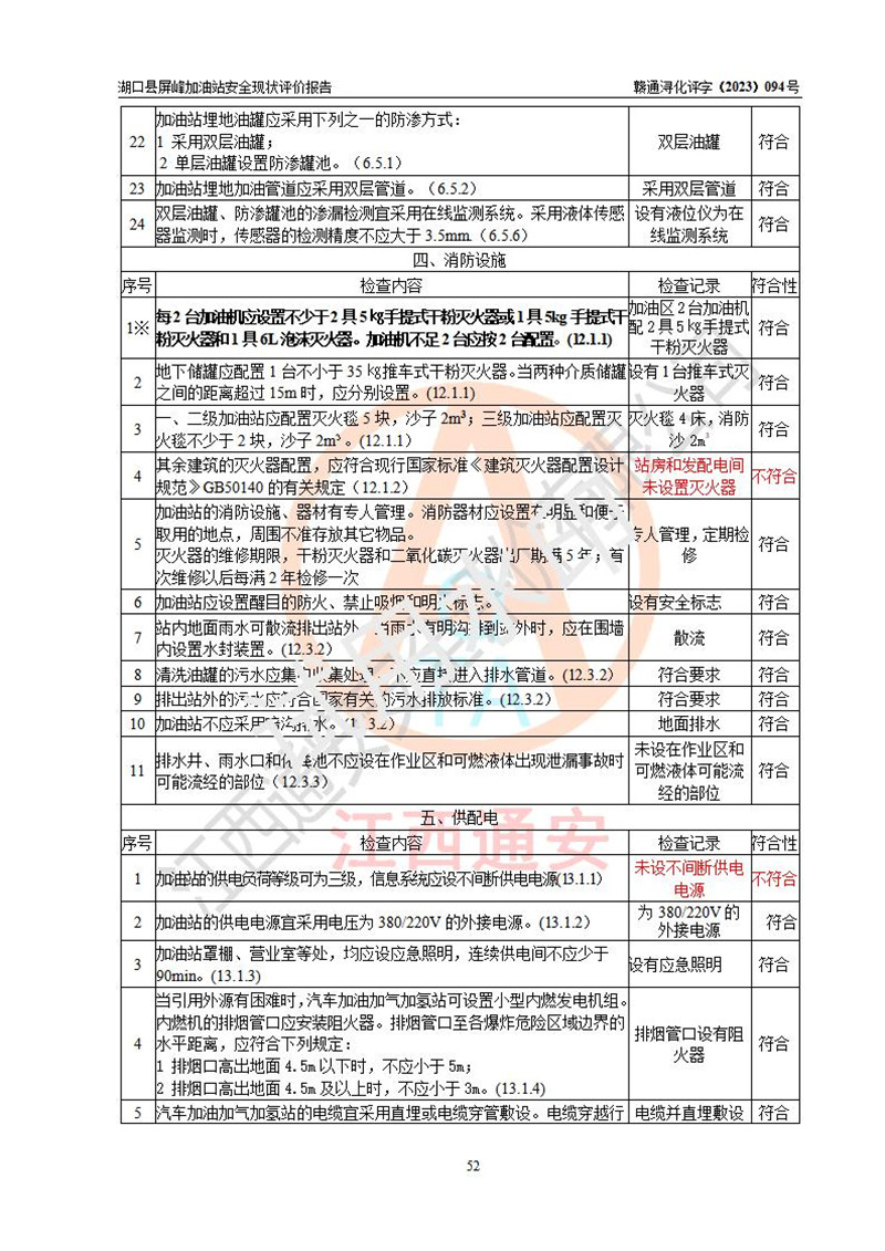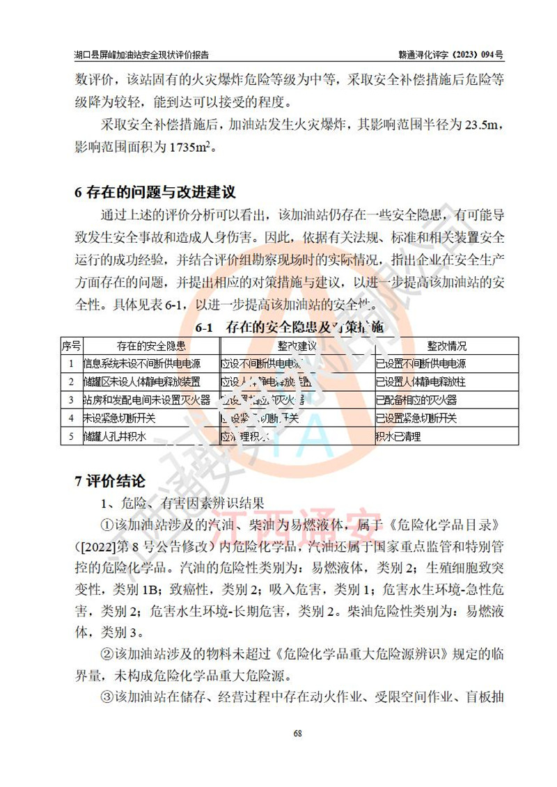 评价结论 | 湖口县屏峰加油站涉及的安全条件、安全经营条件、安全生产管理符合《危险化学品经营许可证管理办法》、《汽车加油加气加氢站技术标准》等**有关法规、标准、规范要求,能满足危险化学品经营安全条件。 | |||