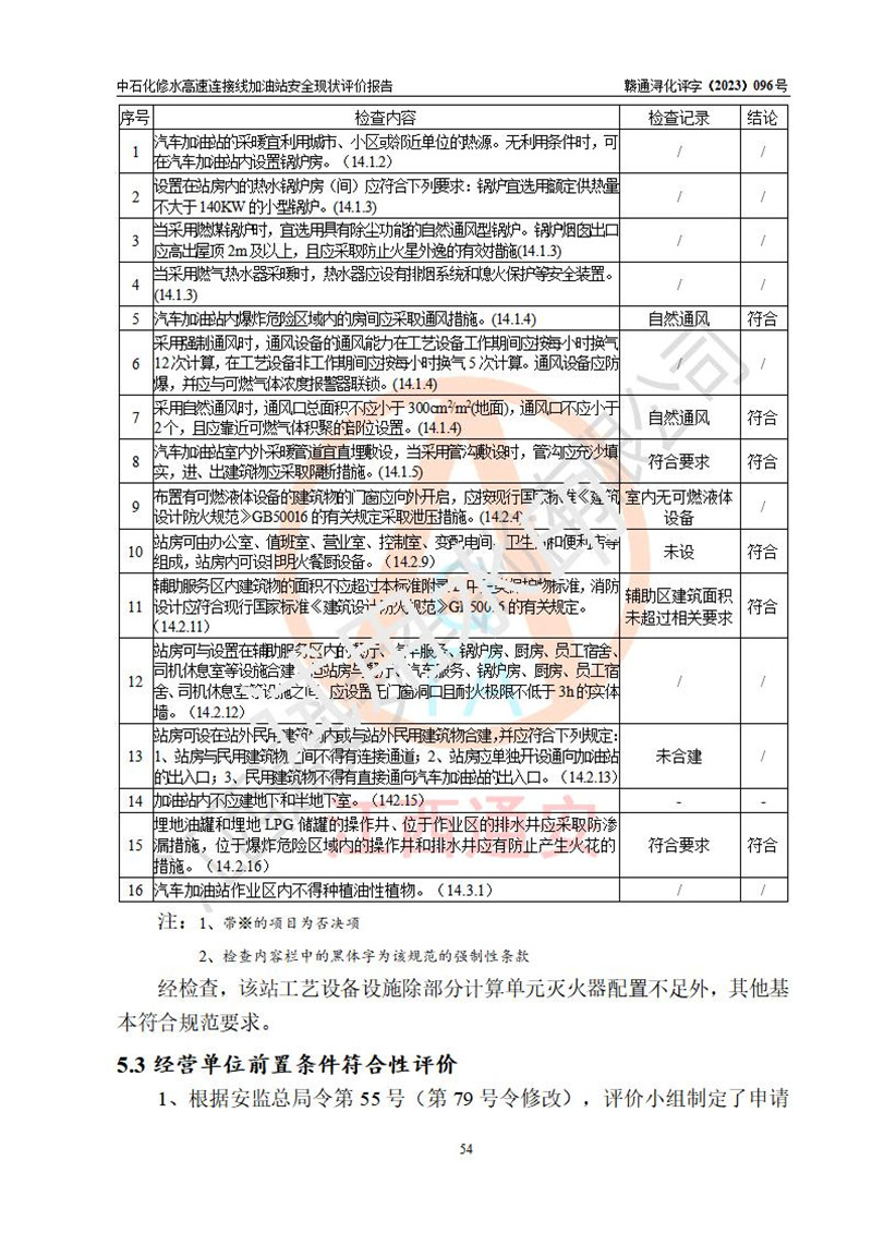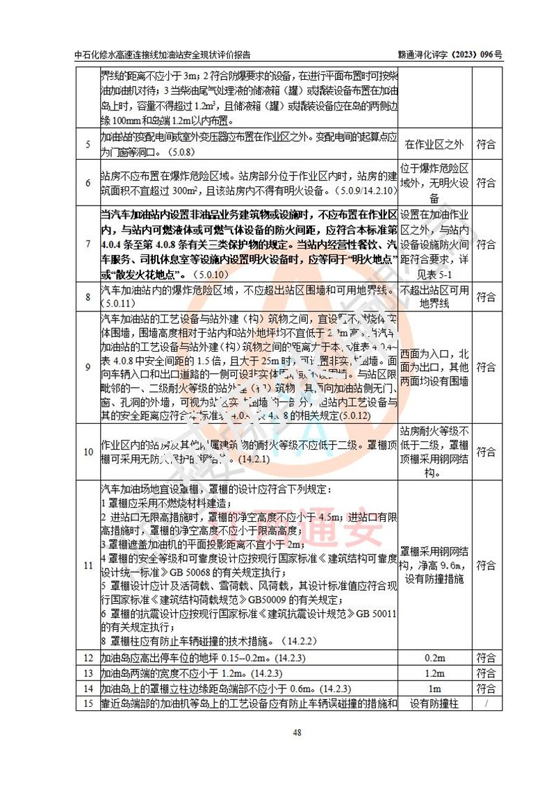 评价结论 | 中国石化销售股份有限公司江西九江修水石油分公司高速连接线加油站涉及的安全条件、安全经营条件、安全生产管理符合《危险化学品经营许可证管理办法》、《汽车加油加气加氢站技术标准》等**有关法规、标准、规范要求,能满足危险化学品经营安全条件。 | |||