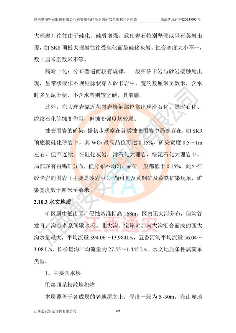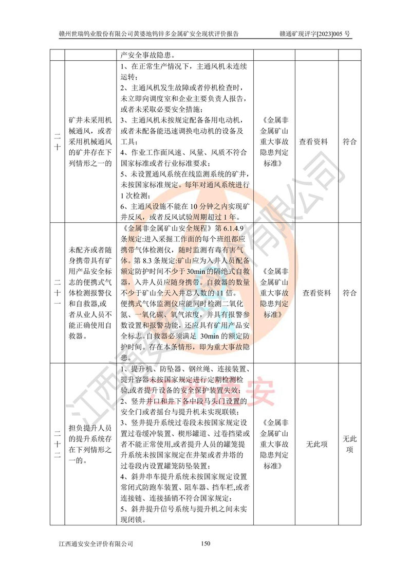 其它 | 赣州世瑞钨业股份有限公司黄婆地钨锌多金属矿设备、设施和场所符合**安全生产有关法律、法规、标准及规范的规定。通过对各单元安全检查表分析评价,矿山相关证照合法**,生产系统及辅助系统齐全可靠,现场管理较规范,建立了安全风险管控和隐患排查治理“双重预防”机制,能够满足矿山安全生产管理的要求,得分率为87.4%。赣州世瑞钨业股份有限公司黄婆地钨锌多金属矿地下开采满足安全生产条件。 | ||||