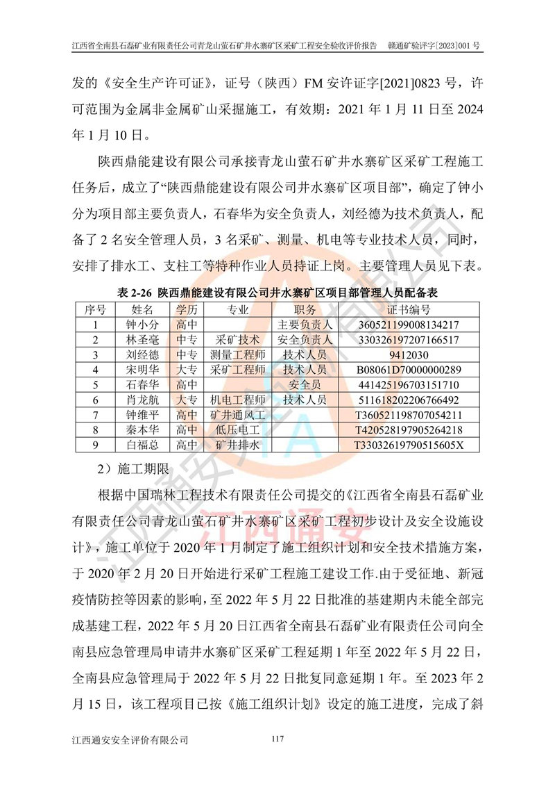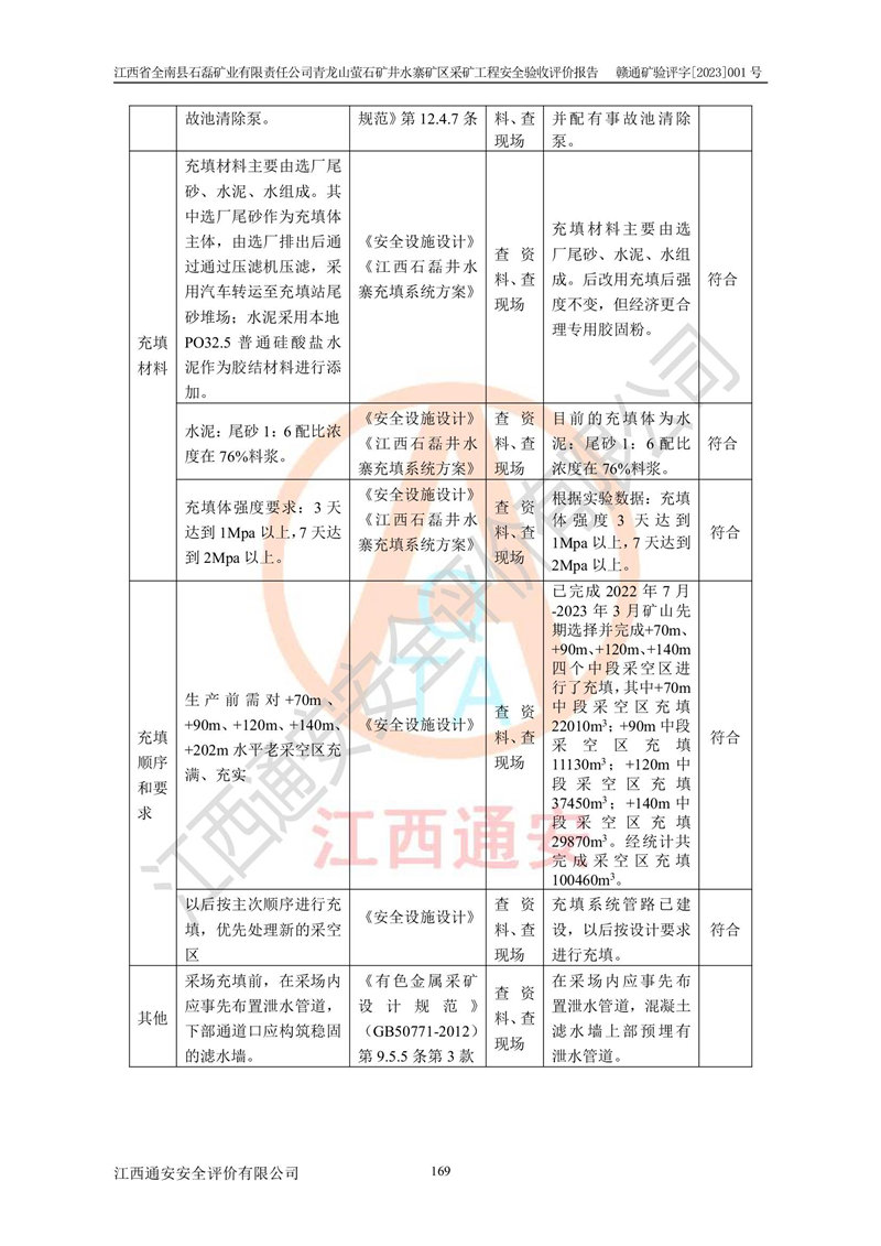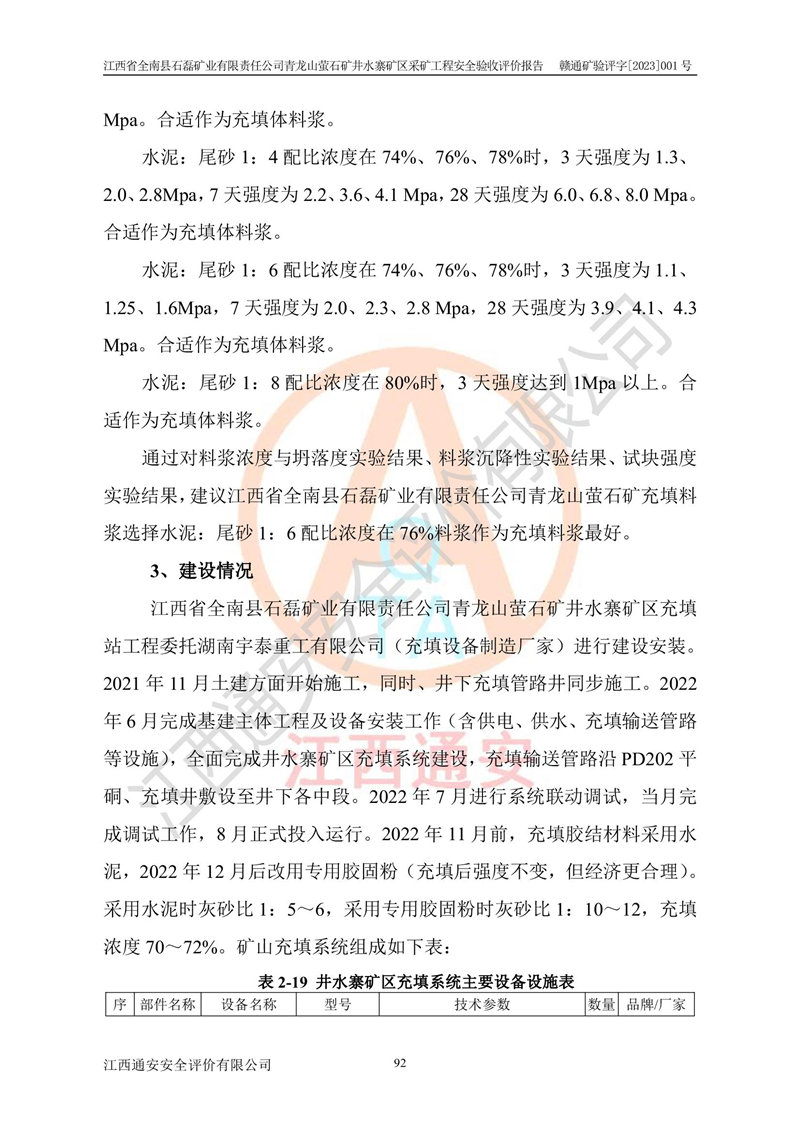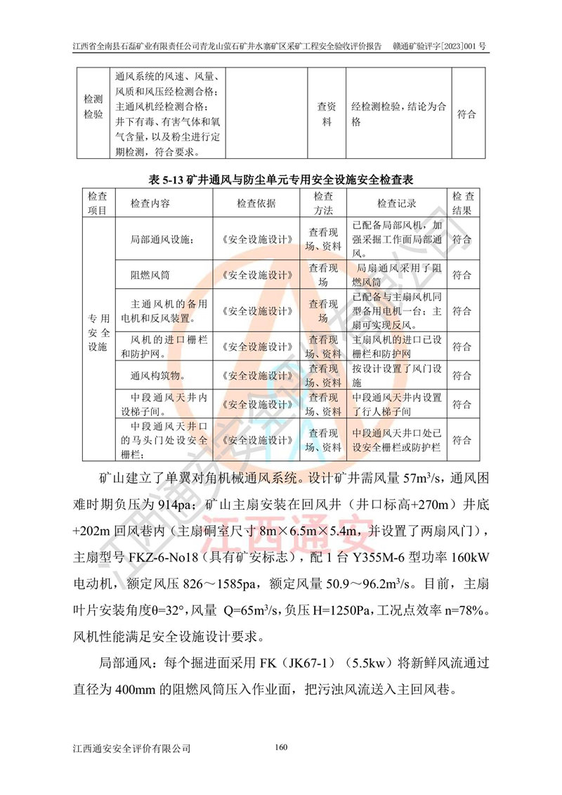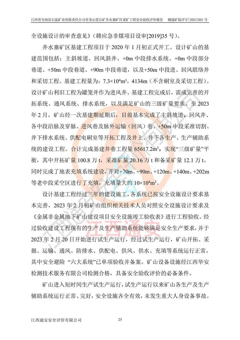 其它 | 江西省全南县石磊矿业有限责任公司青龙山萤石矿井水寨矿区采矿工程项目建设由陕西鼎能建设有限公司组织施工,矿山自行监理,施工建设和试生产运行以来,能够按照地下矿山安全设施“三同时”的要求开展各项工作,对试运行过程中发现的安全管理、生产技术和设备设施问题进行了整改,安全设施和措施符合安全设施设计要求并整体**、运行正常;安全设施经检测检验结论为合格,矿山安全生产组织机构健全,制订的各项安全生产责任制、安全管理制度和安全技术操作规程比较**,并能在生产过程中得到**遵守和实施。对照《金属非金属地下矿山建设项目安全设施竣工验收表》进行查找江西省全南县石磊矿业有限责任公司青龙山萤石矿井水寨矿区采矿工程建设项目竣工验收项目中,否决项的检查结论均为“符合”,检查项共110项,一般项不合格4项,在验收检查项总数中占比<5%。 综上所述,江西省全南县石磊矿业有限责任公司青龙山萤石矿井水寨矿区采矿工程建设项目安全设施符合《全南县石磊矿业有限责任公司青龙山萤石矿井水寨矿区采矿工程安全设施设计》及**有关法律法规、标准、规章、规范的规定要求,具备安全设施验收的条件。 | ||||