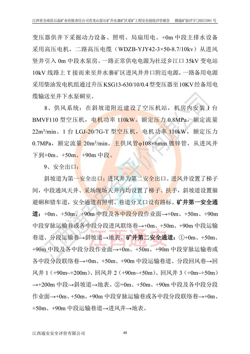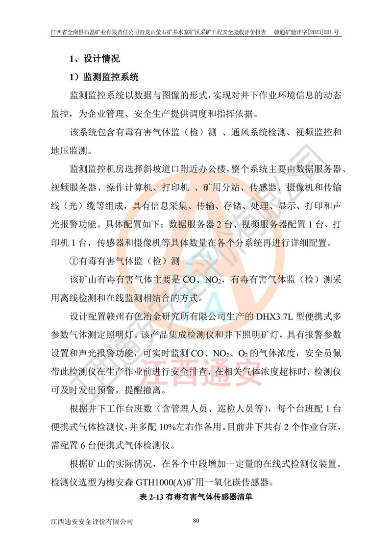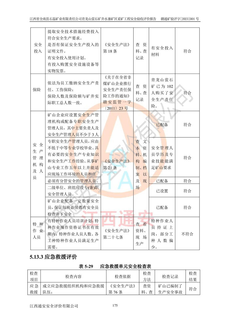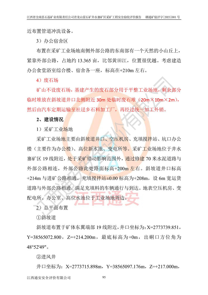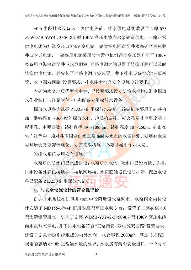 其它 | 江西省全南县石磊矿业有限责任公司青龙山萤石矿井水寨矿区采矿工程项目建设由陕西鼎能建设有限公司组织施工,矿山自行监理,施工建设和试生产运行以来,能够按照地下矿山安全设施“三同时”的要求开展各项工作,对试运行过程中发现的安全管理、生产技术和设备设施问题进行了整改,安全设施和措施符合安全设施设计要求并整体**、运行正常;安全设施经检测检验结论为合格,矿山安全生产组织机构健全,制订的各项安全生产责任制、安全管理制度和安全技术操作规程比较**,并能在生产过程中得到**遵守和实施。对照《金属非金属地下矿山建设项目安全设施竣工验收表》进行查找江西省全南县石磊矿业有限责任公司青龙山萤石矿井水寨矿区采矿工程建设项目竣工验收项目中,否决项的检查结论均为“符合”,检查项共110项,一般项不合格4项,在验收检查项总数中占比<5%。 综上所述,江西省全南县石磊矿业有限责任公司青龙山萤石矿井水寨矿区采矿工程建设项目安全设施符合《全南县石磊矿业有限责任公司青龙山萤石矿井水寨矿区采矿工程安全设施设计》及**有关法律法规、标准、规章、规范的规定要求,具备安全设施验收的条件。 | ||||