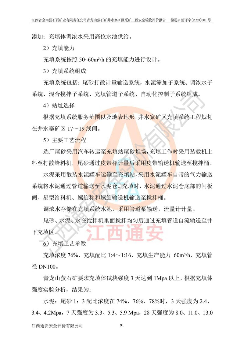 项目简介 | 江西省全南县石磊矿业有限责任公司青龙山萤石矿矿区位于全南县城北北东20°直距约36km处,行政区划隶属全南县社迳乡和陂头镇管辖,矿区地理坐标:东经114°36′52″~114°37′52″,北纬25°03′16″~25°04′10″,矿区面积:1.4007km²。矿区交通以公路为主,全南县城~陂头镇~社迳乡县乡级公路从矿区通过,北东至京九铁路铁石口站直线距离31km,至南龙高速公路崇仙段直线距离20km,交通便利。 江西省全南县石磊矿业有限责任公司于2017年1月4日取得了全南县市场和质量监督管理局换发的《营业执照》,统一社会信用代码91360729741962565R,企业性质为有限责任公司(自然人投资或控股),法定**人为杨赋斌,注册资本:柒仟陆佰万元整,经营范围:萤石矿开采、加工精选、收购、销售。**期至2025年10月30日。 江西省全南县石磊矿业有限责任公司于2021年4月30日取得江西省自然资源厅换发的采矿许可证(证号:C3600002011016120104186),矿山名称:全南县石磊矿业有限责任公司青龙山萤石矿,开采矿种为萤石(普通),开采方式为地下开采,生产规模6.0万吨/年,矿区面积1.4007km2,**期自2021年4月10日至2023年5月10日,矿区范围有7个拐点坐标圈定,开采深度+400m至0m标高。 青龙山萤石矿由青龙山矿区和井水寨矿区组成,本次采矿工程验收评价为青龙山萤石矿井水寨矿区。 矿山自上世纪90年代开始就断续有人开采过萤石,除露采外,主要是对V1、V2、V5号矿体进行了较大规模的开采,由于开采秩序混乱,2002年全南县对青龙山萤石矿进行整治,并作为县招商引资项目,将青龙山萤石资源整合后由全南县石磊矿业有限责任公司进行开采经营。 2003年7月由赣州市地质队对全南县青龙山萤石矿区(东段)进行了普查工作,完成了《江西省全南县青龙山萤石矿区(东段)资源储量普查报告》。2006年南方冶金学院编制了划定矿区范围(现采矿证范围)的《江西省全南县青龙山萤石矿矿产资源开发利用方案》,并于当年8月取得新采矿许可证。2007年初青龙山矿区恢复生产,而井水寨矿区处于停产状态。 井水寨矿区2002年之前有过较大规模的民采,全南县石磊矿业有限责任公司接管后,进行过小规模开采。为了规范采矿,2008年矿山委托江西省冶金设计院进行了《井水寨矿区技术改造工程设计和安全设施设计》,该《设计》于2009年8月25日由江西省安全生产监督管理局组织专家审查通过,并于9月21日取得了江西省安全生产监督管理局下发的审查意见书(赣安监非煤项目设审[2009]071号文)。原设计采用平硐+盲斜井、竖井开拓,基建期为2年。在此后的基建过程中,因萤石市场疲软,公司经济效益差,造成基建进度缓慢,并先后进行过四次项目建设延期,未能完成基建。2018年,随着萤石价格的回升,企业决定继续进行井水寨的基建。但由于原设计已过近10年,相关法律法规及规范要求做了较大的调整和修改,原设计不能作为现在的基建依据,经与相关部门沟通,同意重新进行设计。为此,江西省全南石磊矿业有限责任公司重新履行井水寨矿区安全设施“三同时”手续。 2017年6月,矿山委托江西省地质矿产勘查开发局赣南地质调查大队编制了《江西省全南县井水寨矿区萤石矿资源储量核实报告》,2019年2月江西省全南石磊矿业有限责任公司委托江西省冶金设计院有限责任公司完成《江西省全南县石磊矿业有限责任公司青龙山萤石矿井水寨矿区地下开采工程可行性研究报告》;2019年3月,矿山委托赣州永安安全生产科技服务有限公司编制了《江西省全南县石磊矿业有限责任公司青龙山萤石矿井水寨地下开采工程安全预评价报告》;2019年9月,矿山委托中国瑞林工程技术股份有限公司编制了《全南县石磊矿业有限责任公司青龙山萤石矿井水寨矿区采矿工程初步设计和安全设施设计》(以下简称《安全设施设计》)主要设计内容有:年生产规模19.8万吨,基建2.5年,设计开采范围为井水寨矿区13~17线+0m~+200m标高之间;由于主要矿体位于河床底下影响范围内,故采矿方法采用胶结充填法,即上向水平分层充填采矿法和浅孔留矿嗣后充填采矿法,同时对河床底下50m范围内仍预留了保安矿柱;开拓运输系统采用斜坡道开拓,无轨运输,共设有+0m、+50m、+90m、+140m、+200m(回风)等中段,其中+140m中段主要为残矿开采,设计对该中段矿量仅作排产计入,不进行专门详细的设计,具体的残矿开采由委托专门研究机构进行设计;各中段矿石、废石、人员和设备均从斜坡道进出。设计采用分层充填法开采,考虑到现有矿体的完整性以及中段资源量,总体上采用了从下至上开采顺序,首采中段为+50m中段,当上部矿体采完后,开采+0m中段。通风系统采用单翼对角抽出式通风,新风由斜坡道、进风井进入,经中段巷道、进风联络井、分段巷道、工作面、回风联络井、上中段回风巷道、回风斜井,由主房抽出地表;排水系统为0m中段集中排水;矿山供电电源引自全南县社迳乡江口35kV变电站的一回路架空线进入矿区;原罐笼井改作为进风井、管缆井及第二安全出口,新建全尾砂胶结充填系统,根据采矿工艺,按主次顺序进行充填,充填完老采矿区后进行回采,要达到回采条件,首先**将首采中段和上中段的+70m、+90m、+120m、+140m、+202m等老中段采空区充实。 该《安全设施设计》于2019年11月22日取得江西省应急管理厅下达的《全南县石磊矿业有限责任公司青龙山萤石矿井水寨矿区采矿工程安全设施设计的审