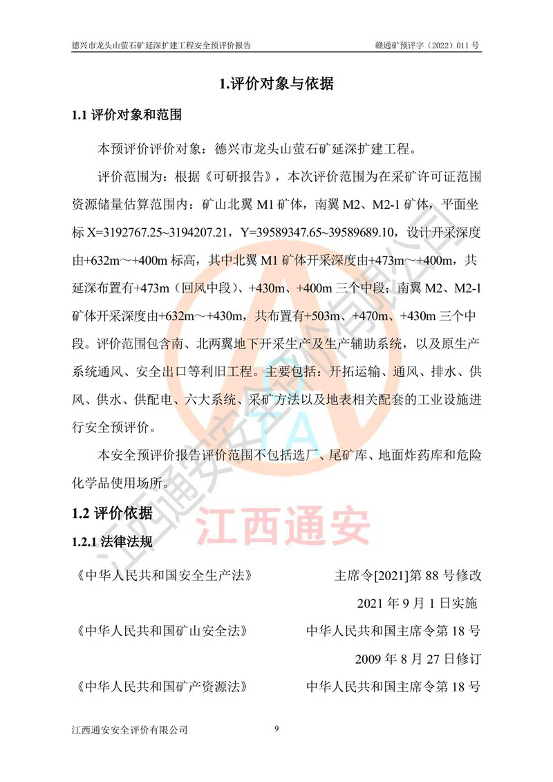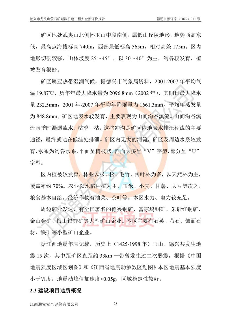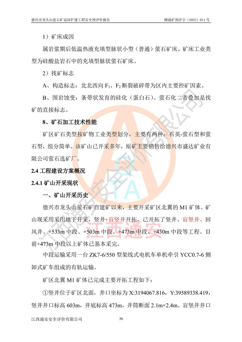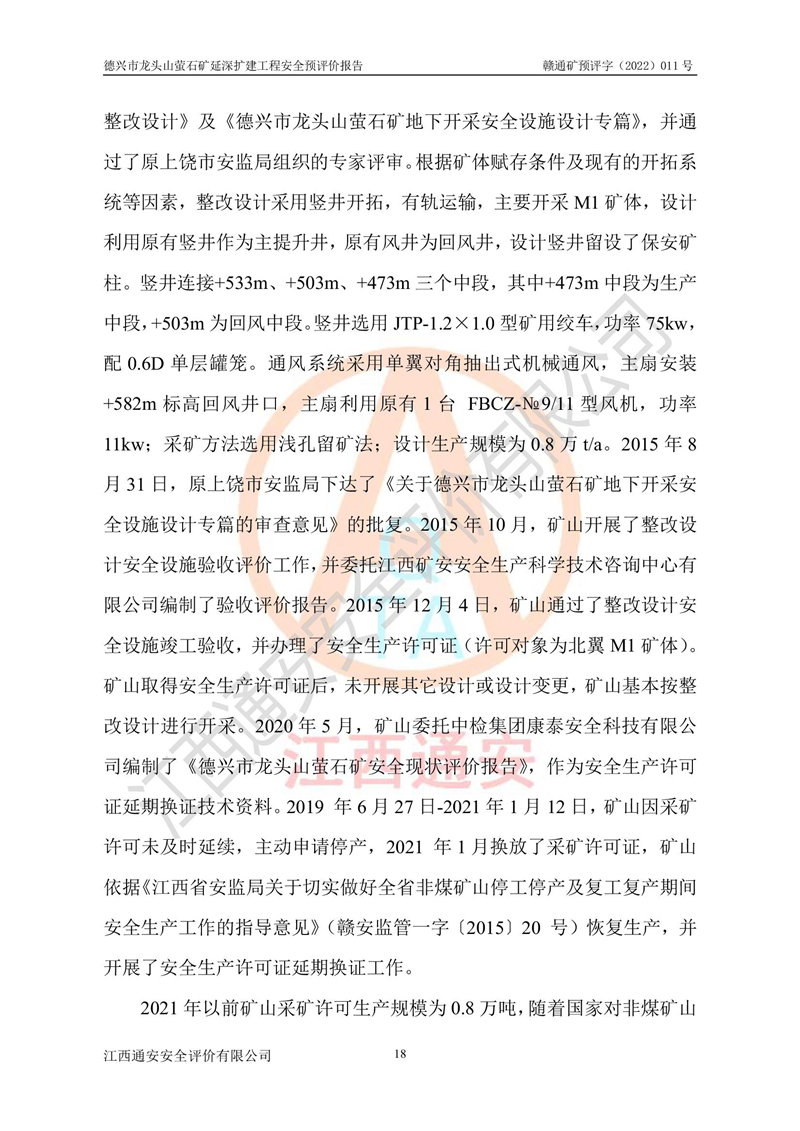 德兴市**山萤石矿位于德兴市区105°方位,直距35km处,属德兴市**山乡管辖。矿区地理坐标:东经117°54'54″~117°55'07",北纬28°50'53"~28°51'39"。矿区有6km简易公路与玉山-德兴省道公路相接;距浙赣铁路玉山站约55km;距德上高速公路樟村、怀玉出口约20km,交通较为便利。 德兴市**山萤石矿成立于1990年08月05日,注册地位于江西省德兴市**山乡**村南坞,法定**人为项昌炎,经济类型:集体企业。经营范围包括萤石矿地下开采。矿山于2003年首次取得上饶市国土资源局颁发的采矿许可证。2006年3月15日,矿山依法取得上饶市国土资源局延期颁发的采矿许可证,生产规模0.8万吨/年,开采深度:自+670m至+400m标高,面积为0.3207km2。2009-2018年期间矿山经多次采矿许可证延续。2018年8月30日,德兴市矿产黄金管理局出具《关于全面停止在生态保护红线范围内开展矿产资源勘查开采行为的通知》,由于项目矿界0.0008km2与生态红线重叠(红线类型为水土保持和生物多样性),上饶市国土资源局已将矿区涉及生态红线部分调出,矿区范围变更后,矿区范围由8个拐点组成,矿区面积由0.3207km2削减为0.3199km2。2018年12月28日,矿山取得了上饶市国土资源局延期换发的采矿许可证:C3611012010126120085302;采矿权人:德兴市**山萤石矿;矿山名称:德兴市**山萤石矿;经济类型:集体企业;开采矿种:萤石(普通);开采方式:地下开采;开采规模:0.8万吨/年;矿区面积:0.3199km2;**期限:2018年12月28日至2019年6月27日。 德兴市**山萤石矿自建矿以来,主要开采矿区北翼的M1矿体。矿山现采用竖井+盲竖井开拓,已开拓了竖井、盲竖井、回风井、+533m中段、+503m中段、+473m中段、+430m中段等工程。目前+473m中段以上矿体已基本采完。根据省安监局《关于进一步加强我省非煤地下矿山安全生产许可证工作的通知》(赣安监管一字[2012]253号)文件的要求,矿山开采多年形成的开拓方式与原开发利用方案及设计不符。2015年8月委托湖南联盛勘察设计有限公司编制了《德兴市**山萤石矿地下开采整改设计》及《德兴市**山萤石矿地下开采安全设施设计专篇》,并通过了原上饶市安监局组织的专家评审。2015年8月31日,原上饶市安监局下达了《关于德兴市**山萤石矿地下开采安全设施设计专篇的审查意见》的批复。2015年10月,矿山开展了整改设计安全设施验收评价工作,并委托江西矿安安全生产科学技术咨询中心有限公司编制了验收评价报告。2015年12月4日,矿山通过了整改设计安全设施竣工验收,并办理了安全生产许可证(许可对象为北翼M1矿体)。矿山取得安全生产许可证后,未开展其它设计或设计变更,矿山基本按整改设计进行开采。2020年5月,矿山委托中检集团康泰安全科技有限公司编制了《德兴市**山萤石矿安全现状评价报告》,作为安全生产许可证延期换证技术资料。2019 年6月27日-2021年1月12日,矿山因采矿许可未及时延续,主动申请停产,2021 年1月换放了采矿许可证,矿山依据《江西省安监局关于切实做好**非煤矿山停工停产及复工复产期间安全生产工作的指导意见》(赣安监管一字〔2015〕20 号)恢复生产,并开展了安全生产许可证延期换证工作。 2021年以前矿山采矿许可生产规模为0.8万吨,随着**对非煤矿山产业政策的调整,不断提高了非煤矿矿山准入门槛。矿山现有的采矿生产规模无法满足,《**安全生产专项整治三年行动计划》及“江西省主要矿产矿山低开采规模和低服务年限规划”等文件要求。 德兴市**山萤石矿北翼M1矿体经过多年开采后,原设计范围内(+473m以上中段)萤石矿资源储量日渐减少。为了扩大矿区资源储量,延长矿山服务年限,查明矿区萤石矿资源储量,提高矿床控制程度,为矿山提供更多可靠的资源储量。矿山加强了采矿许可范围内勘查地质工作,2018年4月委托江西省煤田地质局二二三地质队对其矿区范围内的北翼M1,南翼M2、M2-1矿体开展储量核实工作,2019年2月江西省煤田地质局二二三地质队提交了《江西省德兴市**山矿区萤石矿资源储量核实报告》报告中显示截止2018年12月31日,矿区保有萤石矿资源储量(122b+332+333)矿石量189.1kt,矿物量85.4kt,平均品位45.16%。北翼M1矿体其中122b类型矿石量5.7kt,333类型矿石量32.1kt。南翼M2、M2-1矿体其中332类型矿石量46.9kt,333类型矿石量104.4kt。 2021年1月12日,矿山取得上饶市自然资源局延期换发的采矿许可证,证号:C3611012010126120085302,采矿权人:德兴市**山萤石矿,地址:江西省德兴市,矿山名称:德兴市**山萤石矿,经济类型:集体企业,开采矿种:萤石(普通),开采方式:地下开采,生产规模:3.0万t/a,矿区面积:0.3199km2,**期限:肆年零玖月自2021年1月12日至2025年10月12日。开采深度由670m至400m标高,共有8个拐点圈定。 2021年8月19日,矿山取得江西省应急管理厅换发的安全生产许可证(开采对象北翼M1矿体)。编号:(赣)FM安许证字[2006]M0836号,单位名称:德兴市**山萤石矿,主要负责人:项昌炎,单位地址:德兴市**山乡**村,经济类型:集体企业,许可范围:萤石矿0.8万吨/年,竖井开拓,+473m中段地下开采。**期至2024年8月18日。 目前,矿山已完成了采矿许可证范围内详查工作,完成了资源价款处置,并完成了采矿许可生产规模的变更及采矿权延续等工作。为了使矿井达到持续稳定的生产接替,保持三级矿量平衡,矿山在完成储量核实报告工作后,现阶段正在履行延深扩建工程“三同时”建设手续。2021年8月30日,矿山向德兴市工业和信息化局申请了
