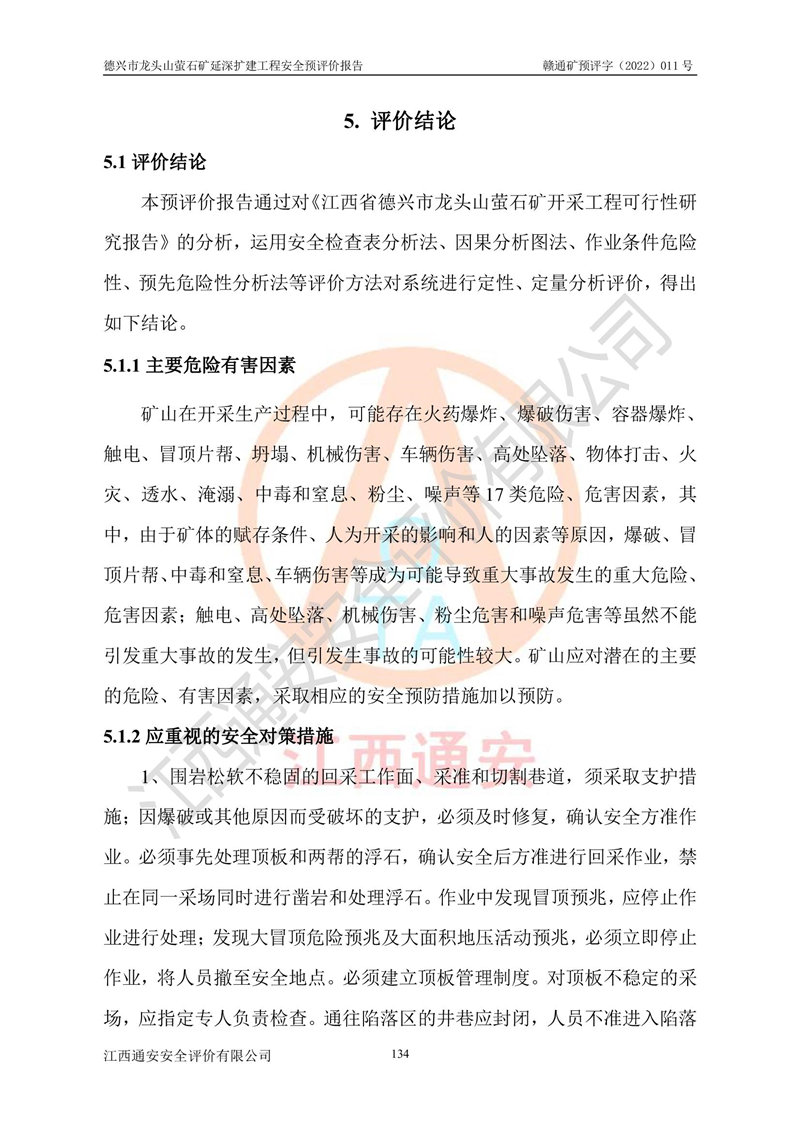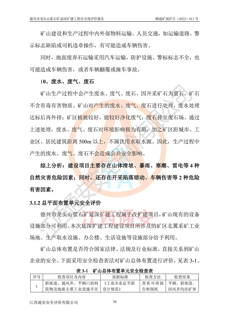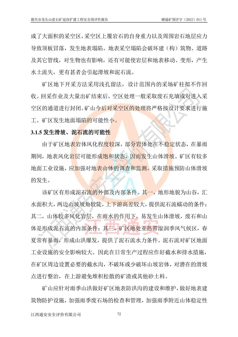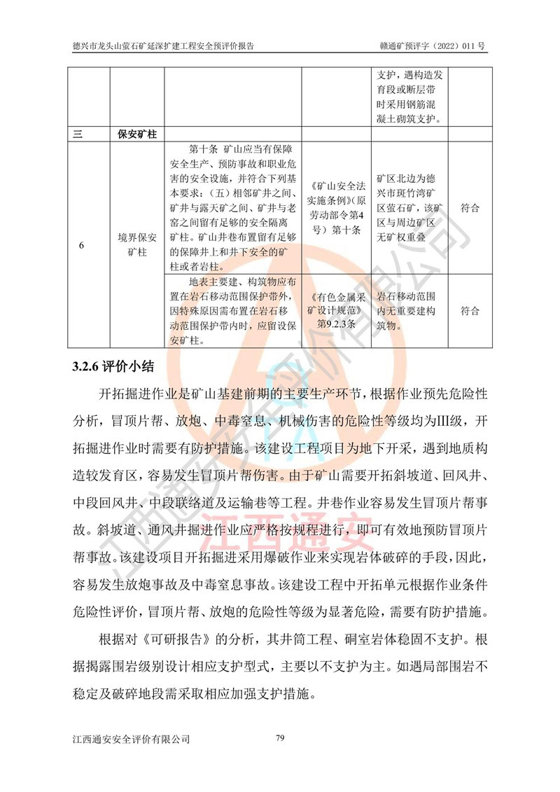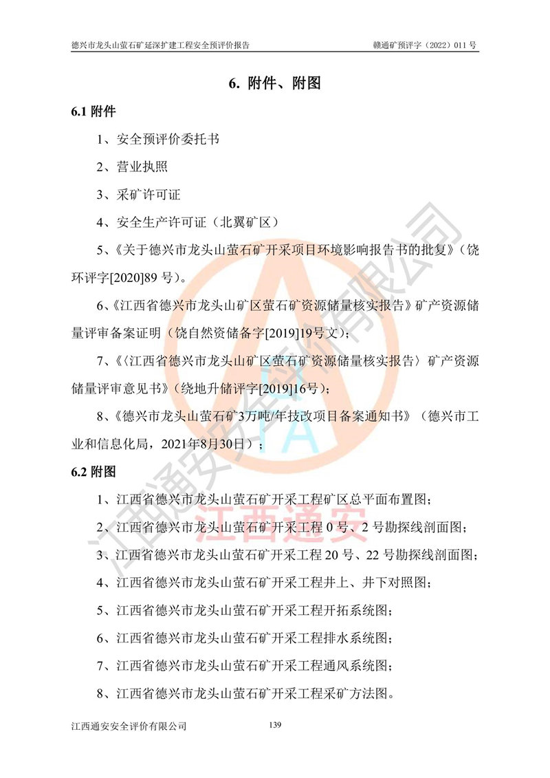 德兴市**山萤石矿位于德兴市区105°方位,直距35km处,属德兴市**山乡管辖。矿区地理坐标:东经117°54'54″~117°55'07",北纬28°50'53"~28°51'39"。矿区有6km简易公路与玉山-德兴省道公路相接;距浙赣铁路玉山站约55km;距德上高速公路樟村、怀玉出口约20km,交通较为便利。 德兴市**山萤石矿成立于1990年08月05日,注册地位于江西省德兴市**山乡**村南坞,法定**人为项昌炎,经济类型:集体企业。经营范围包括萤石矿地下开采。矿山于2003年首次取得上饶市国土资源局颁发的采矿许可证。2006年3月15日,矿山依法取得上饶市国土资源局延期颁发的采矿许可证,生产规模0.8万吨/年,开采深度:自+670m至+400m标高,面积为0.3207km2。2009-2018年期间矿山经多次采矿许可证延续。2018年8月30日,德兴市矿产黄金管理局出具《关于全面停止在生态保护红线范围内开展矿产资源勘查开采行为的通知》,由于项目矿界0.0008km2与生态红线重叠(红线类型为水土保持和生物多样性),上饶市国土资源局已将矿区涉及生态红线部分调出,矿区范围变更后,矿区范围由8个拐点组成,矿区面积由0.3207km2削减为0.3199km2。2018年12月28日,矿山取得了上饶市国土资源局延期换发的采矿许可证:C3611012010126120085302;采矿权人:德兴市**山萤石矿;矿山名称:德兴市**山萤石矿;经济类型:集体企业;开采矿种:萤石(普通);开采方式:地下开采;开采规模:0.8万吨/年;矿区面积:0.3199km2;**期限:2018年12月28日至2019年6月27日。 德兴市**山萤石矿自建矿以来,主要开采矿区北翼的M1矿体。矿山现采用竖井+盲竖井开拓,已开拓了竖井、盲竖井、回风井、+533m中段、+503m中段、+473m中段、+430m中段等工程。目前+473m中段以上矿体已基本采完。根据省安监局《关于进一步加强我省非煤地下矿山安全生产许可证工作的通知》(赣安监管一字[2012]253号)文件的要求,矿山开采多年形成的开拓方式与原开发利用方案及设计不符。2015年8月委托湖南联盛勘察设计有限公司编制了《德兴市**山萤石矿地下开采整改设计》及《德兴市**山萤石矿地下开采安全设施设计专篇》,并通过了原上饶市安监局组织的专家评审。2015年8月31日,原上饶市安监局下达了《关于德兴市**山萤石矿地下开采安全设施设计专篇的审查意见》的批复。2015年10月,矿山开展了整改设计安全设施验收评价工作,并委托江西矿安安全生产科学技术咨询中心有限公司编制了验收评价报告。2015年12月4日,矿山通过了整改设计安全设施竣工验收,并办理了安全生产许可证(许可对象为北翼M1矿体)。矿山取得安全生产许可证后,未开展其它设计或设计变更,矿山基本按整改设计进行开采。2020年5月,矿山委托中检集团康泰安全科技有限公司编制了《德兴市**山萤石矿安全现状评价报告》,作为安全生产许可证延期换证技术资料。2019 年6月27日-2021年1月12日,矿山因采矿许可未及时延续,主动申请停产,2021 年1月换放了采矿许可证,矿山依据《江西省安监局关于切实做好**非煤矿山停工停产及复工复产期间安全生产工作的指导意见》(赣安监管一字〔2015〕20 号)恢复生产,并开展了安全生产许可证延期换证工作。 2021年以前矿山采矿许可生产规模为0.8万吨,随着**对非煤矿山产业政策的调整,不断提高了非煤矿矿山准入门槛。矿山现有的采矿生产规模无法满足,《**安全生产专项整治三年行动计划》及“江西省主要矿产矿山低开采规模和低服务年限规划”等文件要求。 德兴市**山萤石矿北翼M1矿体经过多年开采后,原设计范围内(+473m以上中段)萤石矿资源储量日渐减少。为了扩大矿区资源储量,延长矿山服务年限,查明矿区萤石矿资源储量,提高矿床控制程度,为矿山提供更多可靠的资源储量。矿山加强了采矿许可范围内勘查地质工作,2018年4月委托江西省煤田地质局二二三地质队对其矿区范围内的北翼M1,南翼M2、M2-1矿体开展储量核实工作,2019年2月江西省煤田地质局二二三地质队提交了《江西省德兴市**山矿区萤石矿资源储量核实报告》报告中显示截止2018年12月31日,矿区保有萤石矿资源储量(122b+332+333)矿石量189.1kt,矿物量85.4kt,平均品位45.16%。北翼M1矿体其中122b类型矿石量5.7kt,333类型矿石量32.1kt。南翼M2、M2-1矿体其中332类型矿石量46.9kt,333类型矿石量104.4kt。 2021年1月12日,矿山取得上饶市自然资源局延期换发的采矿许可证,证号:C3611012010126120085302,采矿权人:德兴市**山萤石矿,地址:江西省德兴市,矿山名称:德兴市**山萤石矿,经济类型:集体企业,开采矿种:萤石(普通),开采方式:地下开采,生产规模:3.0万t/a,矿区面积:0.3199km2,**期限:肆年零玖月自2021年1月12日至2025年10月12日。开采深度由670m至400m标高,共有8个拐点圈定。 2021年8月19日,矿山取得江西省应急管理厅换发的安全生产许可证(开采对象北翼M1矿体)。编号:(赣)FM安许证字[2006]M0836号,单位名称:德兴市**山萤石矿,主要负责人:项昌炎,单位地址:德兴市**山乡**村,经济类型:集体企业,许可范围:萤石矿0.8万吨/年,竖井开拓,+473m中段地下开采。**期至2024年8月18日。 目前,矿山已完成了采矿许可证范围内详查工作,完成了资源价款处置,并完成了采矿许可生产规模的变更及采矿权延续等工作。为了使矿井达到持续稳定的生产接替,保持三级矿量平衡,矿山在完成储量核实报告工作后,现阶段正在履行延深扩建工程“三同时”建设手续。2021年8月30日,矿山向德兴市工业和信息化局申请了
