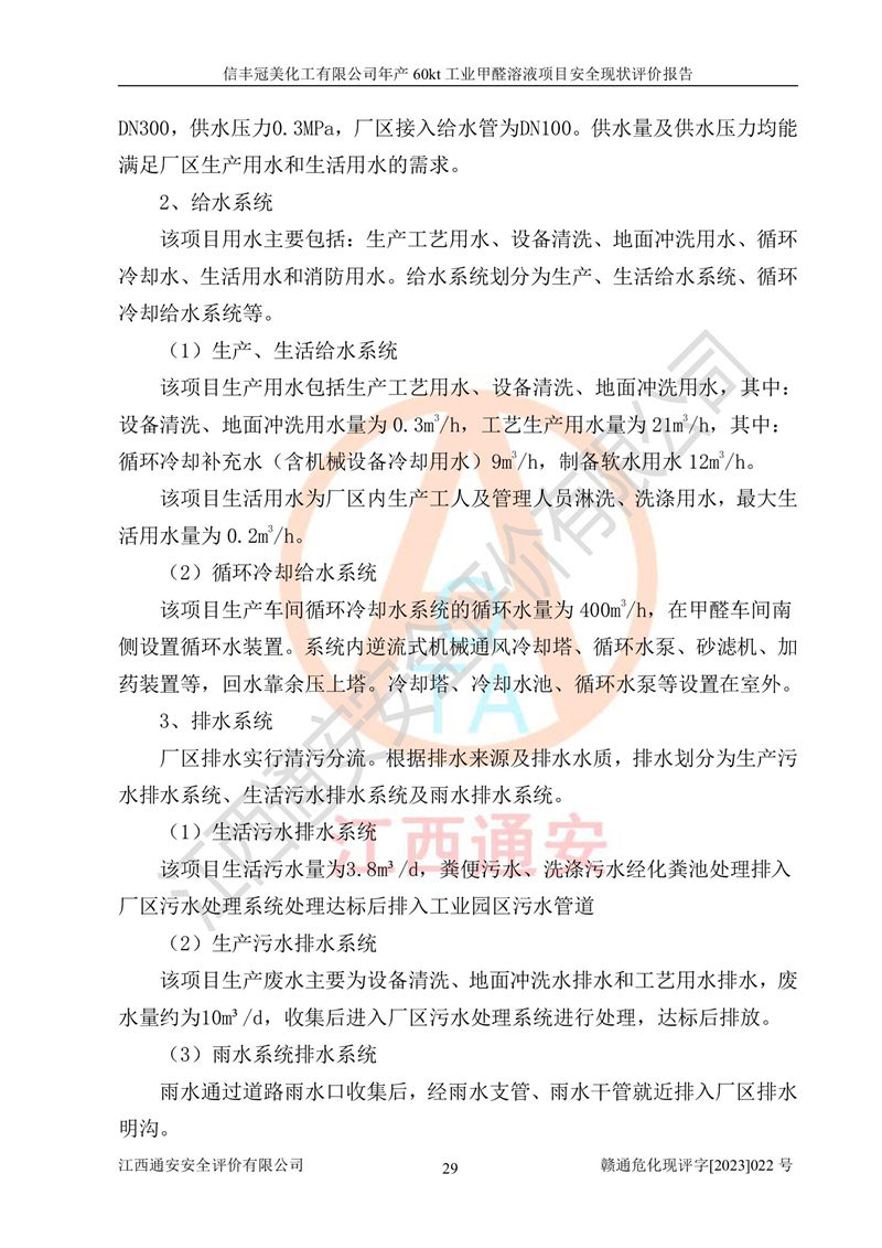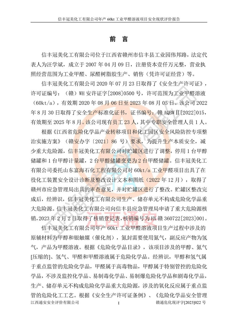 项目简介 | 信丰冠美化工有限公司位于江西省赣州市信丰县工业园伟邦路,法定**人为汪学斌,成立于2007年04月09日,注册资本壹仟万元整,营业执照经营范围为工业甲醛、尿醛树脂胶生产、销售(凭许可证经营)等。 信丰冠美化工有限公司2020年07月23日取得了《安全生产许可证》,许可证编号:(赣)WH安许证字[2008]0500号,许可范围为工业甲醛溶液(60kt/a),**期2020年08月06日至2023年08月05日。该公司2022年8月30日取得了安全生产标准化证书,证书编号:赣AQBWⅡ[2022]015,**期至2025年8月。该公司现有员工23人,其中专职安全管理人员1人。 根据《江西省危险化学品产业转移项目和化工园区安全风险防控专项整治实施方案》(赣安办字〔2021〕86 号)要求,为提升生产本质安全,减少重大危险源,信丰冠美化工有限公司对贮罐区进行了调整,停用1台甲醇储罐和1台甲醇计量罐,2台甲醇储罐变更为2台甲醛储罐。信丰冠美化工有限公司委托山东富海石化工程有限公司对60kt/a工业甲醛项目出具了在役化工装置安全设计诊断及整改设计文本和图纸(2022年12月),取得了赣州市应急管理局出具的审查意见,并对贮罐区进行了整改。贮罐区整改完成后,经辨识,信丰冠美化工有限公司生产、储存单元不构成危险化学品重大危险源。信丰冠美化工有限公司向信丰县应急管理局申请了重大危险源核销,2023年2月2日取得了核销登记表,核销编号为HX赣360722[2023]001。 信丰冠美化工有限公司年产60kt工业甲醛溶液项目生产过程中涉及的原辅材料为甲醇和银触媒(催化剂),氮封需要使用氮气,副反应产物为氢气,产品为甲醛溶液。根据《危险化学品目录》,该项目涉及的甲醇、氮气[压缩的]、氢气、甲醛和甲醛溶液属于危险化学品。经辨识,甲醇和氢气属于重点监管的危险化学品,甲醛属于高毒物品,甲醇属于特别管控的危险化学品,不涉及监控化学品、易制毒化学品、易制爆危险化学品和剧毒化学品,生产、储存单元不构成危险化学品重大危险源,涉及的氧化反应属于重点监管的危险化工工艺。根据《安全生产许可证条例》、《危险化学品安全管理条例》和《危险化学品生产企业安全生产许可实施办法》的相关规定,该项目甲醛溶液属于危险化学品,需要办理危险化学品安全生产许可证。根据生产工艺特点及物料的理化特性可知,该项目生产过程中存在火灾与爆炸、中毒与窒息、触电、机械伤害等危险有害因素。 该公司自2020年07月23日取得安全生产许可证以来,生产运行正常,未发生一般及以上生产安全事故。 | ||||||