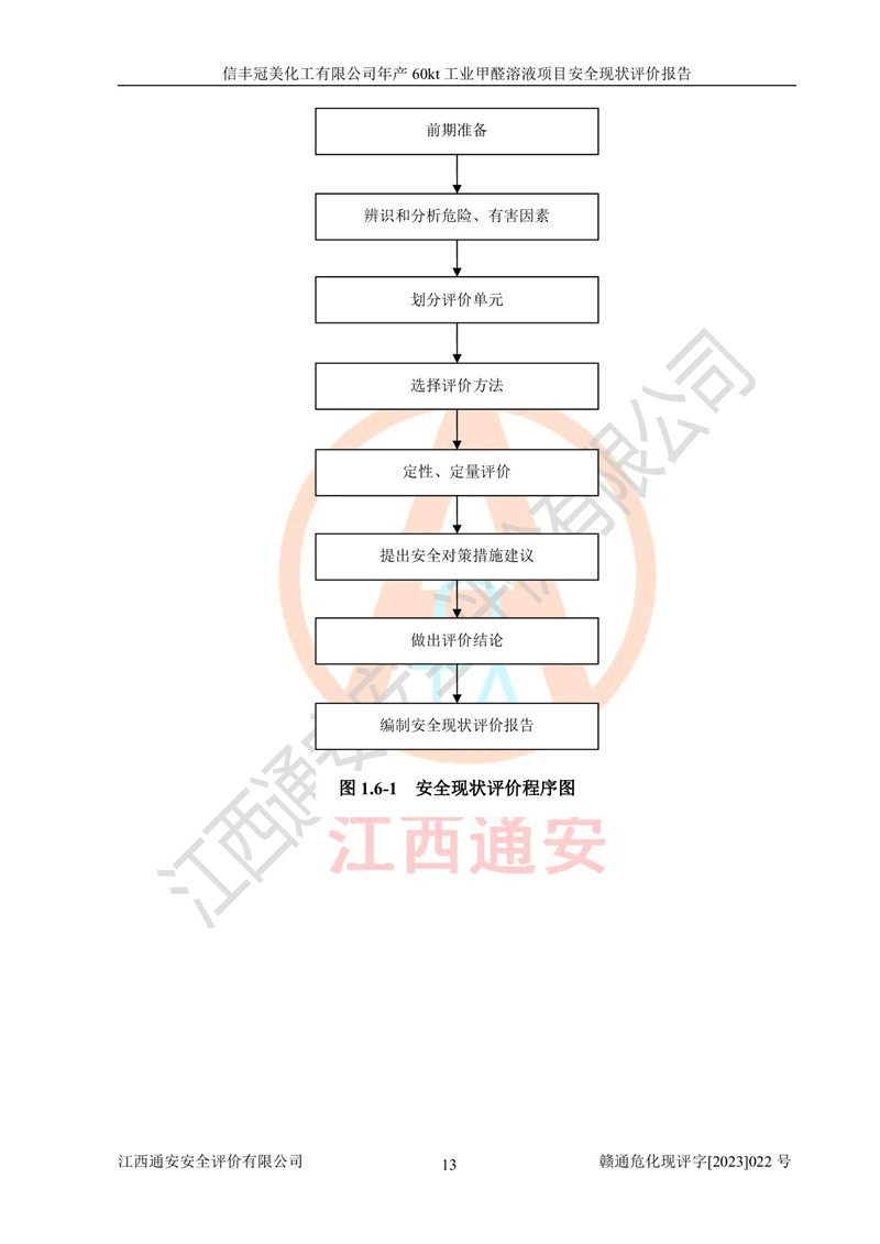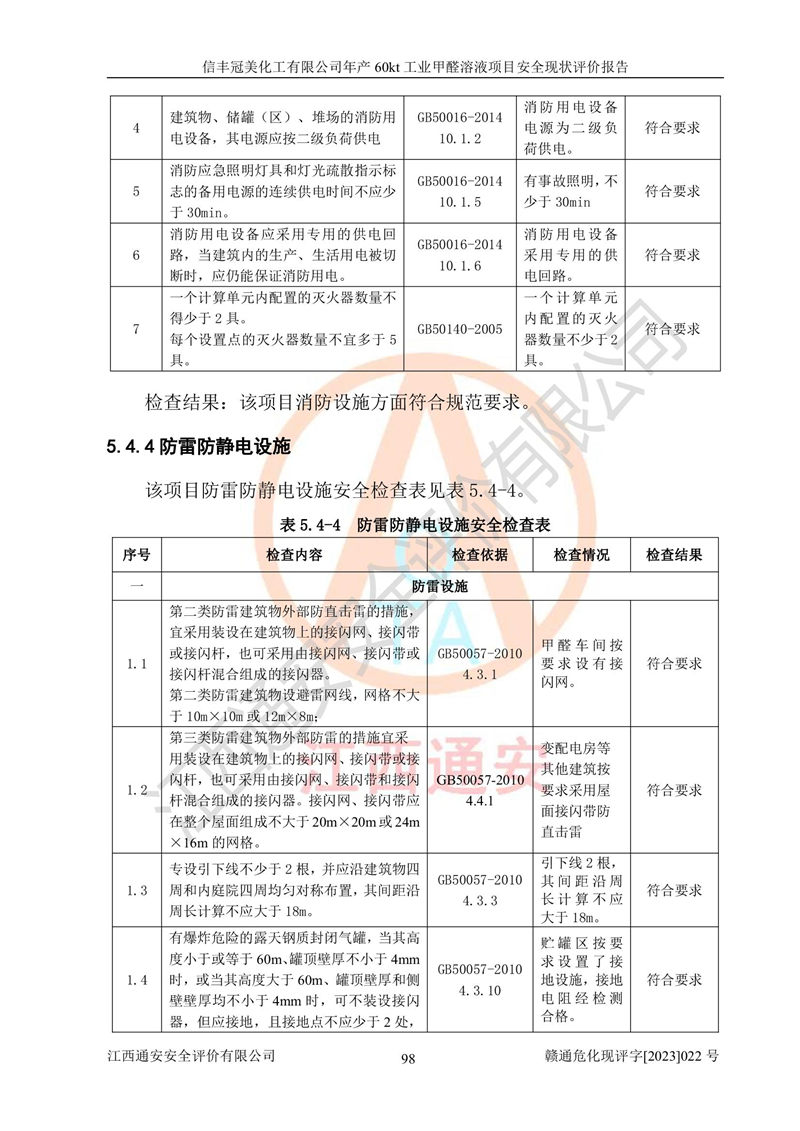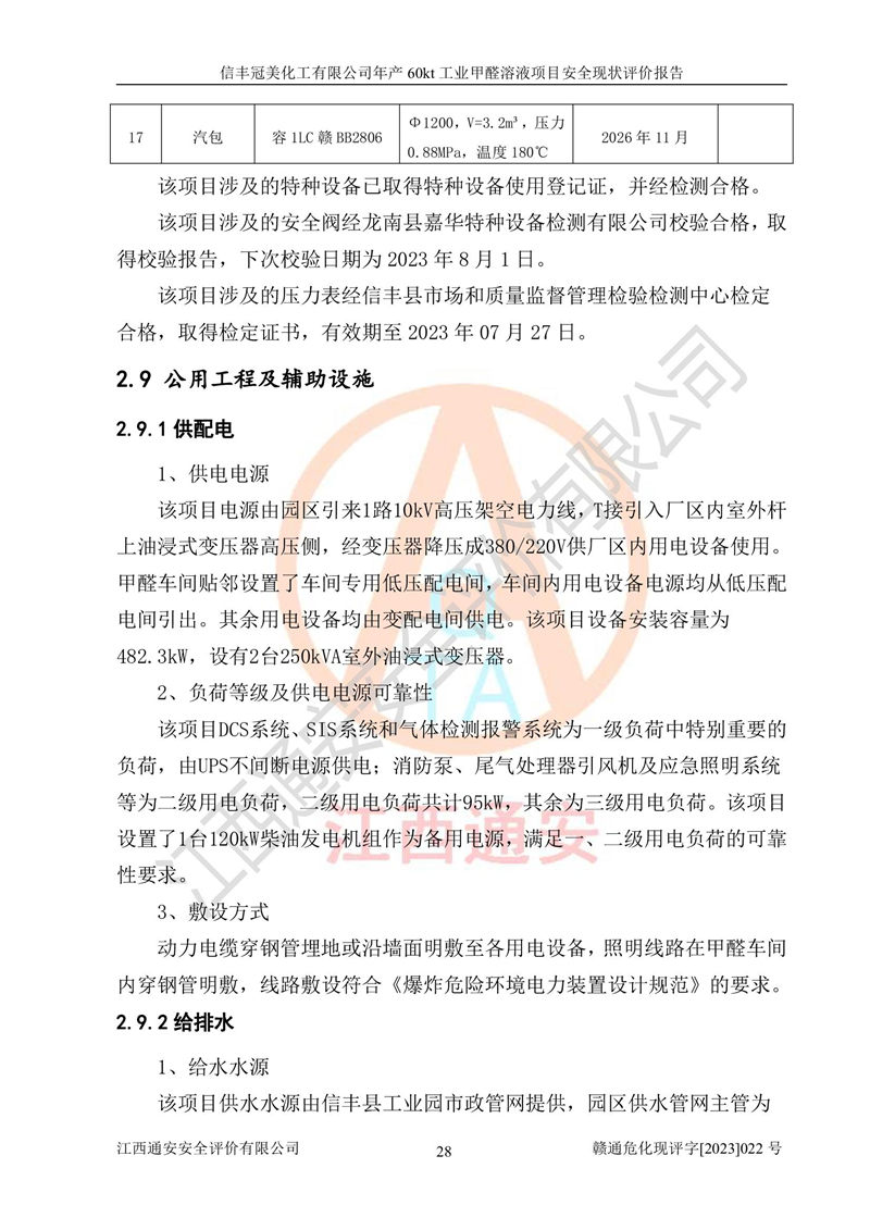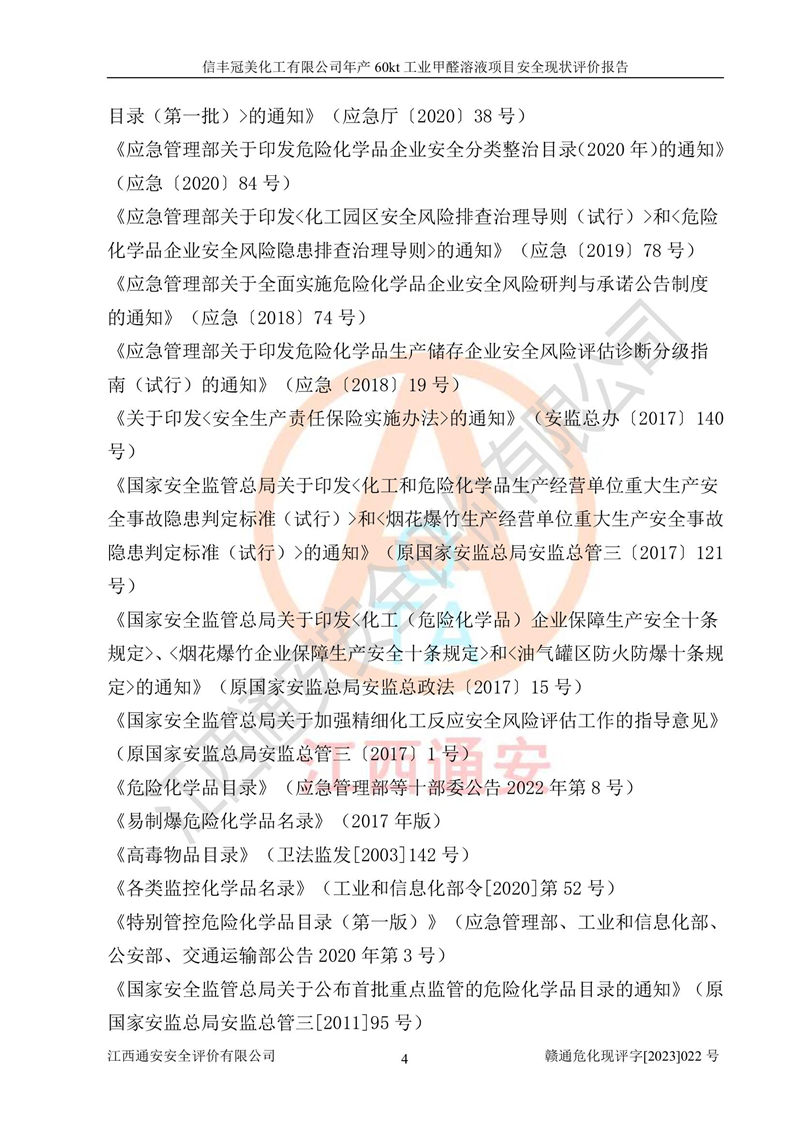 评价结论 | 信丰冠美化工有限公司年产60kt工业甲醛溶液项目现场情况与设计图纸一致,DCS和SIS系统设计符合要求、运行正常,有关从业人员资质符合《江西省危险化学品安全专项整治三年行动实施方案》要求,安全设施及安全管理符合法律、法规、标准的要求,安全风险是受控制的,其风险程度是可以接受的,安全设施符合安全生产条件,能够满足安全生产的要求。 | ||||||