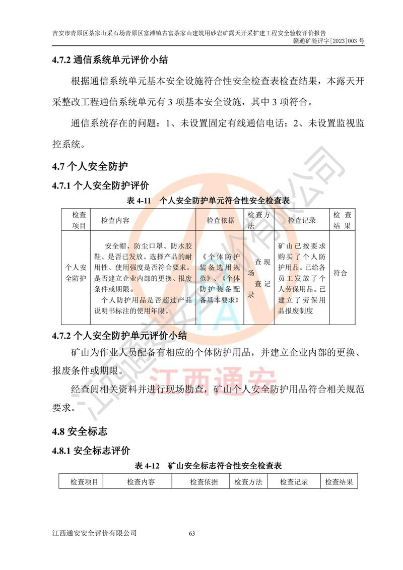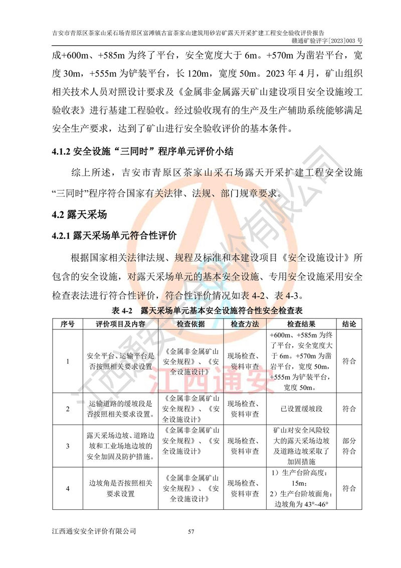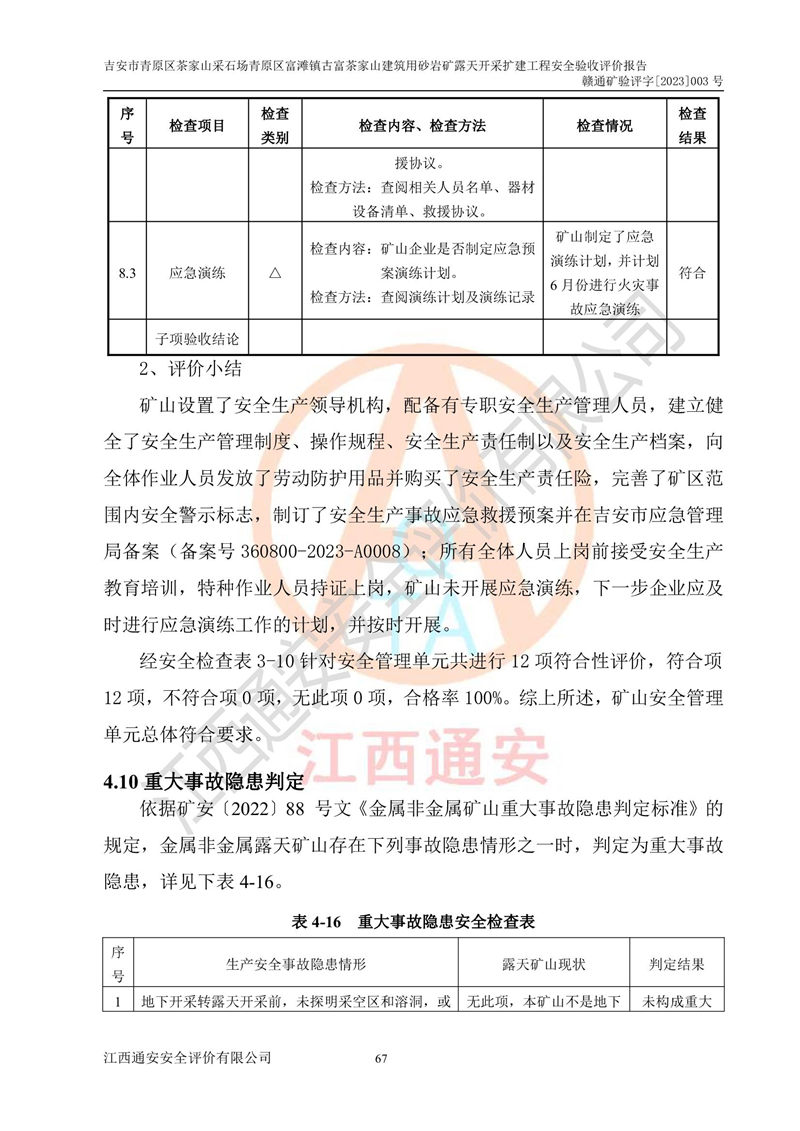其它 | 该建设项目(扩建工程)自进行矿山基建施工、试生产运行以来,能够按照露天矿山安全设施“三同时”的要求开展各项工作,对试运行过程中存在的安全管理问题,安全技术问题进行了整改,符合安全设施与主体工程同时设计、同时施工、同时投入生产和使用的要求;已建项目的安全设施总体运行**、技术措施得当;安全生产组织机构健全,制订的各项安全生产管理制度和安全技术规程,能在生产过程中得到**遵守和实施,试生产运行以来,安全设施运行正常,对照《金属非金属露天矿山建设项目安全设施竣工验收表》查找吉安市青原区茶家山采石场青原区富滩镇古富茶家山建筑用砂岩矿露天开采扩建工程竣工验收项目中,否决项的检查结论均为“符合”且验收检查项总数中检查结论为“不符合”的项少于5%。 综上所述,吉安市青原区茶家山采石场青原区富滩镇古富茶家山建筑用砂岩矿露天开采扩建工程安全设施符合《吉安市青原区茶家山采石场青原区富滩镇古富茶家山建筑用砂岩矿露天开采扩建工程安全设施设计》及**有关法律法规、标准、规章、规范的规定要求,具备安全验收的条件。 | ||||