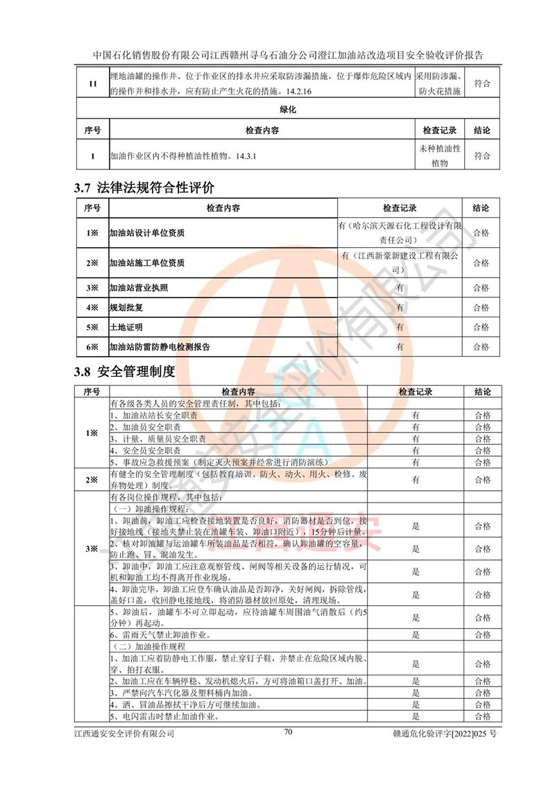 其它 | 中国石化销售股份有限公司江西赣州寻乌石油分公司澄江加油站改造项目的安全设施和措施在正常经营过程中能够满足安全经营的条件,消防设施到位且在**期内,安全管理能够满足正常安全经营的需要,具备安全验收的条件,符合经营和储存危险化学品的安全条件要求。 | ||||
