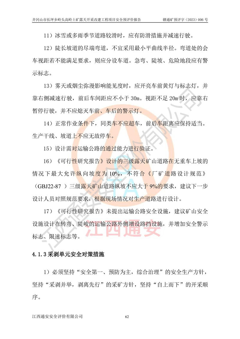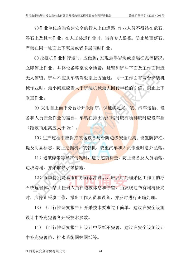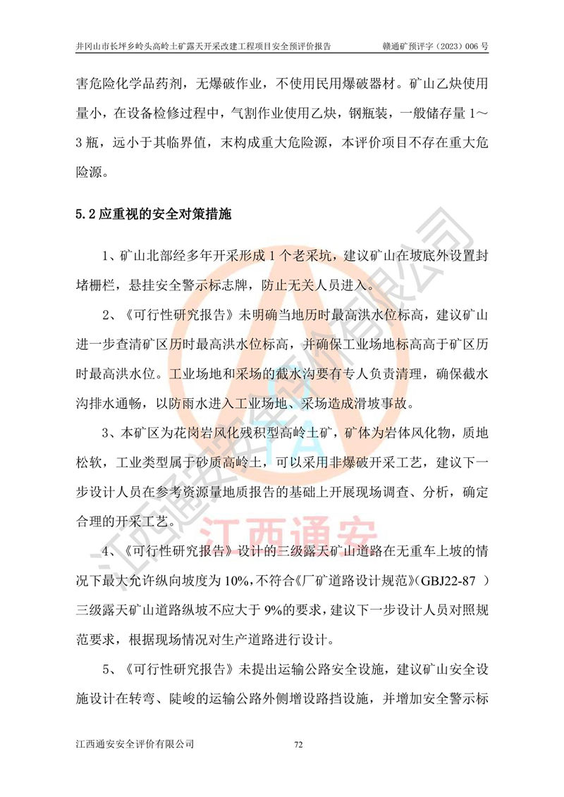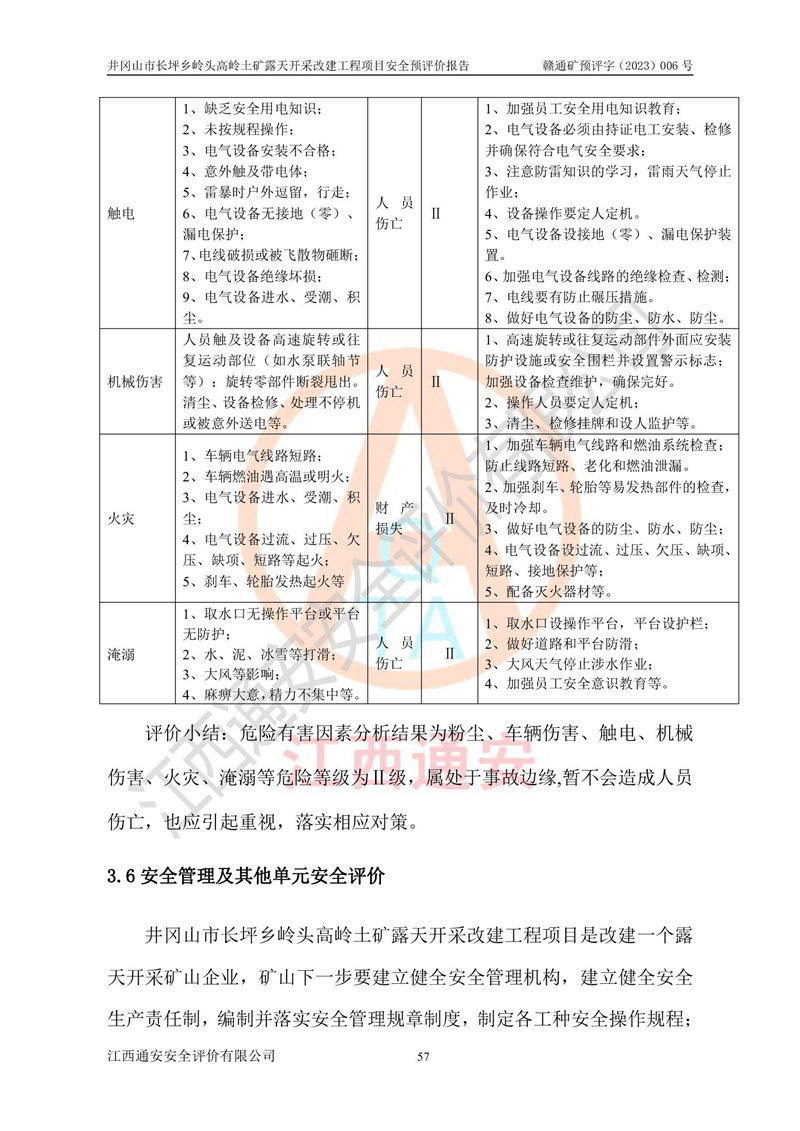 其它 | 1、该评价项目中存在的主要危险因素:滑坡和坍塌、**伤害、机械伤害、起重伤害、火灾、高处坠落、物体打击、淹溺、泥石流。 2、该评价项目应重点防范的重大危险有害因素:滑坡和坍塌、**伤害、高处坠落、机械伤害。 3、该评价项目中存在的有害因素包括:粉尘、噪声与振动、不良作业环境,如高温、雷击对矿山人员的伤害和其他不利的环境因素等。该评价项目应重点防范的有害因素:粉尘和噪声。 4、该矿山为非金属露天采场,无瓦斯和自燃发火危险,矿区范围内及周边无较大水系,矿区工程及水文地质条件中等。该采场不使用有毒有害危险化学品药剂,无爆破作业,不使用民用爆破器材。矿山乙炔使用量小,在设备检修过程中,气割作业使用乙炔,钢瓶装,一般储存量1~3瓶,远小于其临界值,末构成重大危险源,本评价项目不存在重大危险源。 建设项目拟定的开采方案、采用的采矿工艺及各系统的安全设施基本符合安全生产法律、法规和行业安全技术规程。在建设施工及生产运行中,如能严格执行**有关安全生产法律、法规和有关标准、规范,认真落实设计提出的安全措施,并合理采纳本报告中提出的安全对策措施及建议,项目的主要危险、有害因素可得到较好控制,安全生产风险在可接受范围。井冈山市长坪乡岭头高岭土矿露天开采改建工程项目从安全生产角度符合**有关安全生产法律、法规、规章、标准和规范的要求,风险可以接受。 | ||||