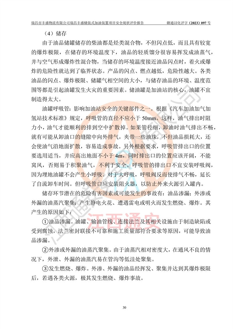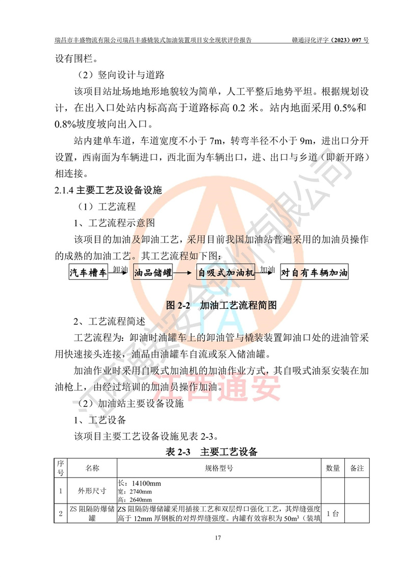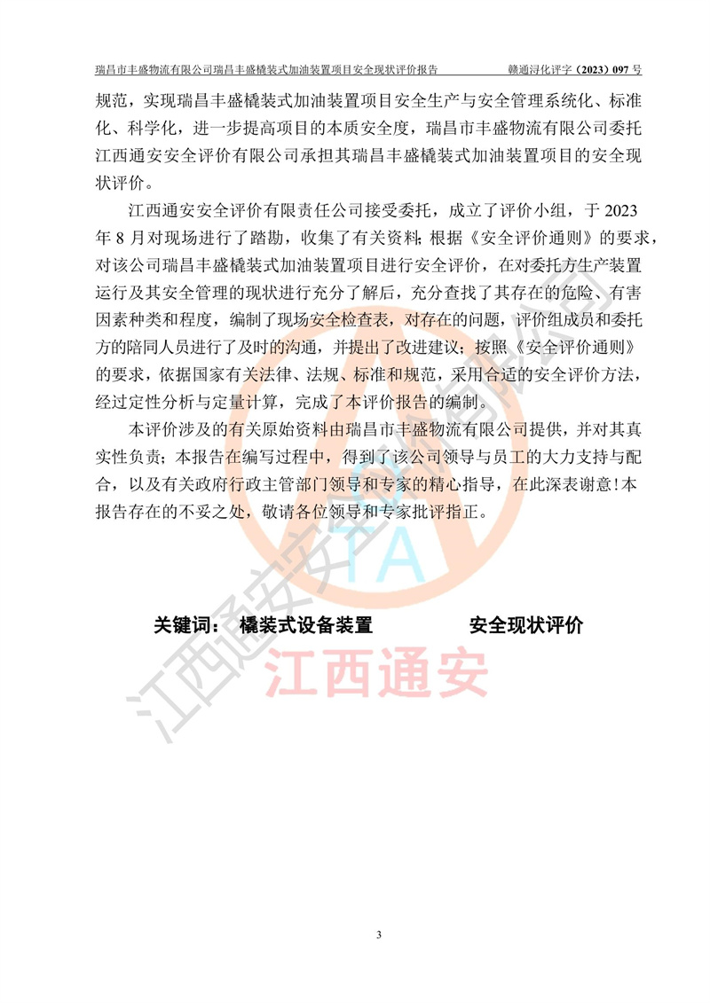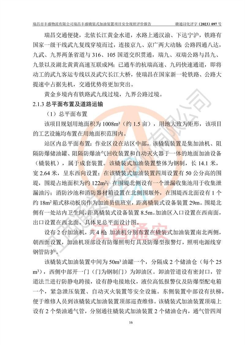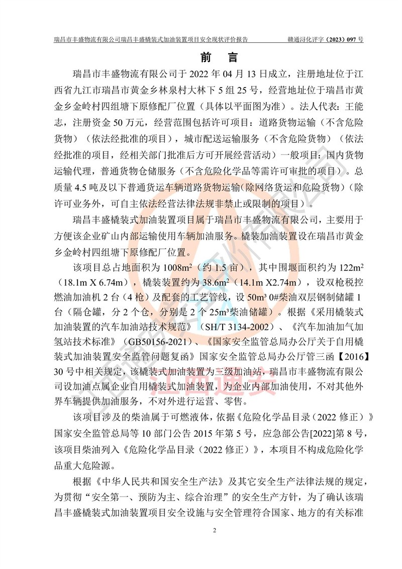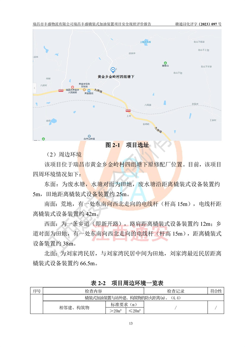 项目简介 | 瑞昌市丰盛物流有限公司于2022年04月13日成立,注册地址位于江西省九江市瑞昌市黄金乡林泉村大林下5组25号,经营地址位于瑞昌市黄金乡金岭村四组塘下原修配厂位置(具体以平面图为准)。法人**:王能志,注册资金50万元,经营范围包括许可项目:道路货物运输(不含危险货物)(依法经批准的项目),城市配送运输服务(不含危险货物)(依法经批准的项目,经相关部门批准后方可开展经营活动)一般项目:**货物运输代理,普通货物仓储服务(不含危险化学品等需许可审批的项目)。总质量4.5吨及以下普通货运**道路货物运输(除网络货运和危险货物)(除许可业务外,可自主依法经营法律法规非禁止或限制的项目)。 瑞昌丰盛橇装式加油装置项目属于瑞昌市丰盛物流有限公司,主要用于方便该企业矿山内部运输使用**加油服务。橇装加油装置设在瑞昌市黄金乡金岭村四组塘下原修配厂位置。 该项目总占地面积为1008m2(约1.5亩),其中围堰面积约为122m2(18.1m X 6.74m),橇装装置约为38.6m2(14.1m X2.74m),设双枪税控燃油加油机2台(4枪)及配套的工艺管线,设50m³ 0#柴油双层钢制储罐1台(隔仓罐,分2个仓,分别是2个25m³柴油储罐)。根据《采用橇装式加油装置的汽车加油站技术规范》(SH/T 3134-2002)、《汽车加油加气加氢站技术标准》(GB50156-2021)、《**安全监管总局办公厅关于自用橇装式加油装置安全监管问题复函》**安全监管总局办公厅管三函【2016】30号中相关规定,该橇装式加油装置为三级加油站,瑞昌市丰盛物流有限公司设加油点属企业自用橇装式加油装置,为企业内部加油使用,不对其他外界**提供加油服务,不对外进行运营、零售。 该项目涉及的柴油属于可燃液体,依据《危险化学品目录(2022修正)》**安全监管总局等10部门公告2015年第5号,应急部公告[2022]第8号,该项目柴油列入《危险化学品目录(2022修正)》,本项目不构成危险化学品重大危险源。 根据《中华人民共和国安全生产法》及其它安全生产法律法规的规定,为贯彻“安全**、预防为主、综合治理”的安全生产方针,为了确认该瑞昌丰盛橇装式加油装置项目安全设施与安全管理符合**、地方的有关标准规范,实现瑞昌丰盛橇装式加油装置项目安全生产与安全管理系统化、标准化、科学化,进一步提高项目的本质安全度,瑞昌市丰盛物流有限公司委托江西通安安全评价有限公司承担其瑞昌丰盛橇装式加油装置项目的安全现状评价。 江西通安安全评价有限责任公司接受委托,成立了评价小组,于2023年8月对现场进行了踏勘,收集了有关资料;根据《安全评价通则》的要求,对该公司瑞昌丰盛橇装式加油装置项目进行安全评价,在对委托方生产装置运行及其安全管理的现状进行充分了解后,充分查找了其存在的危险、有害因素种类和程度,编制了现场安全检查表,对存在的问题,评价组成员和委托方的陪同人员进行了及时的沟通,并提出了改进建议;按照《安全评价通则》的要求,依据**有关法律、法规、标准和规范,采用合适的安全评价方法,经过定性分析与定量计算,完成了本评价报告的编制。 本次安全评价范围为瑞昌市丰盛物流有限公司瑞昌丰盛橇装式加油装置项目的主体装置和辅助设施,包括经营过程中的危险和危害因素控制措施和工艺、设备设施的安全可靠性和劳动安全卫生方面管理的组织、机构、人员、防护设施、作业环境及管理制度等安全经营条件的符合性评价。 评价报告中涉及环境保护、消防及职业卫生等方面的内容,应以其主管部门审核意见为准;自然灾害方面和成品油购进时的运输不包括在本评价范围内,本报告只对涉及部分做一般性评述。 | |||||||