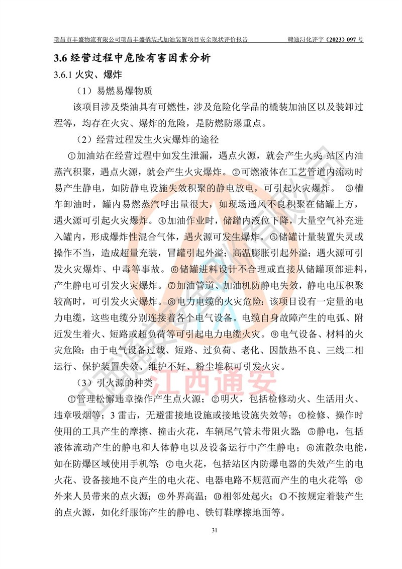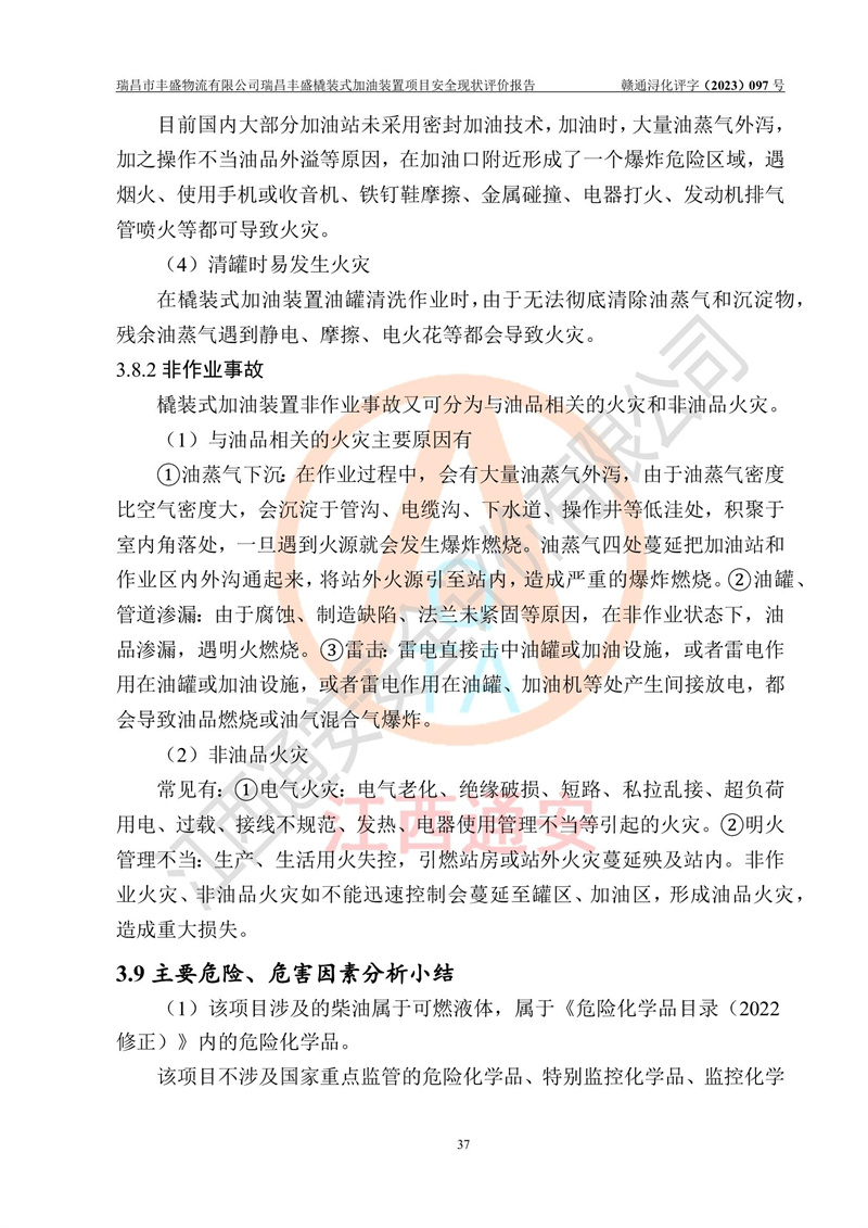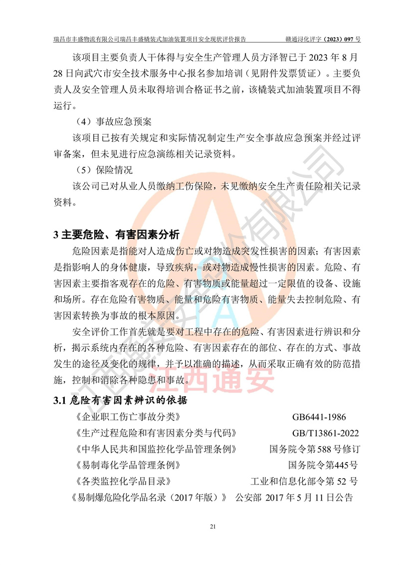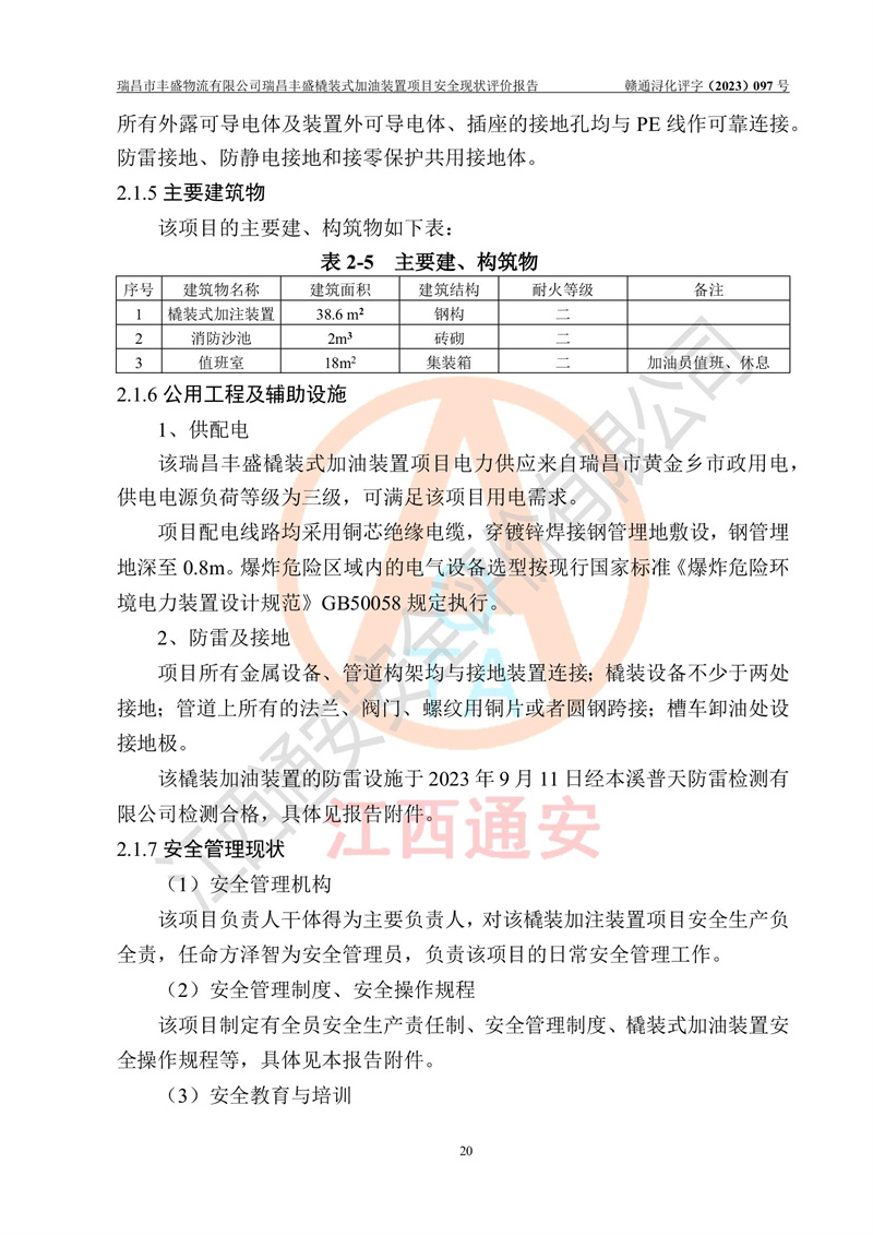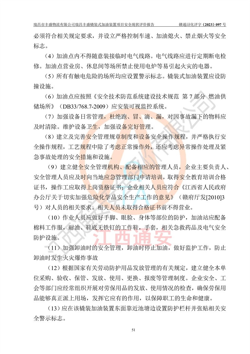 项目简介 | 瑞昌市丰盛物流有限公司于2022年04月13日成立,注册地址位于江西省九江市瑞昌市黄金乡林泉村大林下5组25号,经营地址位于瑞昌市黄金乡金岭村四组塘下原修配厂位置(具体以平面图为准)。法人**:王能志,注册资金50万元,经营范围包括许可项目:道路货物运输(不含危险货物)(依法经批准的项目),城市配送运输服务(不含危险货物)(依法经批准的项目,经相关部门批准后方可开展经营活动)一般项目:**货物运输代理,普通货物仓储服务(不含危险化学品等需许可审批的项目)。总质量4.5吨及以下普通货运**道路货物运输(除网络货运和危险货物)(除许可业务外,可自主依法经营法律法规非禁止或限制的项目)。 瑞昌丰盛橇装式加油装置项目属于瑞昌市丰盛物流有限公司,主要用于方便该企业矿山内部运输使用**加油服务。橇装加油装置设在瑞昌市黄金乡金岭村四组塘下原修配厂位置。 该项目总占地面积为1008m2(约1.5亩),其中围堰面积约为122m2(18.1m X 6.74m),橇装装置约为38.6m2(14.1m X2.74m),设双枪税控燃油加油机2台(4枪)及配套的工艺管线,设50m³ 0#柴油双层钢制储罐1台(隔仓罐,分2个仓,分别是2个25m³柴油储罐)。根据《采用橇装式加油装置的汽车加油站技术规范》(SH/T 3134-2002)、《汽车加油加气加氢站技术标准》(GB50156-2021)、《**安全监管总局办公厅关于自用橇装式加油装置安全监管问题复函》**安全监管总局办公厅管三函【2016】30号中相关规定,该橇装式加油装置为三级加油站,瑞昌市丰盛物流有限公司设加油点属企业自用橇装式加油装置,为企业内部加油使用,不对其他外界**提供加油服务,不对外进行运营、零售。 该项目涉及的柴油属于可燃液体,依据《危险化学品目录(2022修正)》**安全监管总局等10部门公告2015年第5号,应急部公告[2022]第8号,该项目柴油列入《危险化学品目录(2022修正)》,本项目不构成危险化学品重大危险源。 根据《中华人民共和国安全生产法》及其它安全生产法律法规的规定,为贯彻“安全**、预防为主、综合治理”的安全生产方针,为了确认该瑞昌丰盛橇装式加油装置项目安全设施与安全管理符合**、地方的有关标准规范,实现瑞昌丰盛橇装式加油装置项目安全生产与安全管理系统化、标准化、科学化,进一步提高项目的本质安全度,瑞昌市丰盛物流有限公司委托江西通安安全评价有限公司承担其瑞昌丰盛橇装式加油装置项目的安全现状评价。 江西通安安全评价有限责任公司接受委托,成立了评价小组,于2023年8月对现场进行了踏勘,收集了有关资料;根据《安全评价通则》的要求,对该公司瑞昌丰盛橇装式加油装置项目进行安全评价,在对委托方生产装置运行及其安全管理的现状进行充分了解后,充分查找了其存在的危险、有害因素种类和程度,编制了现场安全检查表,对存在的问题,评价组成员和委托方的陪同人员进行了及时的沟通,并提出了改进建议;按照《安全评价通则》的要求,依据**有关法律、法规、标准和规范,采用合适的安全评价方法,经过定性分析与定量计算,完成了本评价报告的编制。 本次安全评价范围为瑞昌市丰盛物流有限公司瑞昌丰盛橇装式加油装置项目的主体装置和辅助设施,包括经营过程中的危险和危害因素控制措施和工艺、设备设施的安全可靠性和劳动安全卫生方面管理的组织、机构、人员、防护设施、作业环境及管理制度等安全经营条件的符合性评价。 评价报告中涉及环境保护、消防及职业卫生等方面的内容,应以其主管部门审核意见为准;自然灾害方面和成品油购进时的运输不包括在本评价范围内,本报告只对涉及部分做一般性评述。 | |||||||