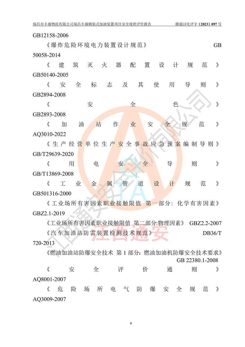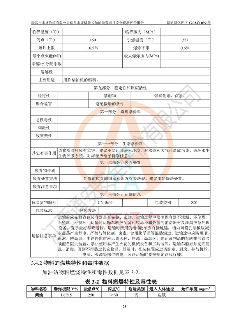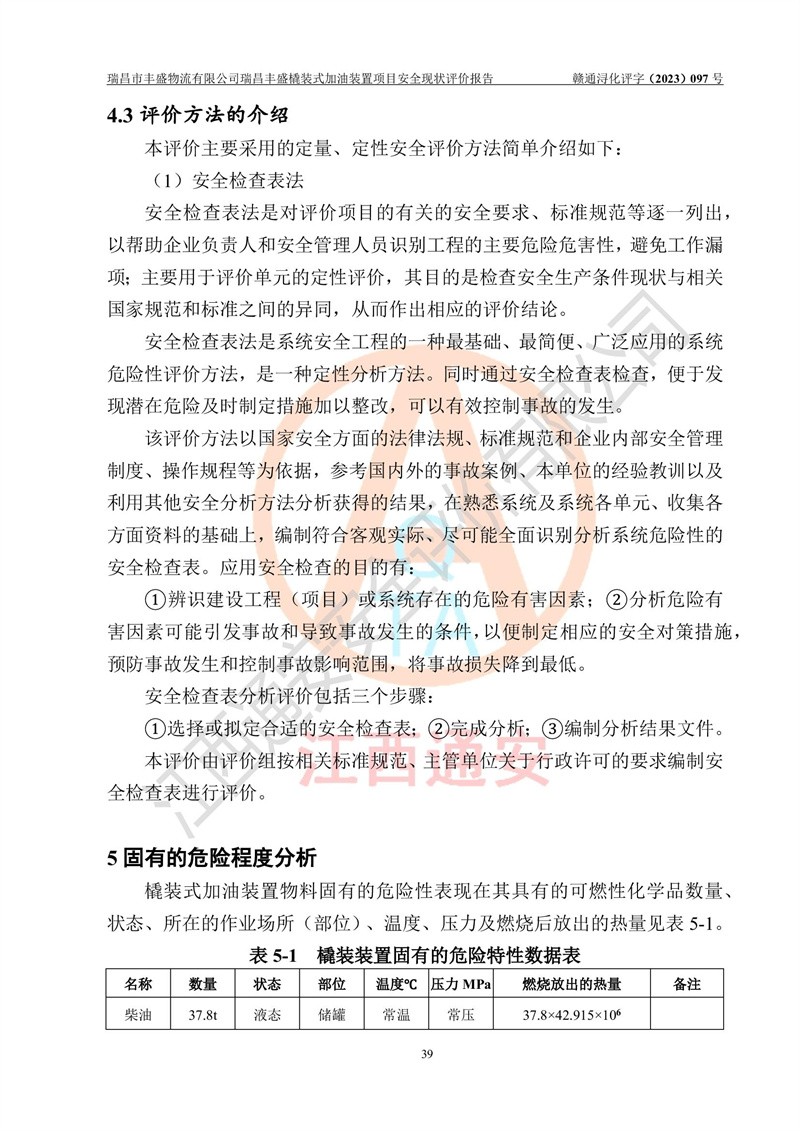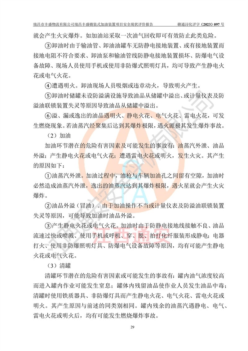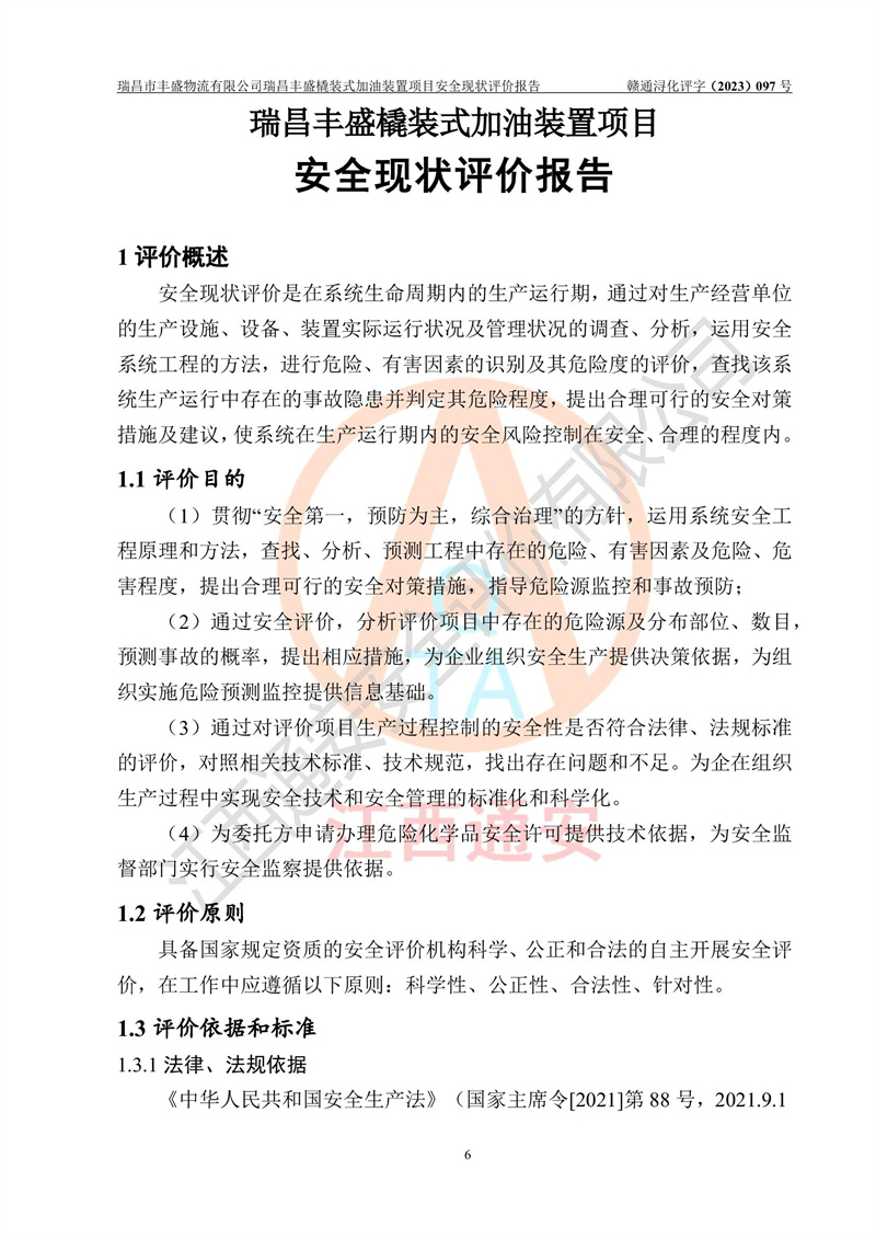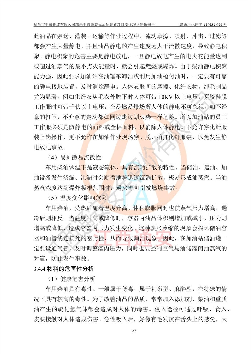 项目简介 | 瑞昌市丰盛物流有限公司于2022年04月13日成立,注册地址位于江西省九江市瑞昌市黄金乡林泉村大林下5组25号,经营地址位于瑞昌市黄金乡金岭村四组塘下原修配厂位置(具体以平面图为准)。法人**:王能志,注册资金50万元,经营范围包括许可项目:道路货物运输(不含危险货物)(依法经批准的项目),城市配送运输服务(不含危险货物)(依法经批准的项目,经相关部门批准后方可开展经营活动)一般项目:**货物运输代理,普通货物仓储服务(不含危险化学品等需许可审批的项目)。总质量4.5吨及以下普通货运**道路货物运输(除网络货运和危险货物)(除许可业务外,可自主依法经营法律法规非禁止或限制的项目)。 瑞昌丰盛橇装式加油装置项目属于瑞昌市丰盛物流有限公司,主要用于方便该企业矿山内部运输使用**加油服务。橇装加油装置设在瑞昌市黄金乡金岭村四组塘下原修配厂位置。 该项目总占地面积为1008m2(约1.5亩),其中围堰面积约为122m2(18.1m X 6.74m),橇装装置约为38.6m2(14.1m X2.74m),设双枪税控燃油加油机2台(4枪)及配套的工艺管线,设50m³ 0#柴油双层钢制储罐1台(隔仓罐,分2个仓,分别是2个25m³柴油储罐)。根据《采用橇装式加油装置的汽车加油站技术规范》(SH/T 3134-2002)、《汽车加油加气加氢站技术标准》(GB50156-2021)、《**安全监管总局办公厅关于自用橇装式加油装置安全监管问题复函》**安全监管总局办公厅管三函【2016】30号中相关规定,该橇装式加油装置为三级加油站,瑞昌市丰盛物流有限公司设加油点属企业自用橇装式加油装置,为企业内部加油使用,不对其他外界**提供加油服务,不对外进行运营、零售。 该项目涉及的柴油属于可燃液体,依据《危险化学品目录(2022修正)》**安全监管总局等10部门公告2015年第5号,应急部公告[2022]第8号,该项目柴油列入《危险化学品目录(2022修正)》,本项目不构成危险化学品重大危险源。 根据《中华人民共和国安全生产法》及其它安全生产法律法规的规定,为贯彻“安全**、预防为主、综合治理”的安全生产方针,为了确认该瑞昌丰盛橇装式加油装置项目安全设施与安全管理符合**、地方的有关标准规范,实现瑞昌丰盛橇装式加油装置项目安全生产与安全管理系统化、标准化、科学化,进一步提高项目的本质安全度,瑞昌市丰盛物流有限公司委托江西通安安全评价有限公司承担其瑞昌丰盛橇装式加油装置项目的安全现状评价。 江西通安安全评价有限责任公司接受委托,成立了评价小组,于2023年8月对现场进行了踏勘,收集了有关资料;根据《安全评价通则》的要求,对该公司瑞昌丰盛橇装式加油装置项目进行安全评价,在对委托方生产装置运行及其安全管理的现状进行充分了解后,充分查找了其存在的危险、有害因素种类和程度,编制了现场安全检查表,对存在的问题,评价组成员和委托方的陪同人员进行了及时的沟通,并提出了改进建议;按照《安全评价通则》的要求,依据**有关法律、法规、标准和规范,采用合适的安全评价方法,经过定性分析与定量计算,完成了本评价报告的编制。 本次安全评价范围为瑞昌市丰盛物流有限公司瑞昌丰盛橇装式加油装置项目的主体装置和辅助设施,包括经营过程中的危险和危害因素控制措施和工艺、设备设施的安全可靠性和劳动安全卫生方面管理的组织、机构、人员、防护设施、作业环境及管理制度等安全经营条件的符合性评价。 评价报告中涉及环境保护、消防及职业卫生等方面的内容,应以其主管部门审核意见为准;自然灾害方面和成品油购进时的运输不包括在本评价范围内,本报告只对涉及部分做一般性评述。 | |||||||