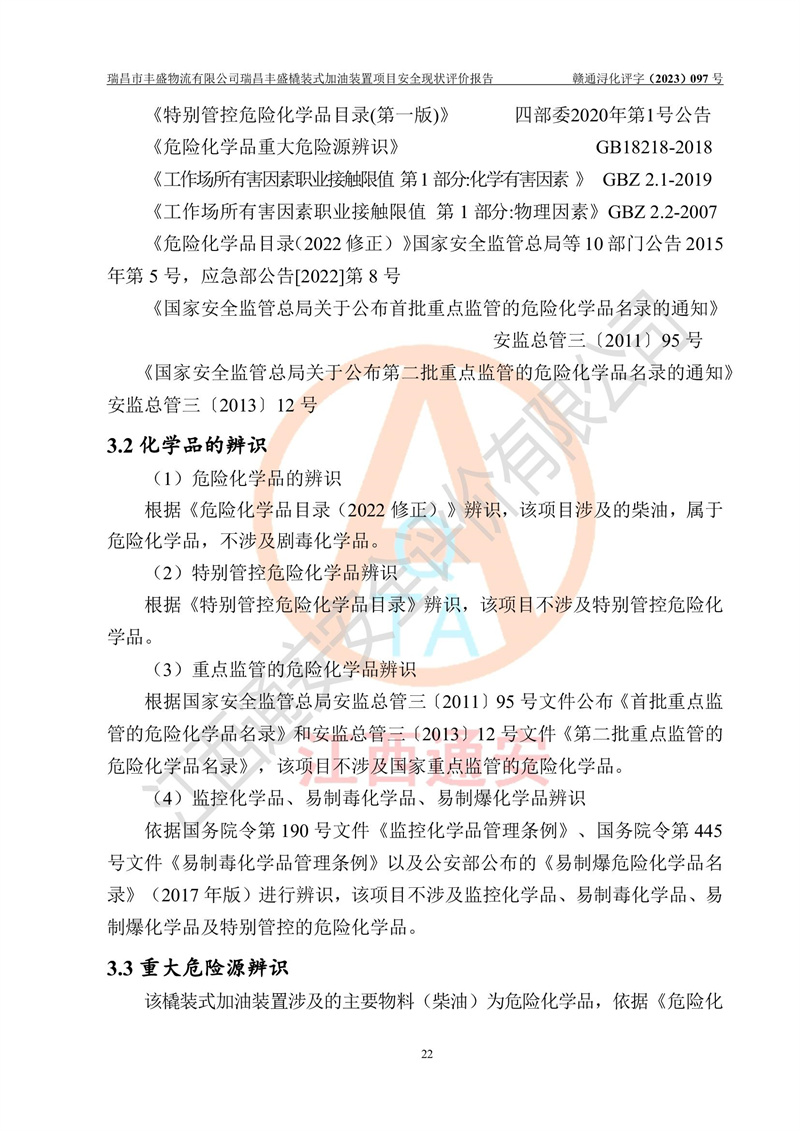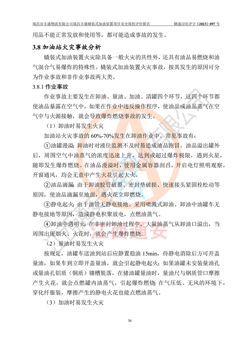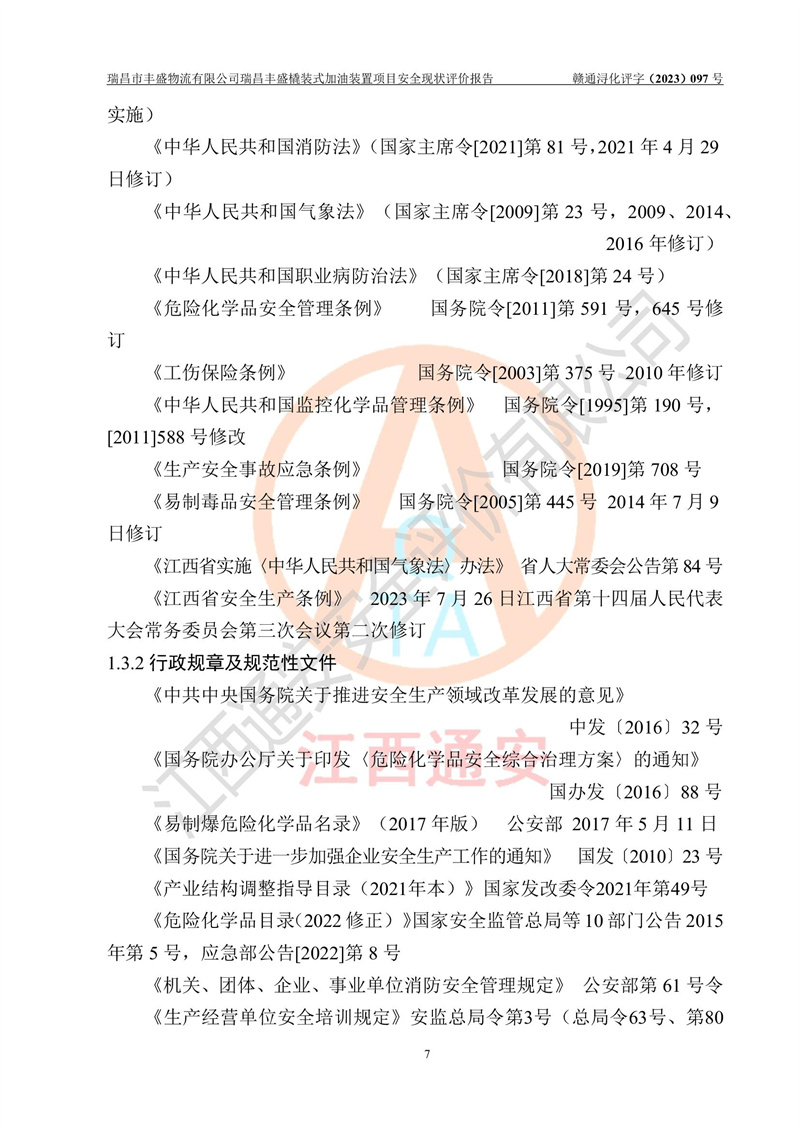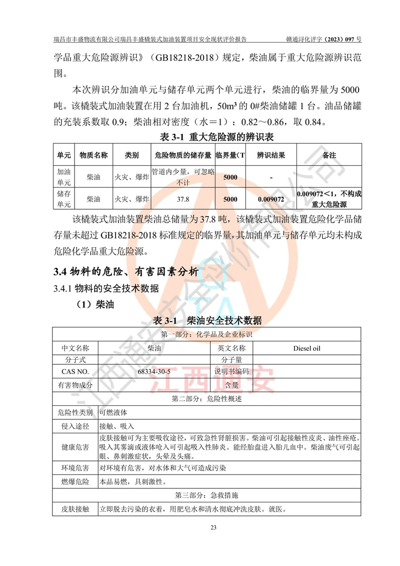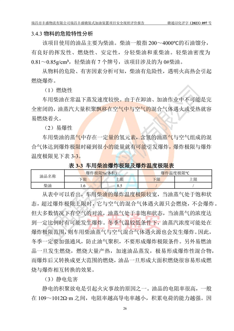 项目简介 | 瑞昌市丰盛物流有限公司于2022年04月13日成立,注册地址位于江西省九江市瑞昌市黄金乡林泉村大林下5组25号,经营地址位于瑞昌市黄金乡金岭村四组塘下原修配厂位置(具体以平面图为准)。法人**:王能志,注册资金50万元,经营范围包括许可项目:道路货物运输(不含危险货物)(依法经批准的项目),城市配送运输服务(不含危险货物)(依法经批准的项目,经相关部门批准后方可开展经营活动)一般项目:**货物运输代理,普通货物仓储服务(不含危险化学品等需许可审批的项目)。总质量4.5吨及以下普通货运**道路货物运输(除网络货运和危险货物)(除许可业务外,可自主依法经营法律法规非禁止或限制的项目)。 瑞昌丰盛橇装式加油装置项目属于瑞昌市丰盛物流有限公司,主要用于方便该企业矿山内部运输使用**加油服务。橇装加油装置设在瑞昌市黄金乡金岭村四组塘下原修配厂位置。 该项目总占地面积为1008m2(约1.5亩),其中围堰面积约为122m2(18.1m X 6.74m),橇装装置约为38.6m2(14.1m X2.74m),设双枪税控燃油加油机2台(4枪)及配套的工艺管线,设50m³ 0#柴油双层钢制储罐1台(隔仓罐,分2个仓,分别是2个25m³柴油储罐)。根据《采用橇装式加油装置的汽车加油站技术规范》(SH/T 3134-2002)、《汽车加油加气加氢站技术标准》(GB50156-2021)、《**安全监管总局办公厅关于自用橇装式加油装置安全监管问题复函》**安全监管总局办公厅管三函【2016】30号中相关规定,该橇装式加油装置为三级加油站,瑞昌市丰盛物流有限公司设加油点属企业自用橇装式加油装置,为企业内部加油使用,不对其他外界**提供加油服务,不对外进行运营、零售。 该项目涉及的柴油属于可燃液体,依据《危险化学品目录(2022修正)》**安全监管总局等10部门公告2015年第5号,应急部公告[2022]第8号,该项目柴油列入《危险化学品目录(2022修正)》,本项目不构成危险化学品重大危险源。 根据《中华人民共和国安全生产法》及其它安全生产法律法规的规定,为贯彻“安全**、预防为主、综合治理”的安全生产方针,为了确认该瑞昌丰盛橇装式加油装置项目安全设施与安全管理符合**、地方的有关标准规范,实现瑞昌丰盛橇装式加油装置项目安全生产与安全管理系统化、标准化、科学化,进一步提高项目的本质安全度,瑞昌市丰盛物流有限公司委托江西通安安全评价有限公司承担其瑞昌丰盛橇装式加油装置项目的安全现状评价。 江西通安安全评价有限责任公司接受委托,成立了评价小组,于2023年8月对现场进行了踏勘,收集了有关资料;根据《安全评价通则》的要求,对该公司瑞昌丰盛橇装式加油装置项目进行安全评价,在对委托方生产装置运行及其安全管理的现状进行充分了解后,充分查找了其存在的危险、有害因素种类和程度,编制了现场安全检查表,对存在的问题,评价组成员和委托方的陪同人员进行了及时的沟通,并提出了改进建议;按照《安全评价通则》的要求,依据**有关法律、法规、标准和规范,采用合适的安全评价方法,经过定性分析与定量计算,完成了本评价报告的编制。 本次安全评价范围为瑞昌市丰盛物流有限公司瑞昌丰盛橇装式加油装置项目的主体装置和辅助设施,包括经营过程中的危险和危害因素控制措施和工艺、设备设施的安全可靠性和劳动安全卫生方面管理的组织、机构、人员、防护设施、作业环境及管理制度等安全经营条件的符合性评价。 评价报告中涉及环境保护、消防及职业卫生等方面的内容,应以其主管部门审核意见为准;自然灾害方面和成品油购进时的运输不包括在本评价范围内,本报告只对涉及部分做一般性评述。 | |||||||