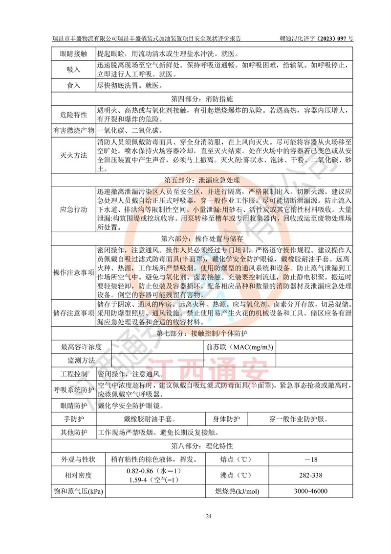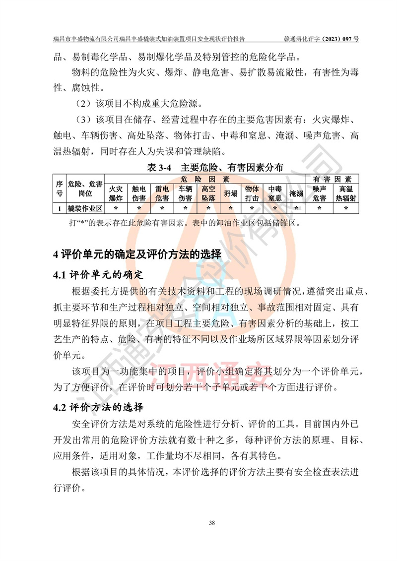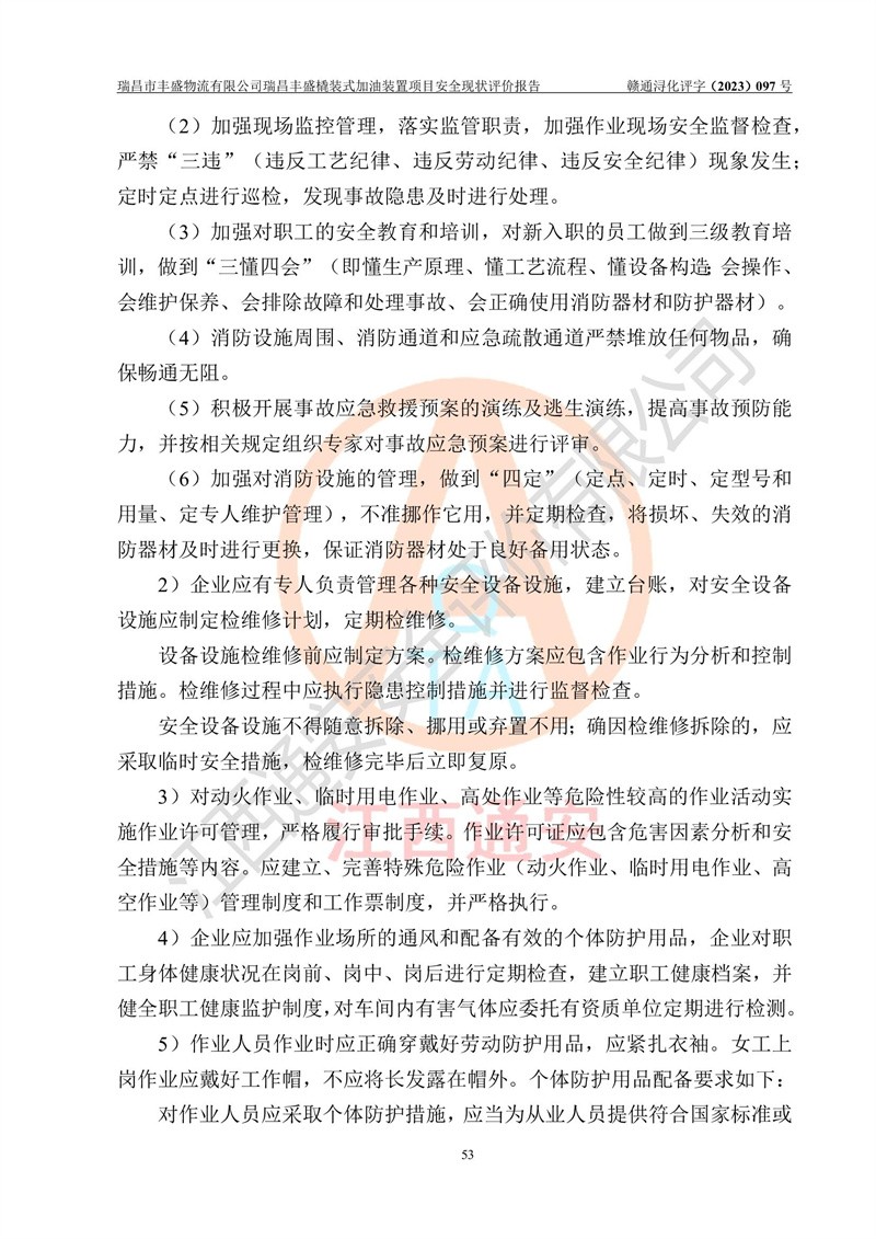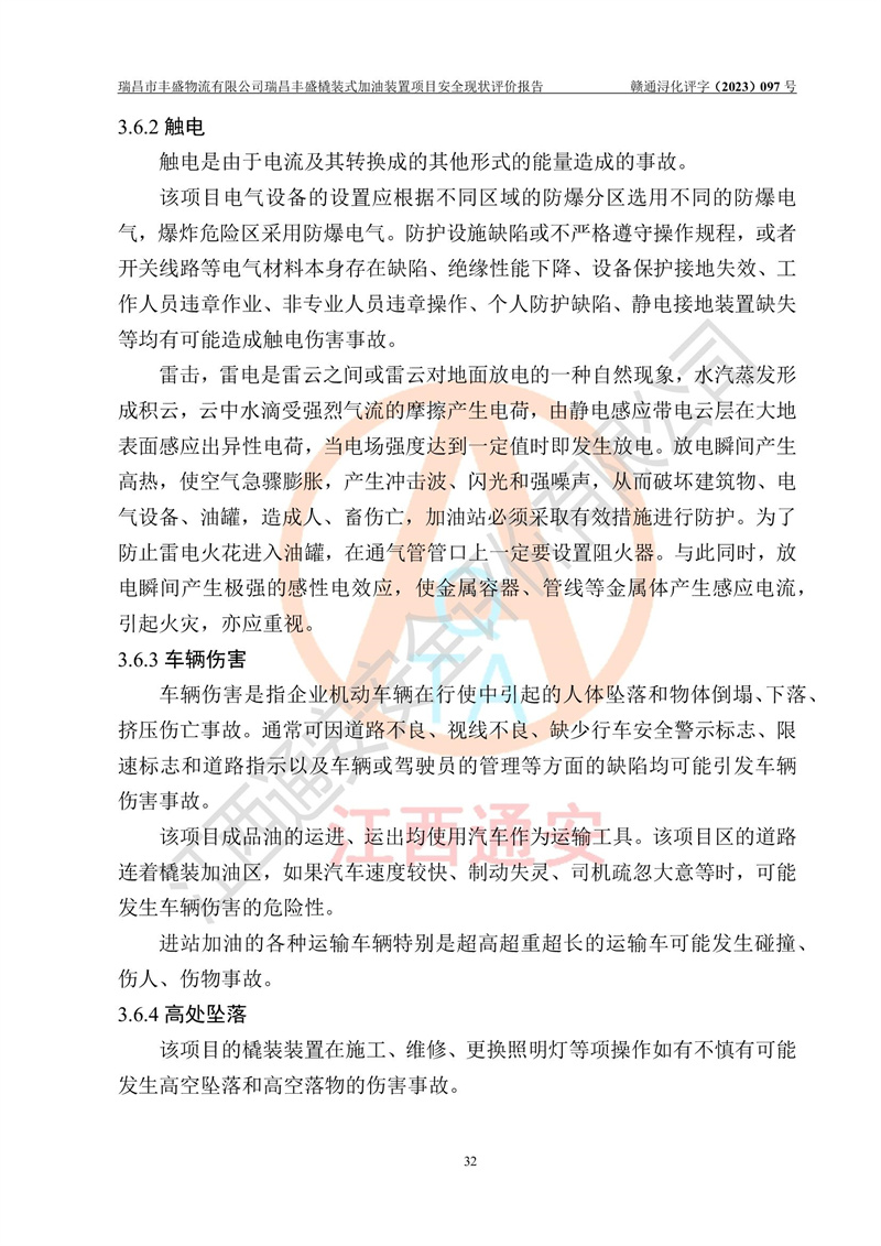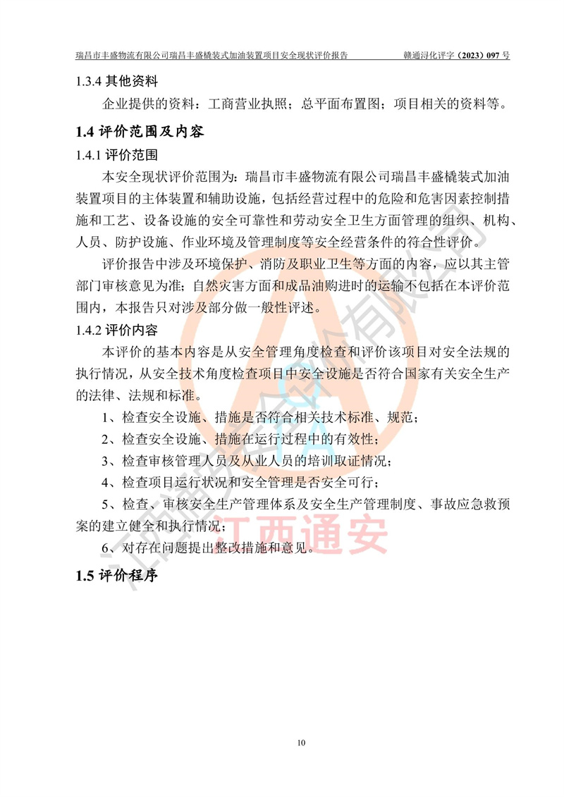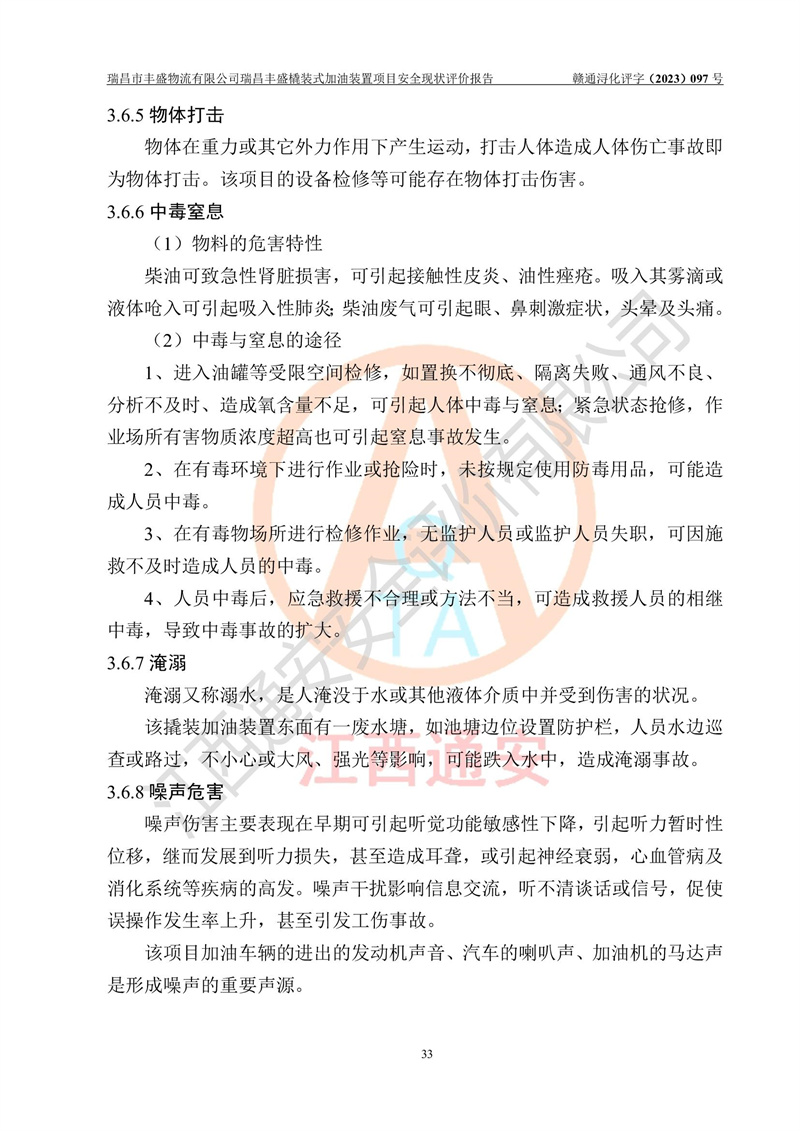 项目简介 | 瑞昌市丰盛物流有限公司于2022年04月13日成立,注册地址位于江西省九江市瑞昌市黄金乡林泉村大林下5组25号,经营地址位于瑞昌市黄金乡金岭村四组塘下原修配厂位置(具体以平面图为准)。法人**:王能志,注册资金50万元,经营范围包括许可项目:道路货物运输(不含危险货物)(依法经批准的项目),城市配送运输服务(不含危险货物)(依法经批准的项目,经相关部门批准后方可开展经营活动)一般项目:**货物运输代理,普通货物仓储服务(不含危险化学品等需许可审批的项目)。总质量4.5吨及以下普通货运**道路货物运输(除网络货运和危险货物)(除许可业务外,可自主依法经营法律法规非禁止或限制的项目)。 瑞昌丰盛橇装式加油装置项目属于瑞昌市丰盛物流有限公司,主要用于方便该企业矿山内部运输使用**加油服务。橇装加油装置设在瑞昌市黄金乡金岭村四组塘下原修配厂位置。 该项目总占地面积为1008m2(约1.5亩),其中围堰面积约为122m2(18.1m X 6.74m),橇装装置约为38.6m2(14.1m X2.74m),设双枪税控燃油加油机2台(4枪)及配套的工艺管线,设50m³ 0#柴油双层钢制储罐1台(隔仓罐,分2个仓,分别是2个25m³柴油储罐)。根据《采用橇装式加油装置的汽车加油站技术规范》(SH/T 3134-2002)、《汽车加油加气加氢站技术标准》(GB50156-2021)、《**安全监管总局办公厅关于自用橇装式加油装置安全监管问题复函》**安全监管总局办公厅管三函【2016】30号中相关规定,该橇装式加油装置为三级加油站,瑞昌市丰盛物流有限公司设加油点属企业自用橇装式加油装置,为企业内部加油使用,不对其他外界**提供加油服务,不对外进行运营、零售。 该项目涉及的柴油属于可燃液体,依据《危险化学品目录(2022修正)》**安全监管总局等10部门公告2015年第5号,应急部公告[2022]第8号,该项目柴油列入《危险化学品目录(2022修正)》,本项目不构成危险化学品重大危险源。 根据《中华人民共和国安全生产法》及其它安全生产法律法规的规定,为贯彻“安全**、预防为主、综合治理”的安全生产方针,为了确认该瑞昌丰盛橇装式加油装置项目安全设施与安全管理符合**、地方的有关标准规范,实现瑞昌丰盛橇装式加油装置项目安全生产与安全管理系统化、标准化、科学化,进一步提高项目的本质安全度,瑞昌市丰盛物流有限公司委托江西通安安全评价有限公司承担其瑞昌丰盛橇装式加油装置项目的安全现状评价。 江西通安安全评价有限责任公司接受委托,成立了评价小组,于2023年8月对现场进行了踏勘,收集了有关资料;根据《安全评价通则》的要求,对该公司瑞昌丰盛橇装式加油装置项目进行安全评价,在对委托方生产装置运行及其安全管理的现状进行充分了解后,充分查找了其存在的危险、有害因素种类和程度,编制了现场安全检查表,对存在的问题,评价组成员和委托方的陪同人员进行了及时的沟通,并提出了改进建议;按照《安全评价通则》的要求,依据**有关法律、法规、标准和规范,采用合适的安全评价方法,经过定性分析与定量计算,完成了本评价报告的编制。 本次安全评价范围为瑞昌市丰盛物流有限公司瑞昌丰盛橇装式加油装置项目的主体装置和辅助设施,包括经营过程中的危险和危害因素控制措施和工艺、设备设施的安全可靠性和劳动安全卫生方面管理的组织、机构、人员、防护设施、作业环境及管理制度等安全经营条件的符合性评价。 评价报告中涉及环境保护、消防及职业卫生等方面的内容,应以其主管部门审核意见为准;自然灾害方面和成品油购进时的运输不包括在本评价范围内,本报告只对涉及部分做一般性评述。 | |||||||