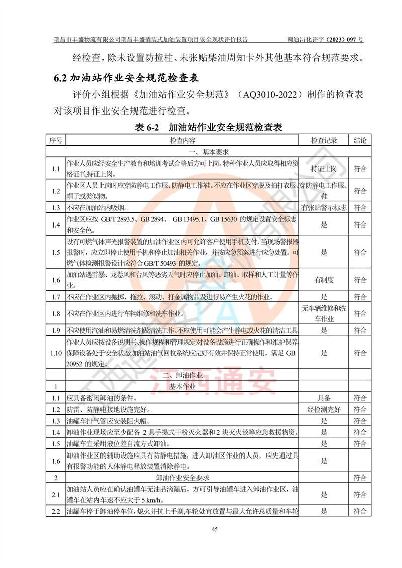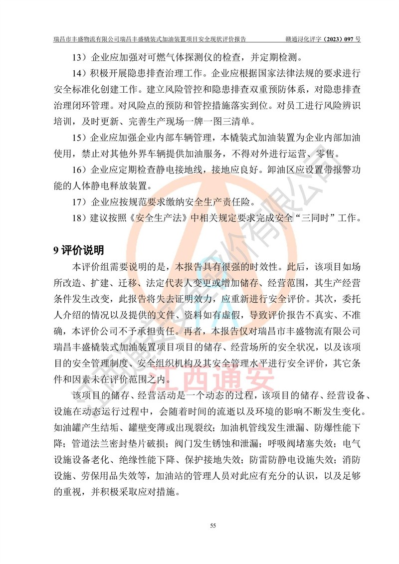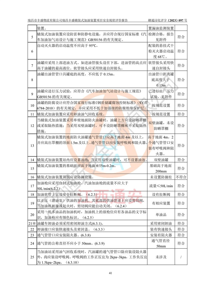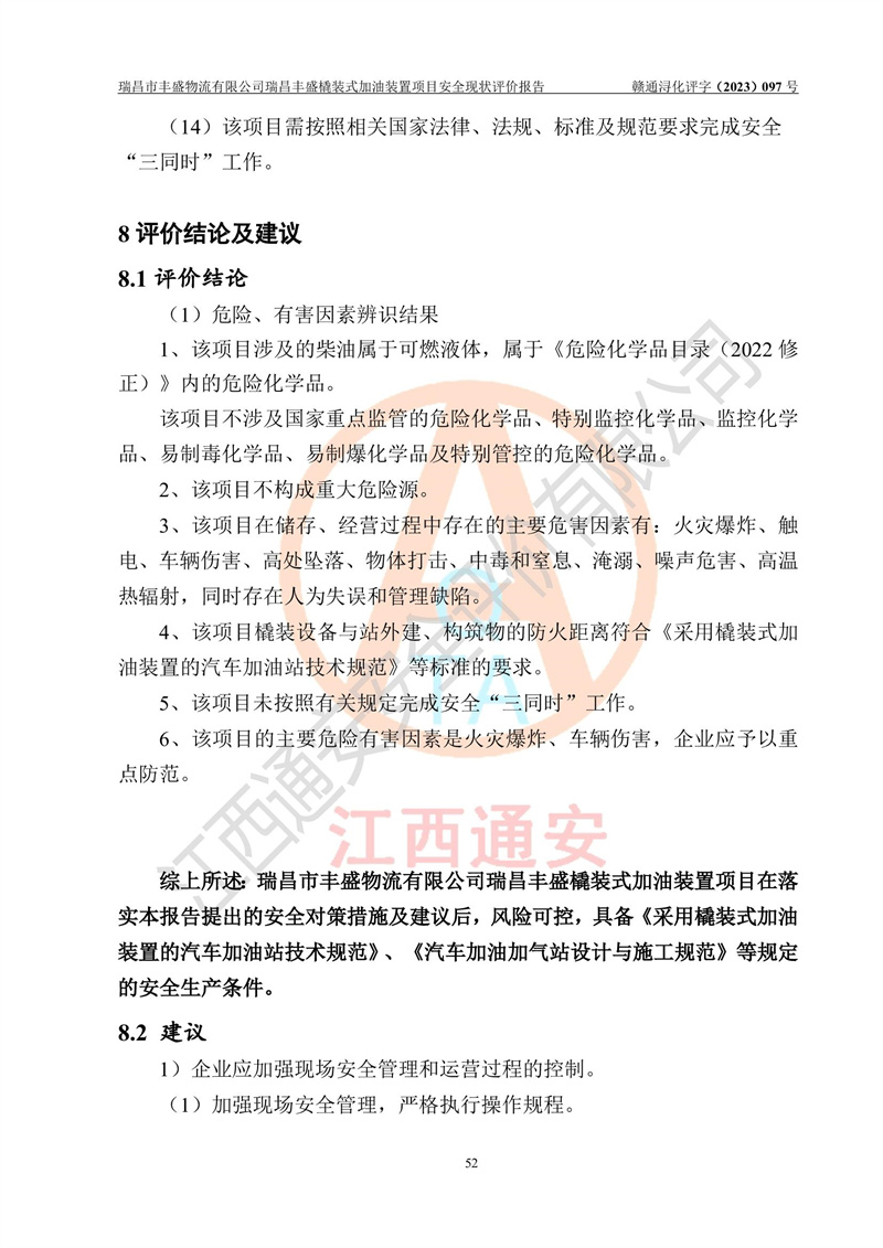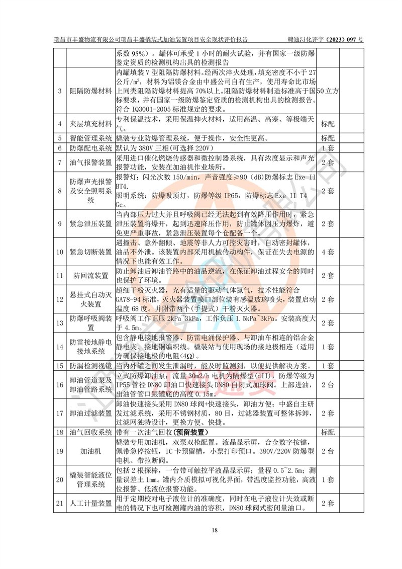 评价结论 | 瑞昌市丰盛物流有限公司瑞昌丰盛橇装式加油装置项目在落实本报告提出的安全对策措施及建议后,风险可控,具备《采用橇装式加油装置的汽车加油站技术规范》、《汽车加油加气站设计与施工规范》等规定的安全生产条件。 | |||||||