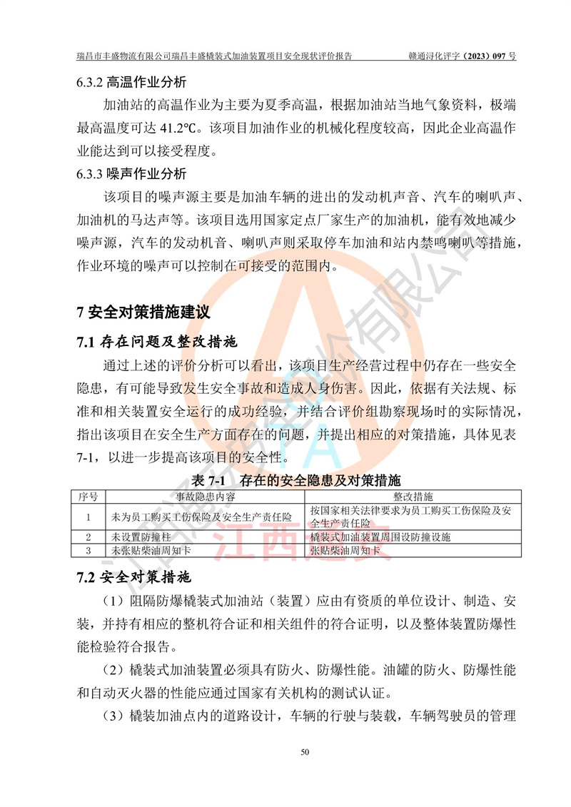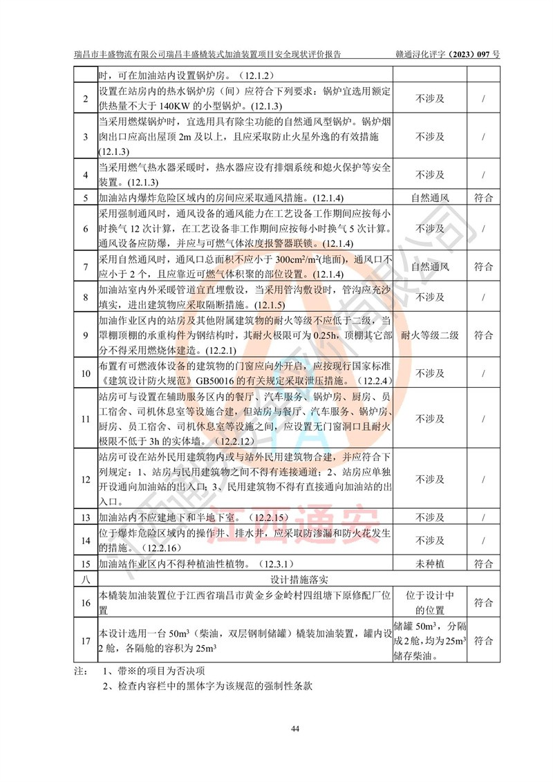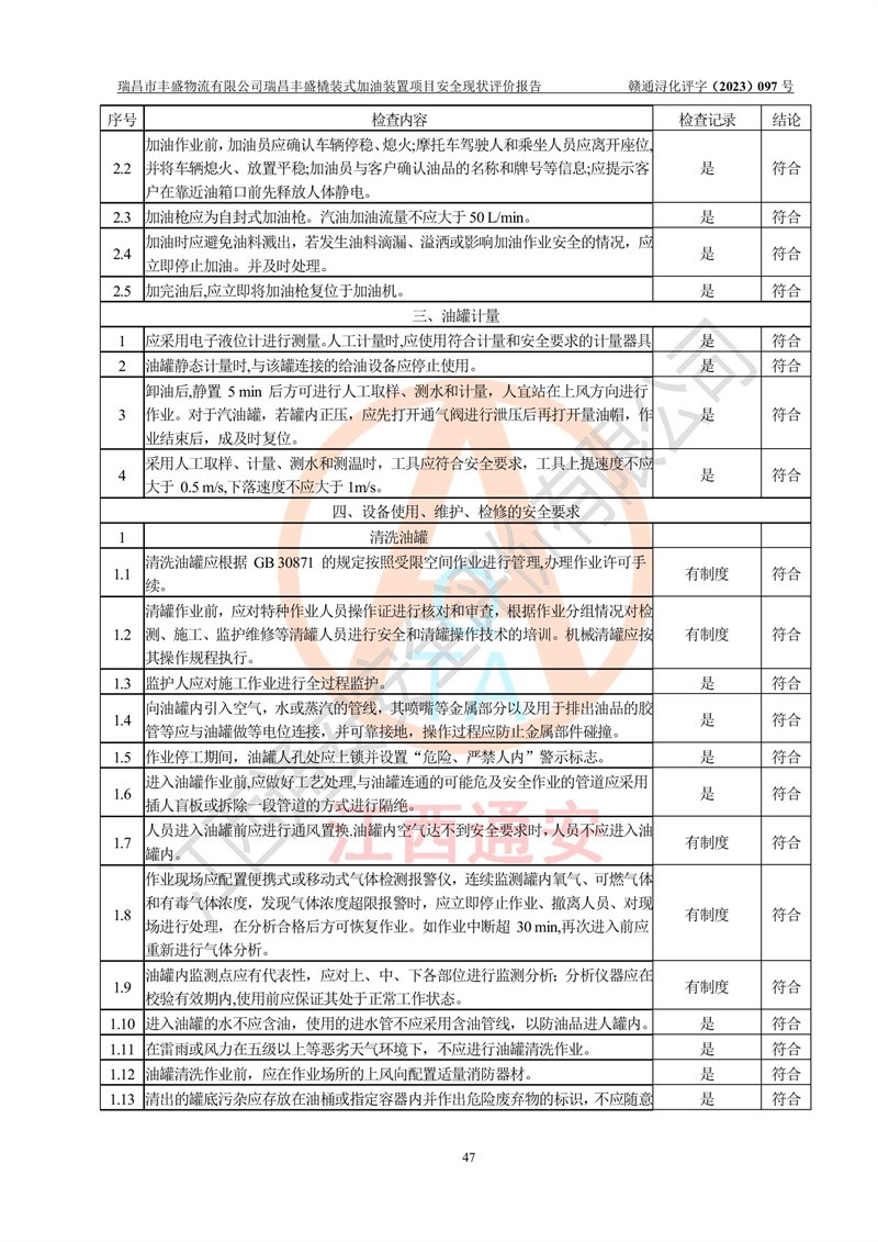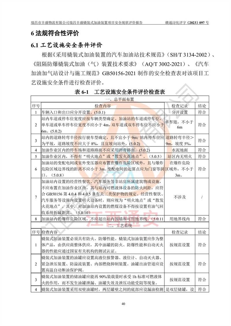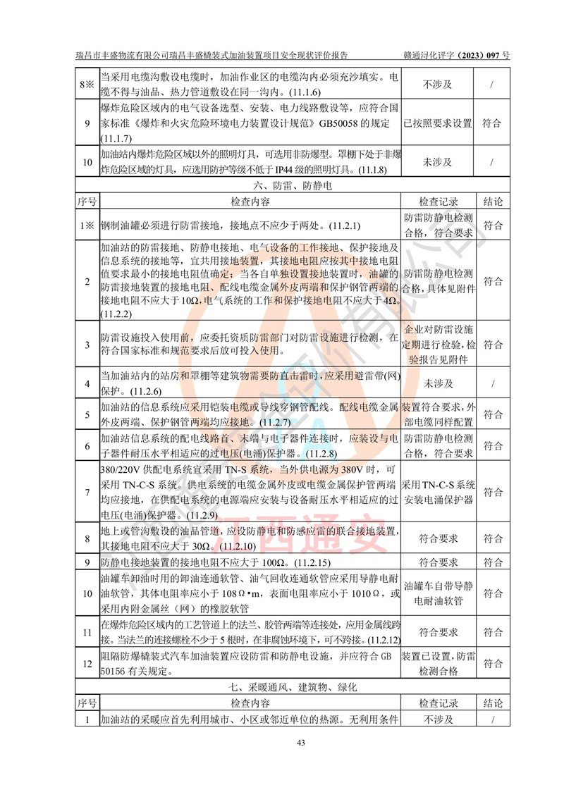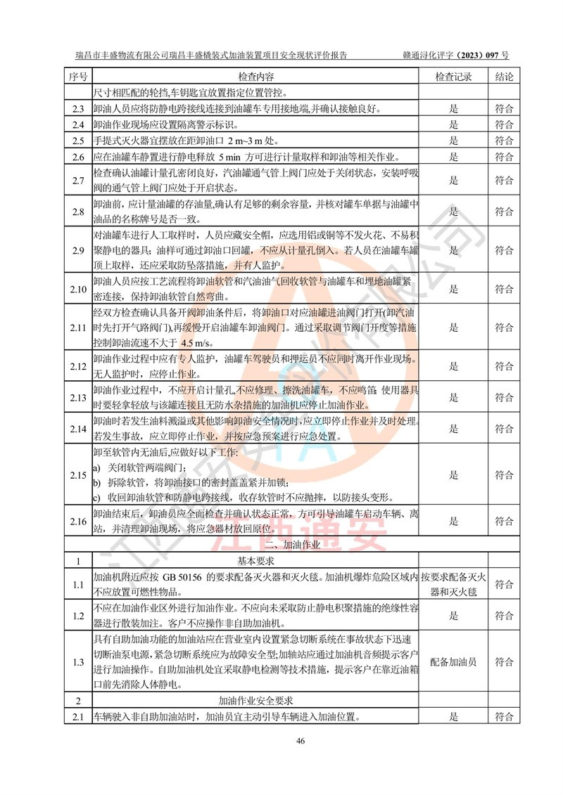 评价结论 | 瑞昌市丰盛物流有限公司瑞昌丰盛橇装式加油装置项目在落实本报告提出的安全对策措施及建议后,风险可控,具备《采用橇装式加油装置的汽车加油站技术规范》、《汽车加油加气站设计与施工规范》等规定的安全生产条件。 | |||||||