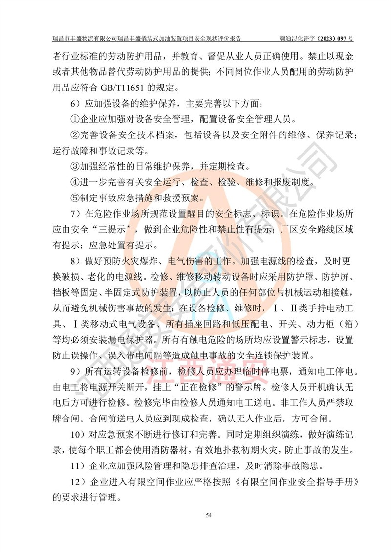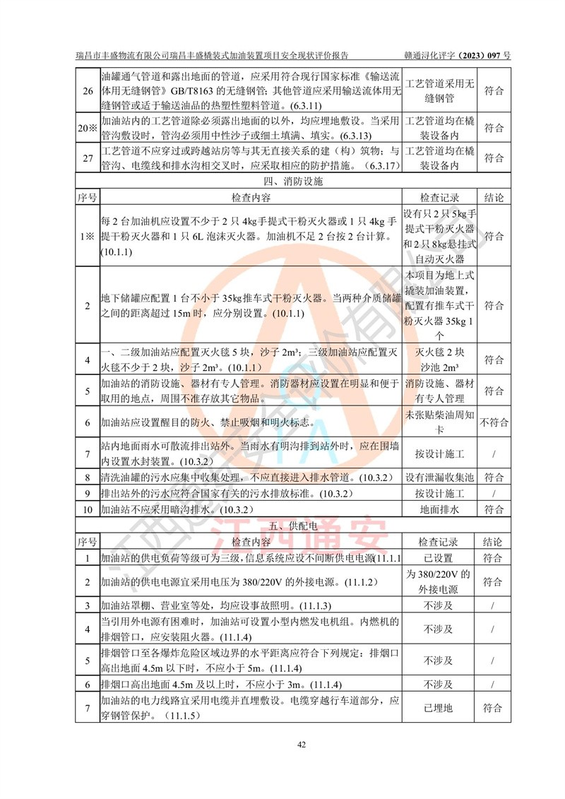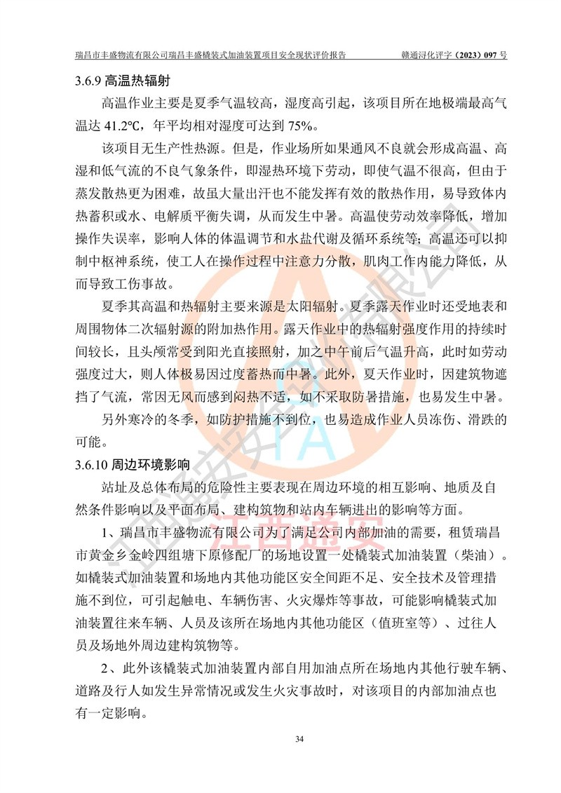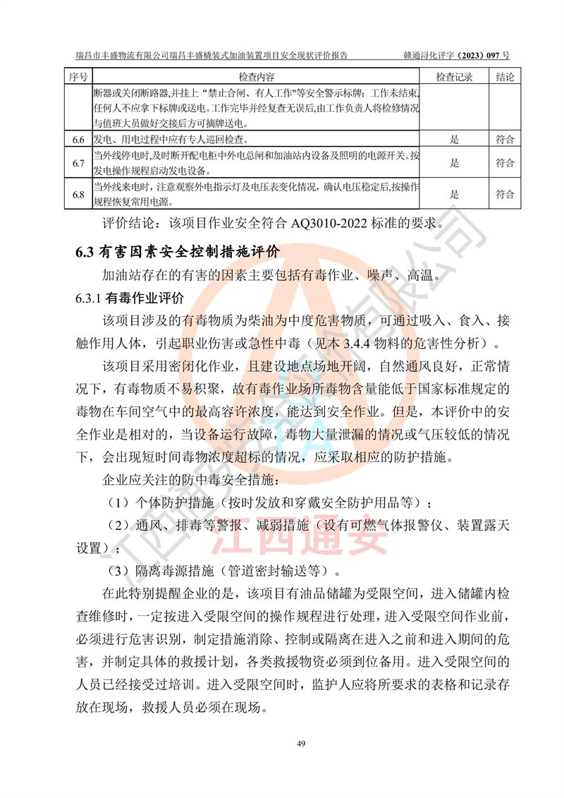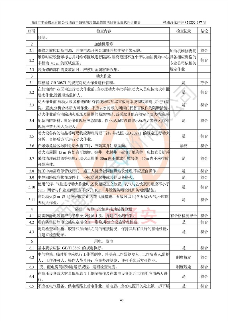 评价结论 | 瑞昌市丰盛物流有限公司瑞昌丰盛橇装式加油装置项目在落实本报告提出的安全对策措施及建议后,风险可控,具备《采用橇装式加油装置的汽车加油站技术规范》、《汽车加油加气站设计与施工规范》等规定的安全生产条件。 | |||||||