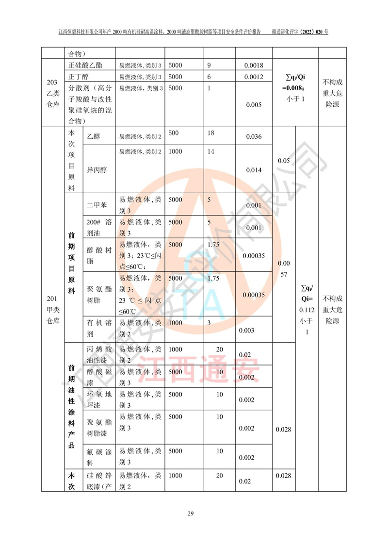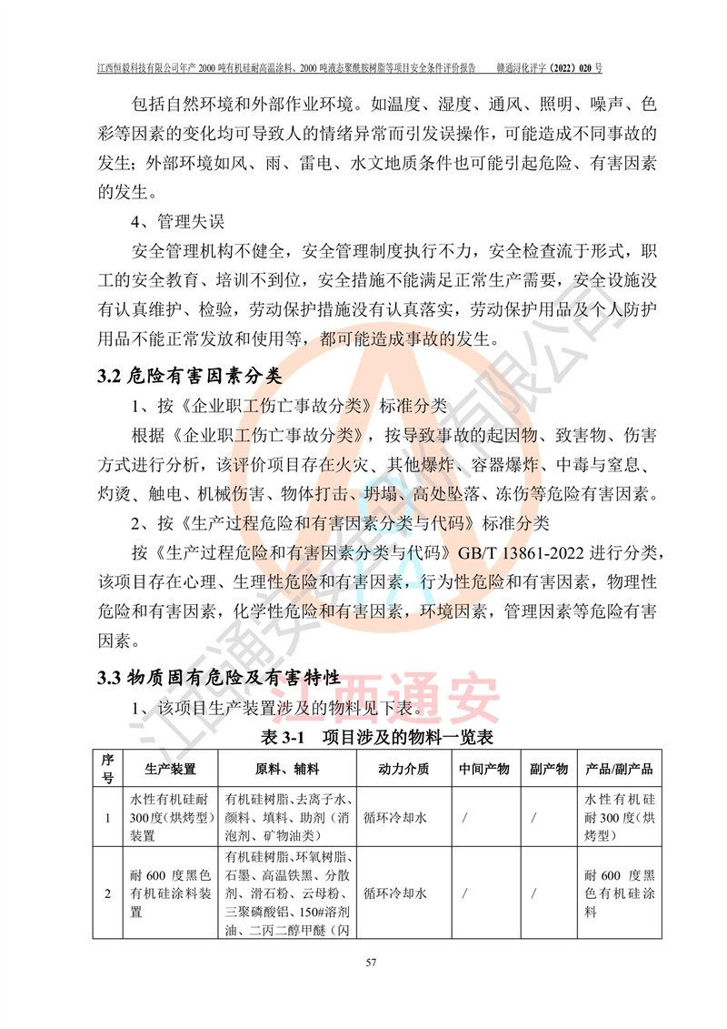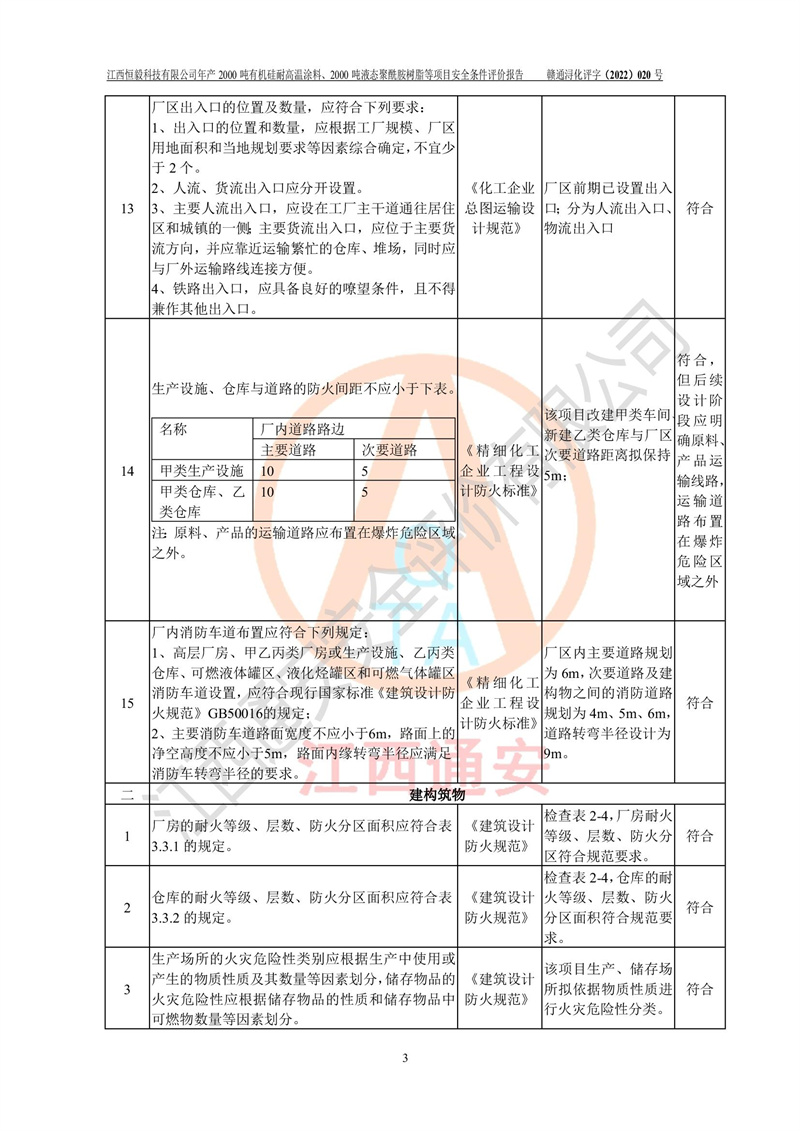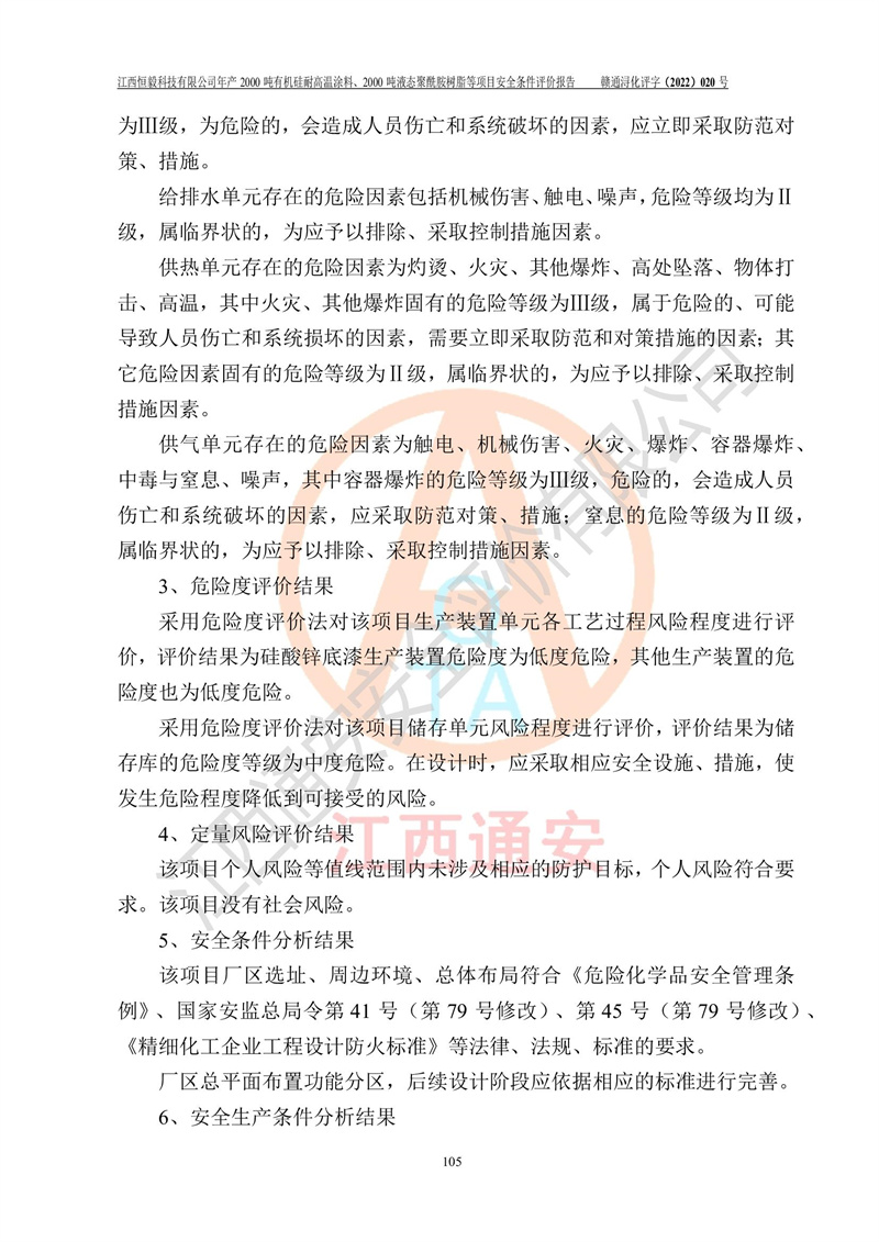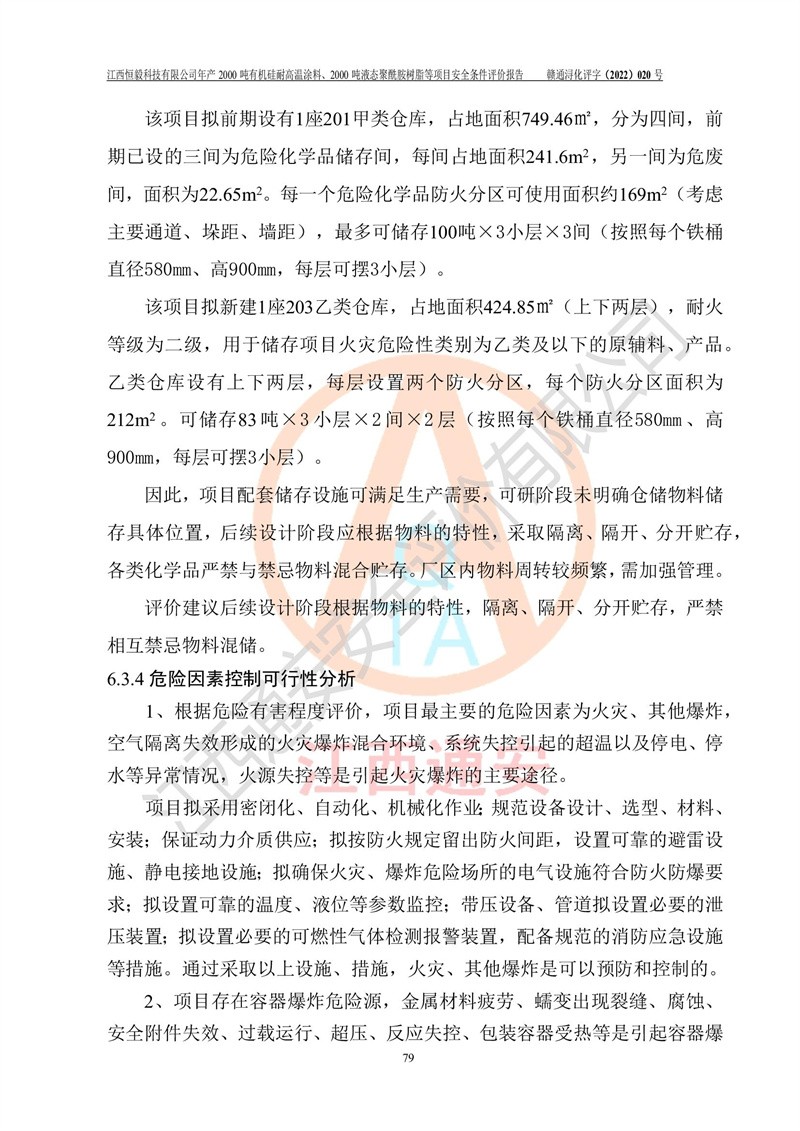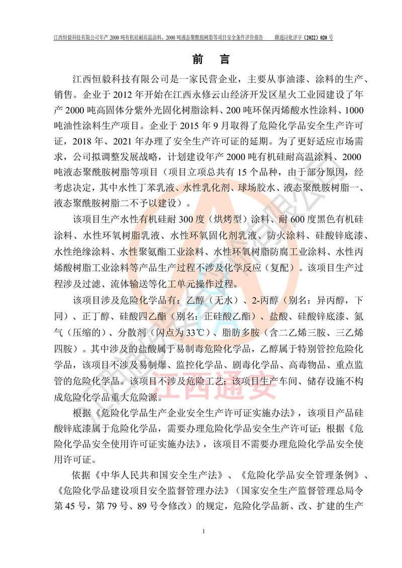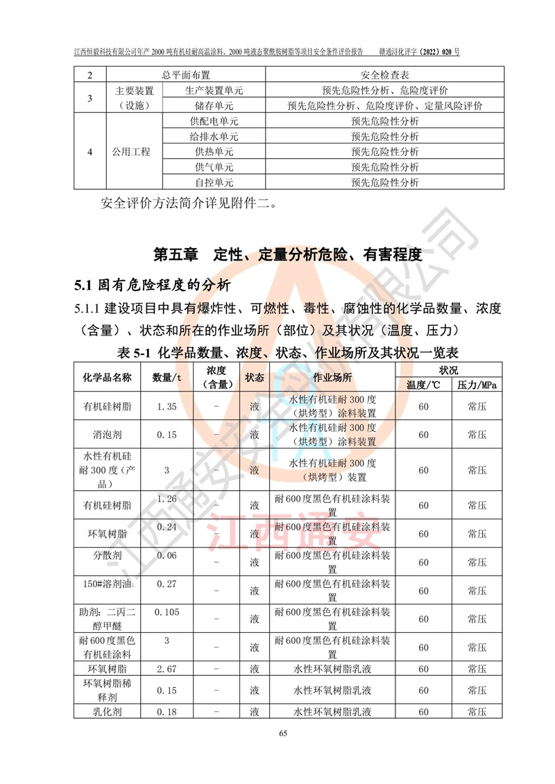 评价结论 | 江西恒毅科技有限公司年产2000吨有机硅耐高温涂料、2000吨液态聚酰胺树脂等项目的选址、总体布局、周边环境、自然环境能满足建设安全条件;项目选择的工艺过程及设备设施的安全可靠性能达到**法规、标准规定要求;项目存在的危险有害因素可控,在落实本评价报告提出的有关安全对策措施后,其危险有害程度能达到可以接受的程度,项目建设能够实现安 全运行的目标。 | ||||