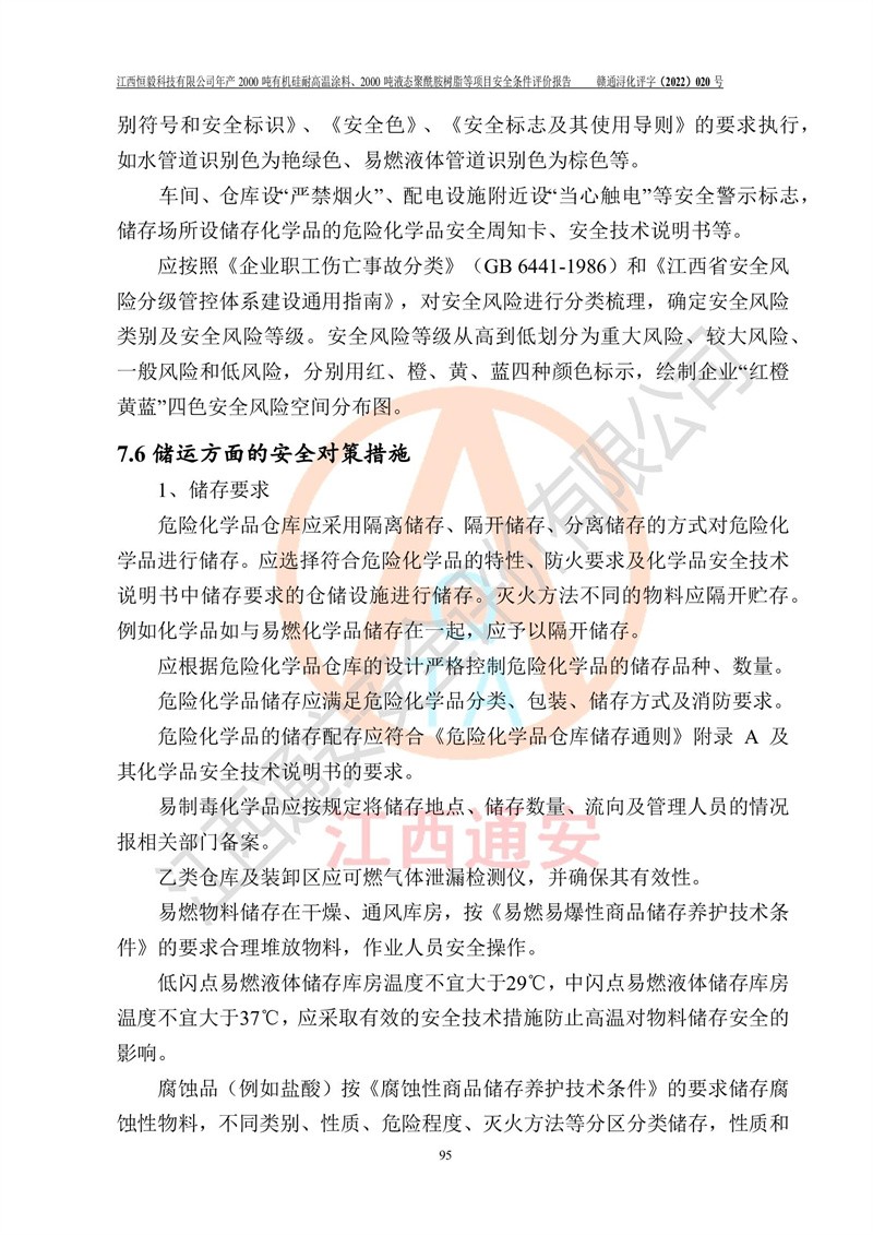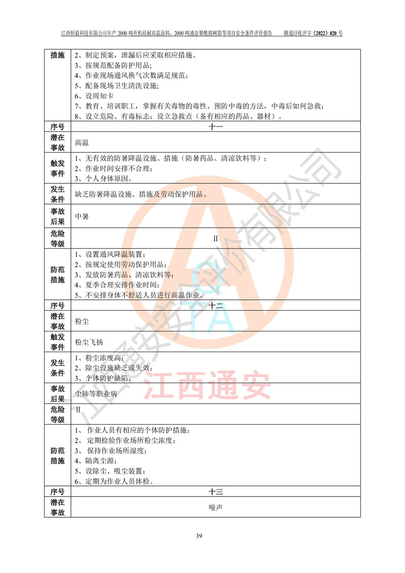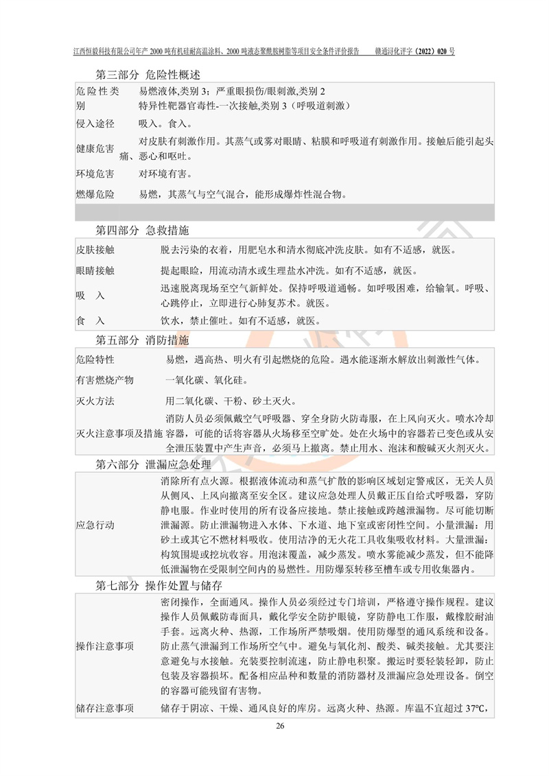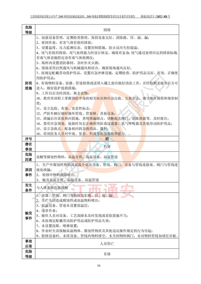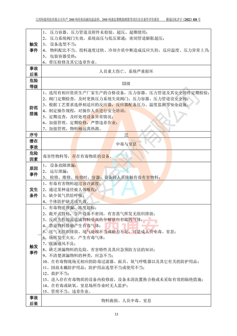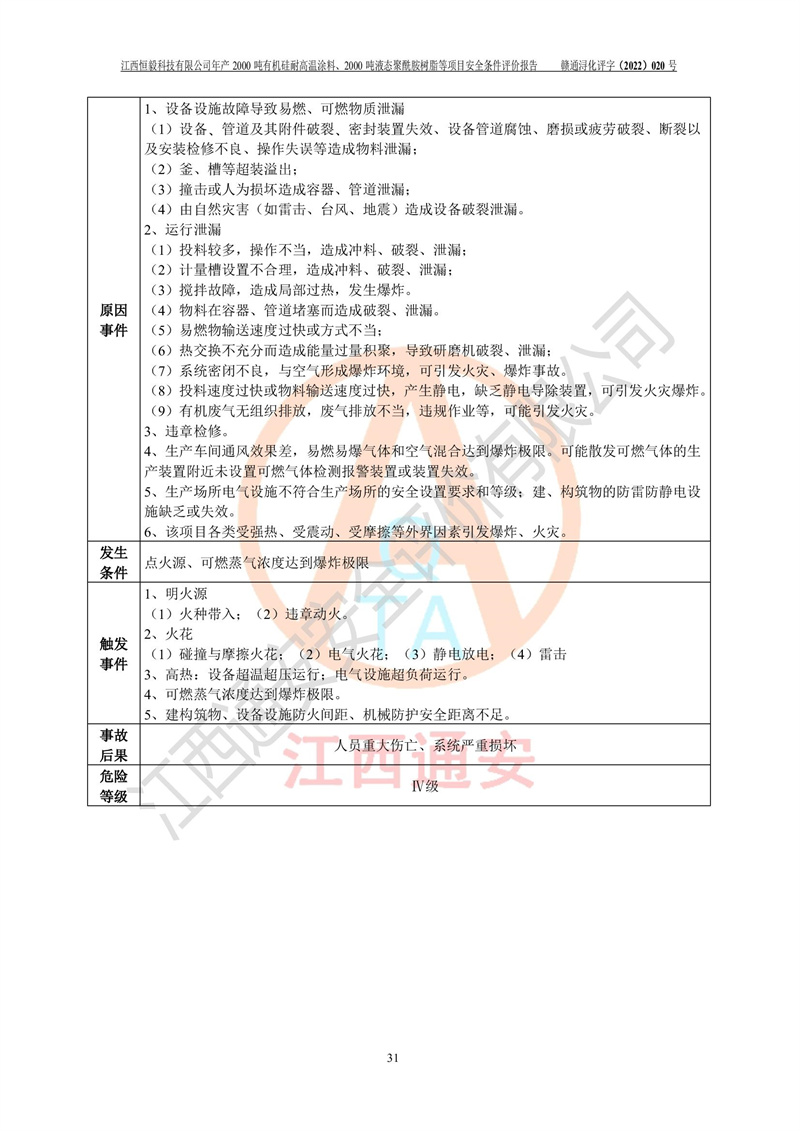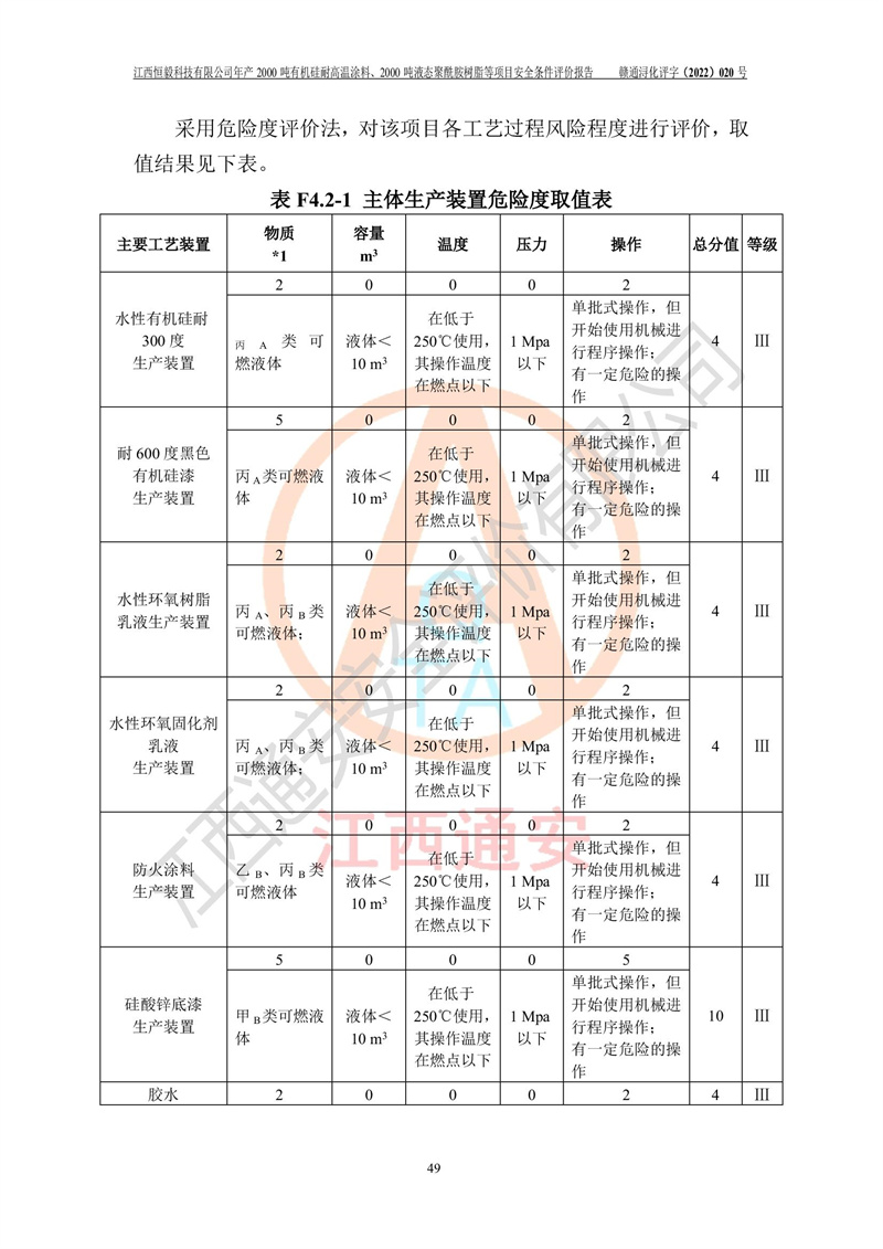 评价结论 | 江西恒毅科技有限公司年产2000吨有机硅耐高温涂料、2000吨液态聚酰胺树脂等项目的选址、总体布局、周边环境、自然环境能满足建设安全条件;项目选择的工艺过程及设备设施的安全可靠性能达到**法规、标准规定要求;项目存在的危险有害因素可控,在落实本评价报告提出的有关安全对策措施后,其危险有害程度能达到可以接受的程度,项目建设能够实现安 全运行的目标。 | ||||