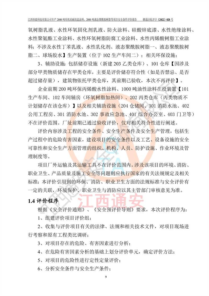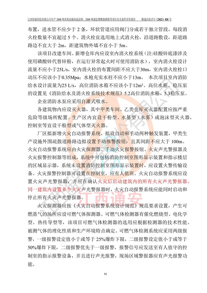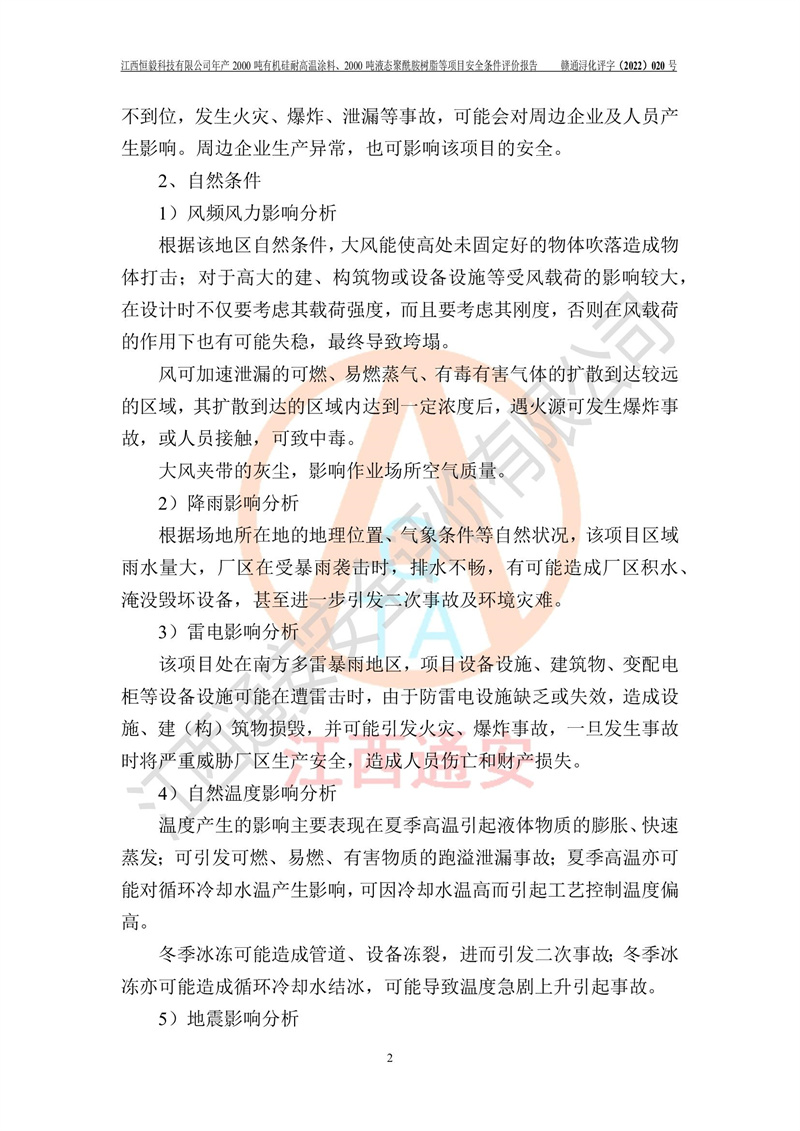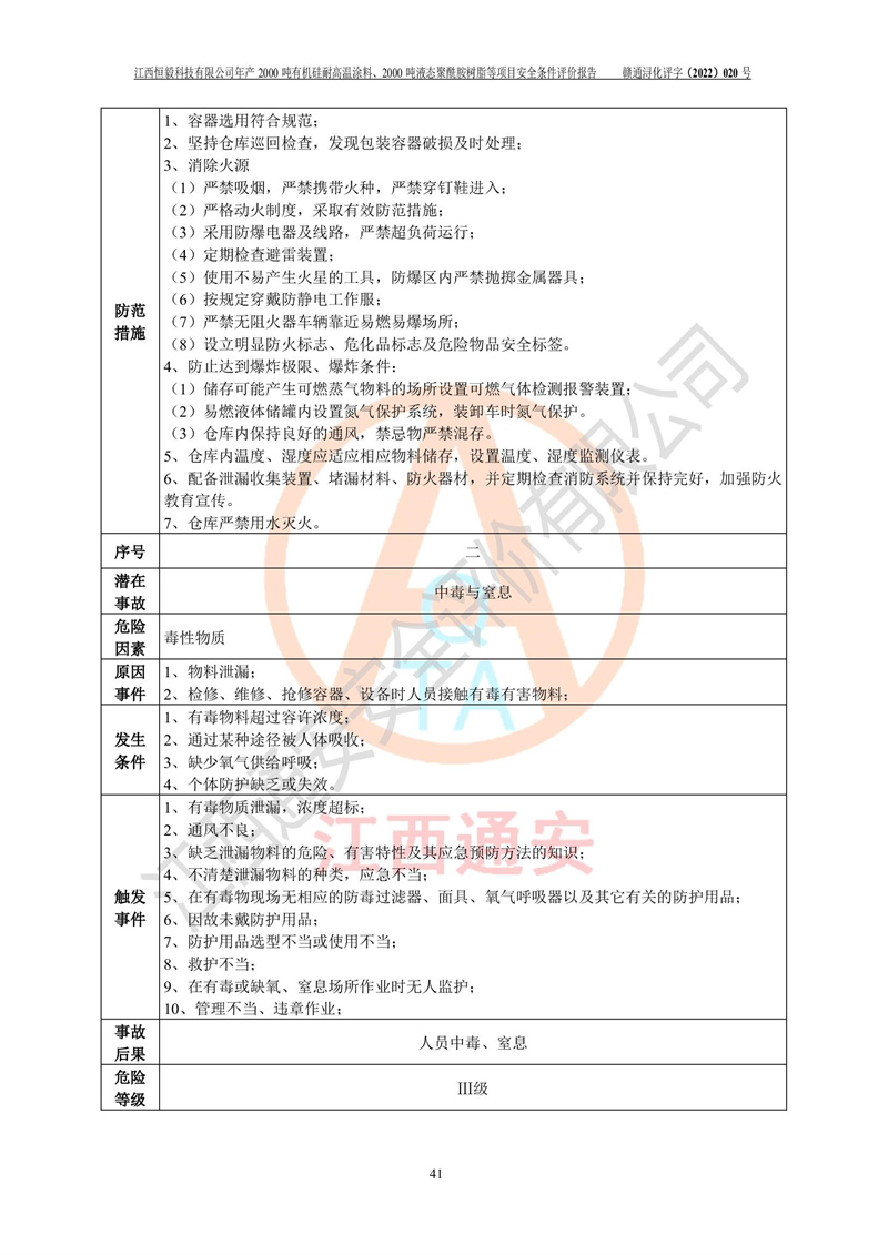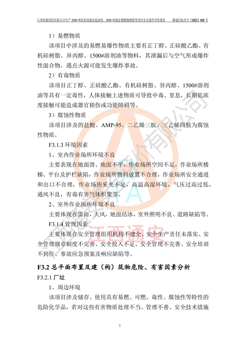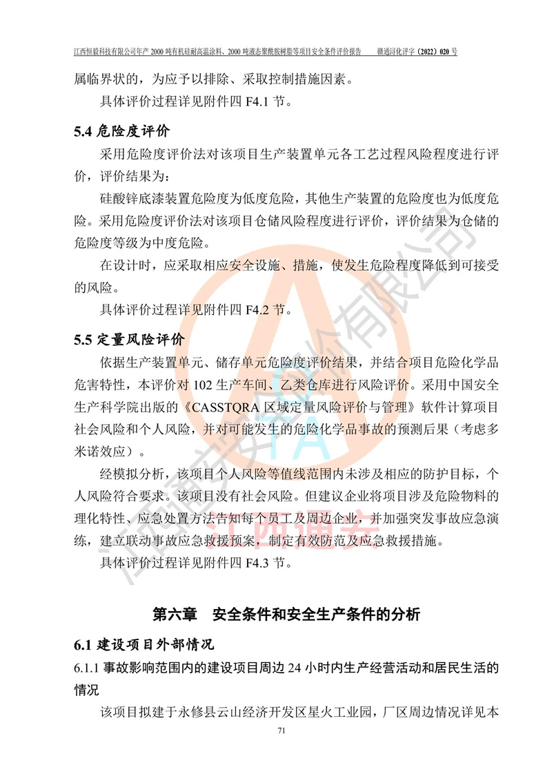 评价结论 | 江西恒毅科技有限公司年产2000吨有机硅耐高温涂料、2000吨液态聚酰胺树脂等项目的选址、总体布局、周边环境、自然环境能满足建设安全条件;项目选择的工艺过程及设备设施的安全可靠性能达到**法规、标准规定要求;项目存在的危险有害因素可控,在落实本评价报告提出的有关安全对策措施后,其危险有害程度能达到可以接受的程度,项目建设能够实现安 全运行的目标。 | ||||