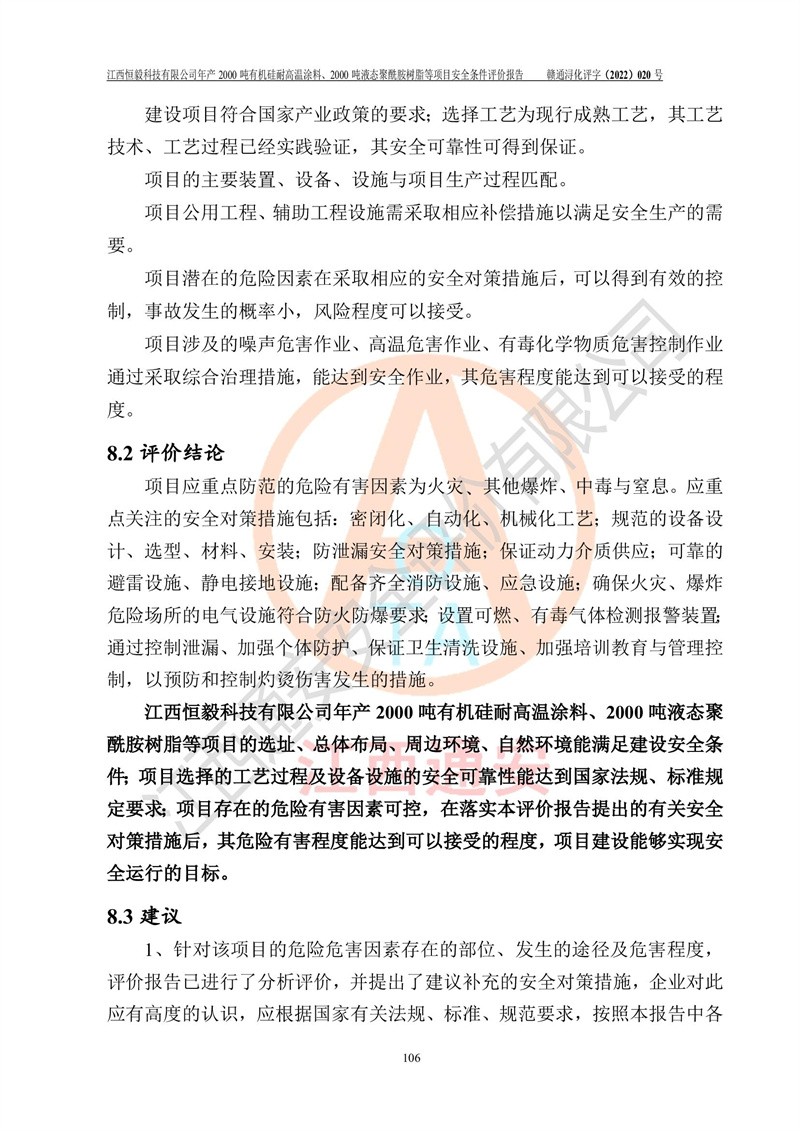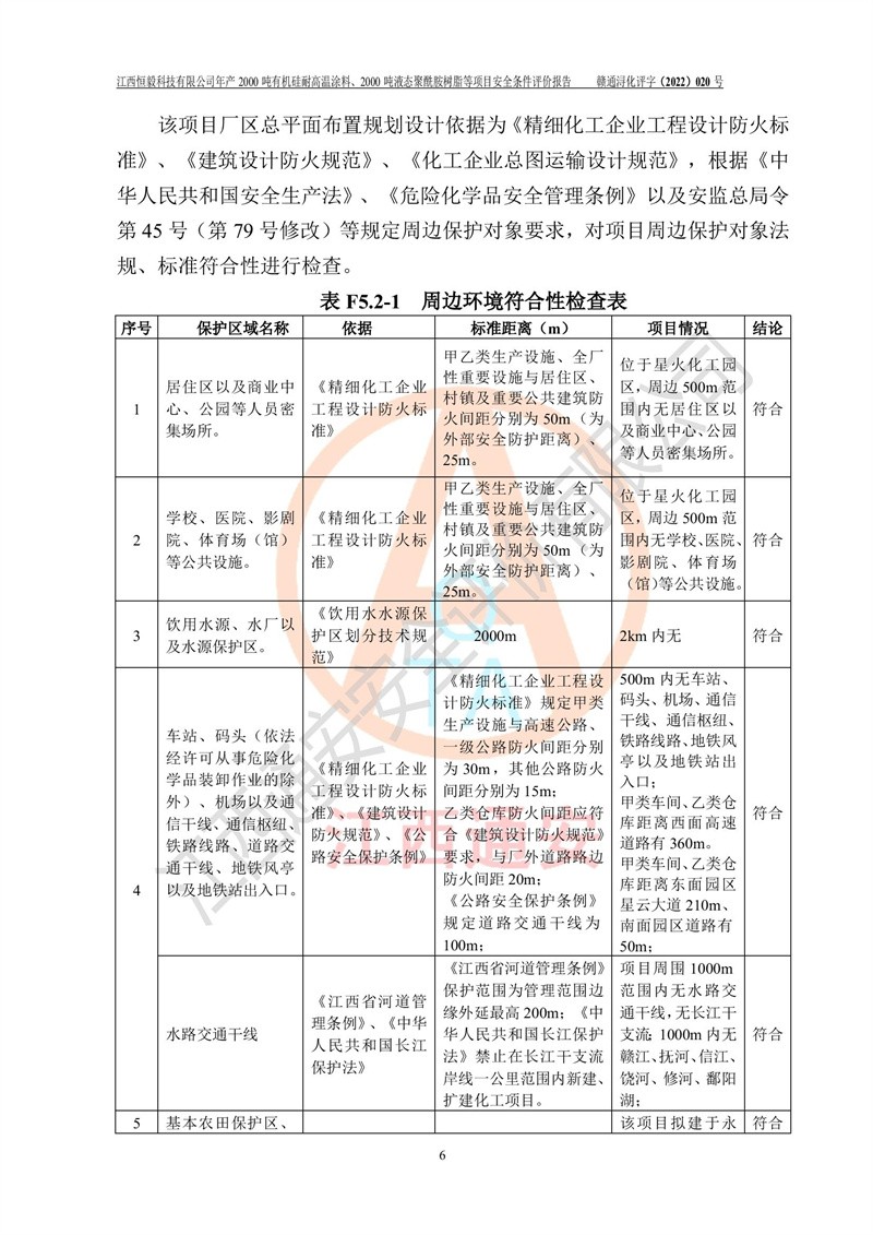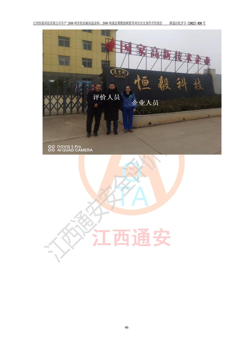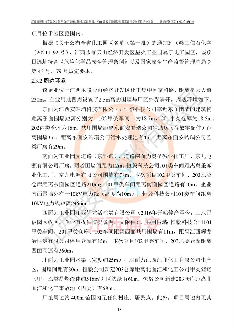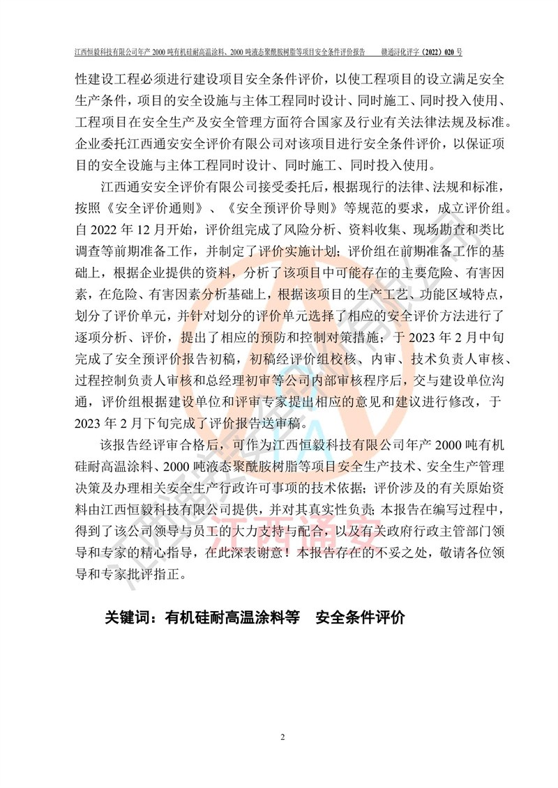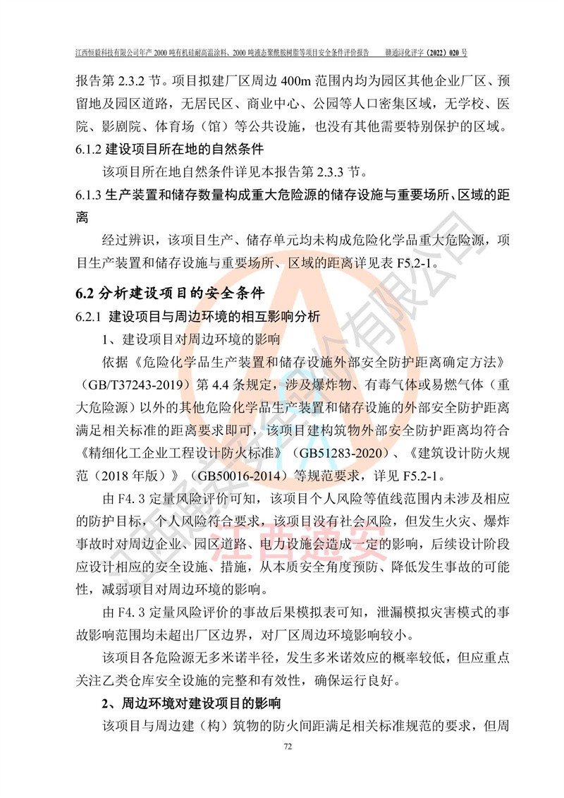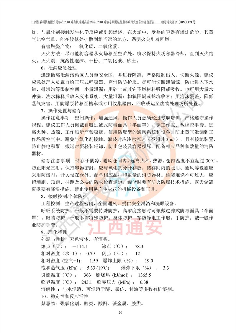 评价结论 | 江西恒毅科技有限公司年产2000吨有机硅耐高温涂料、2000吨液态聚酰胺树脂等项目的选址、总体布局、周边环境、自然环境能满足建设安全条件;项目选择的工艺过程及设备设施的安全可靠性能达到**法规、标准规定要求;项目存在的危险有害因素可控,在落实本评价报告提出的有关安全对策措施后,其危险有害程度能达到可以接受的程度,项目建设能够实现安 全运行的目标。 | ||||