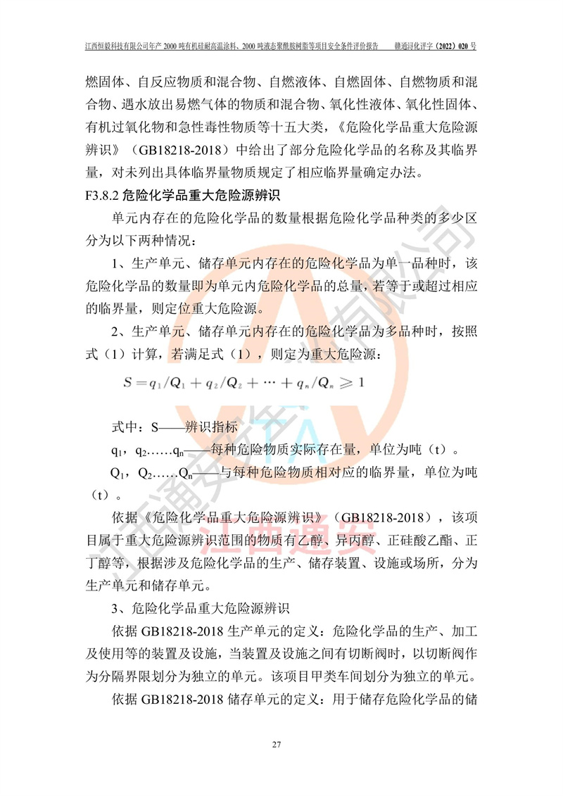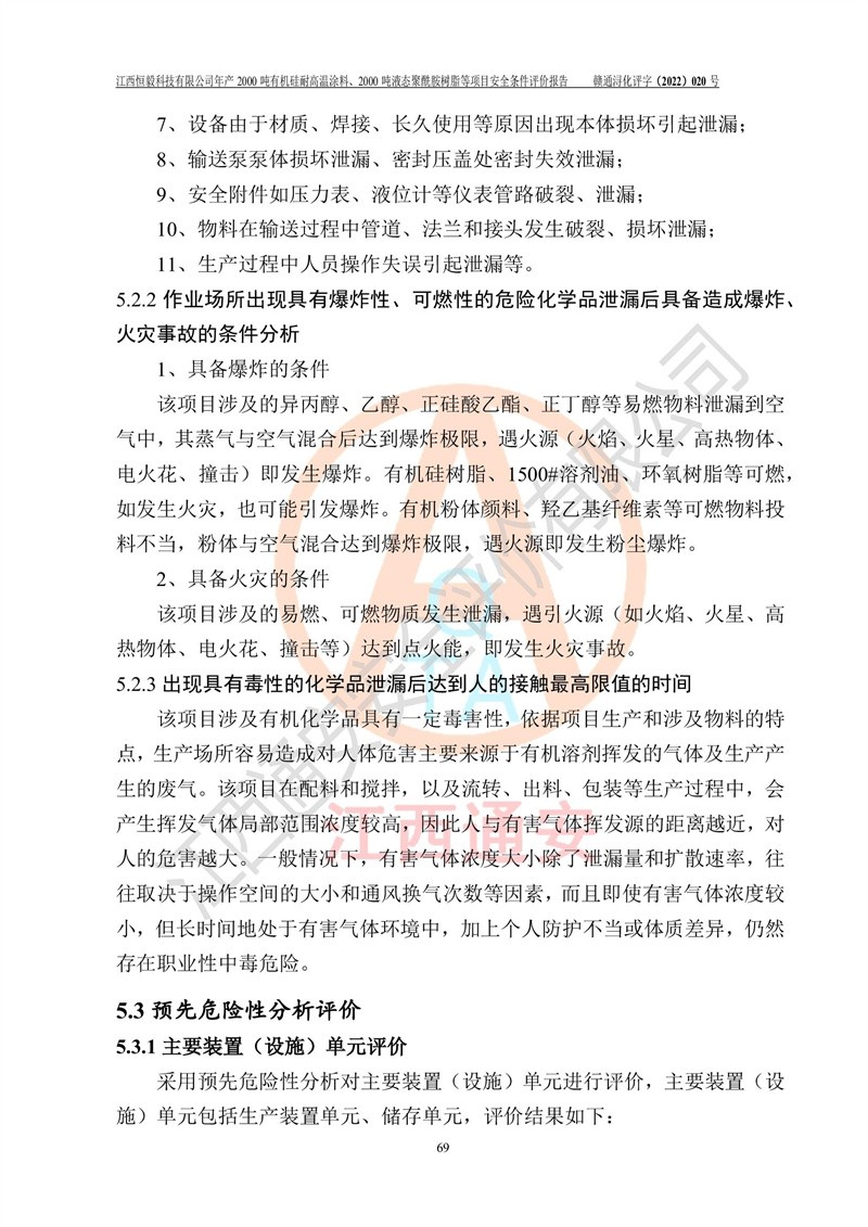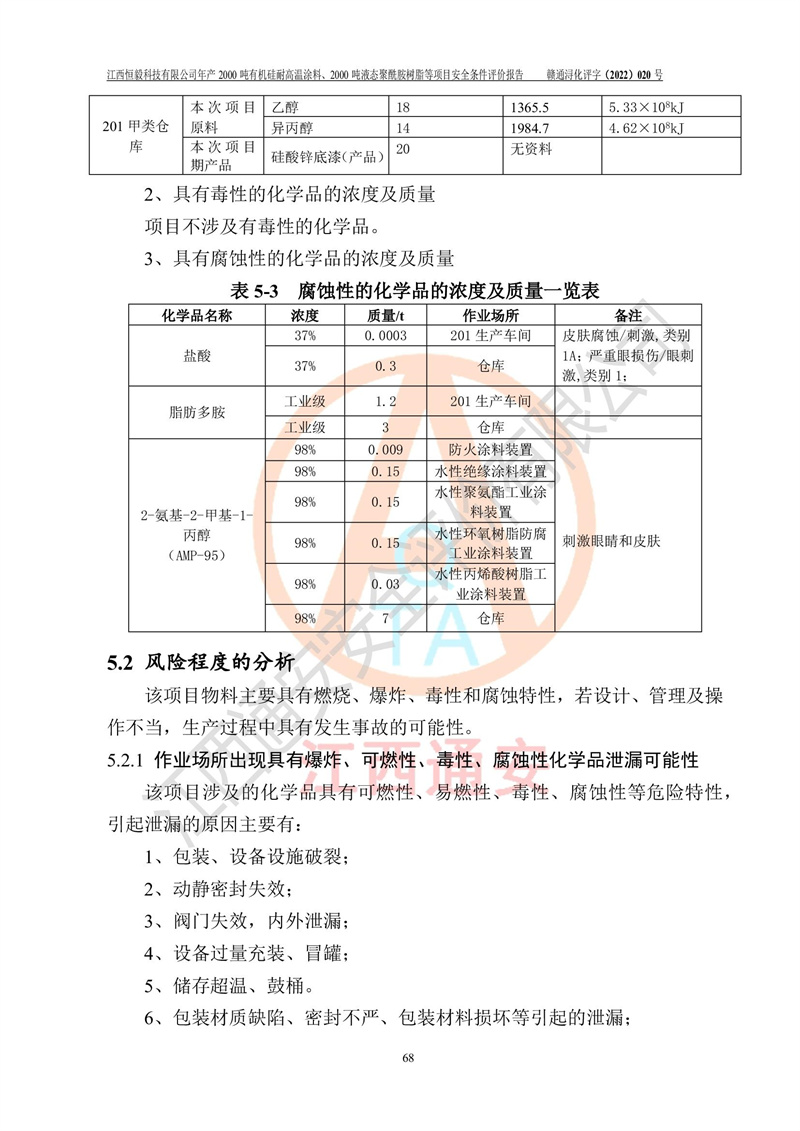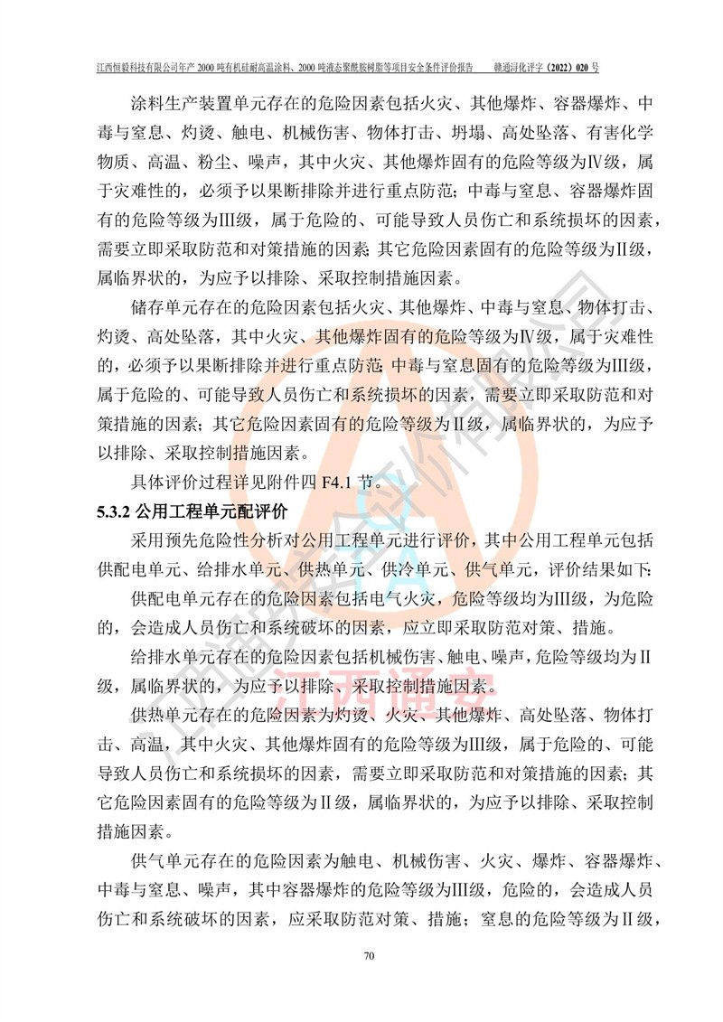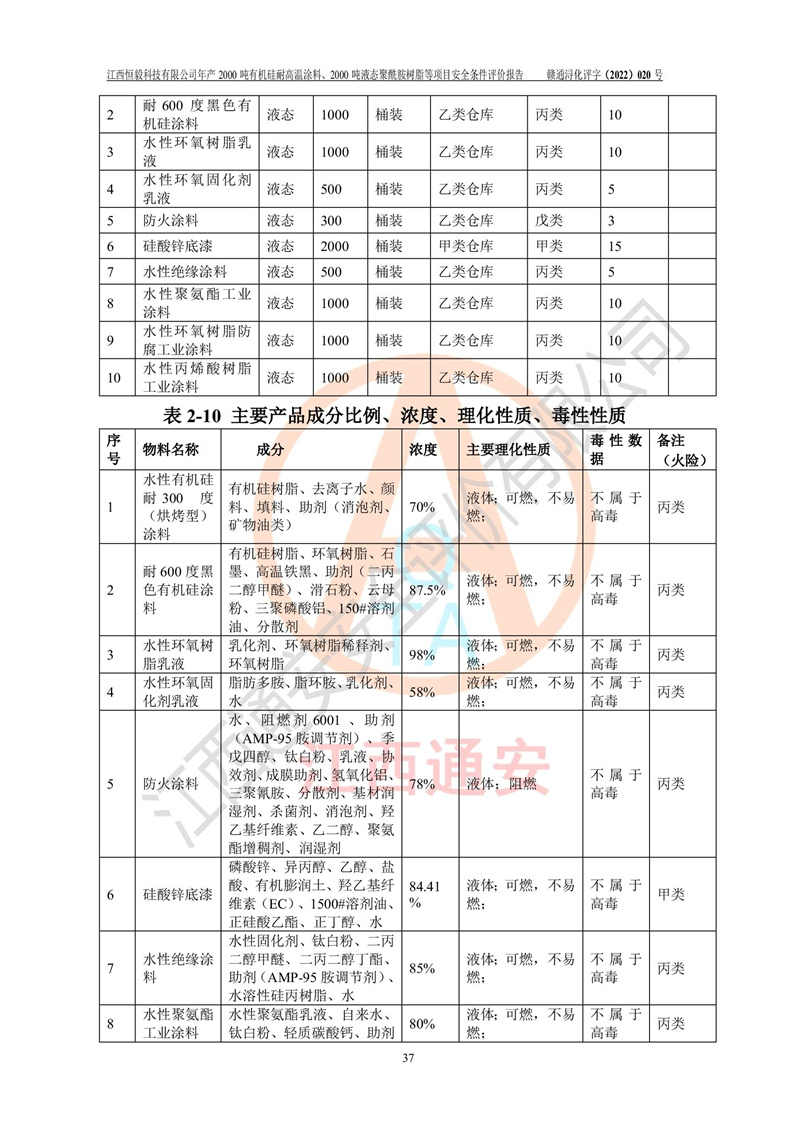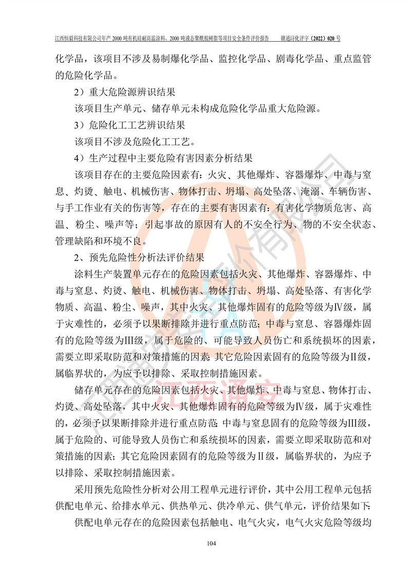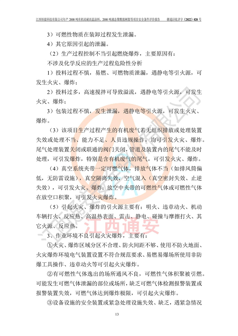 评价结论 | 江西恒毅科技有限公司年产2000吨有机硅耐高温涂料、2000吨液态聚酰胺树脂等项目的选址、总体布局、周边环境、自然环境能满足建设安全条件;项目选择的工艺过程及设备设施的安全可靠性能达到**法规、标准规定要求;项目存在的危险有害因素可控,在落实本评价报告提出的有关安全对策措施后,其危险有害程度能达到可以接受的程度,项目建设能够实现安 全运行的目标。 | ||||