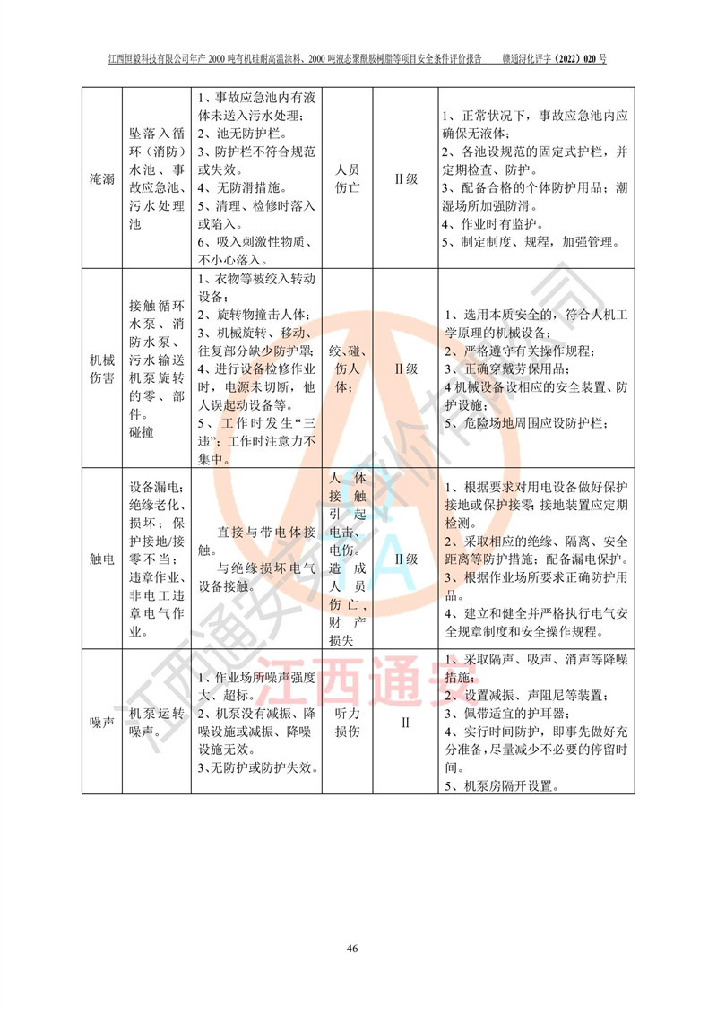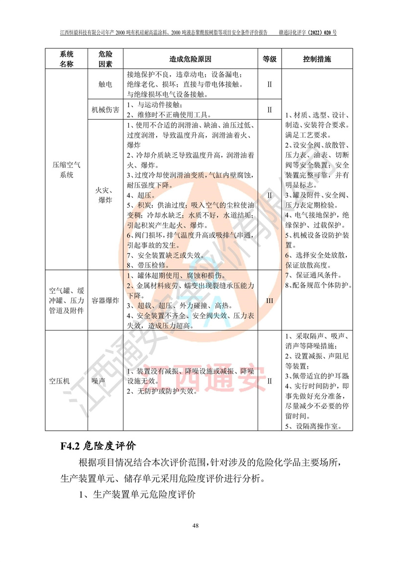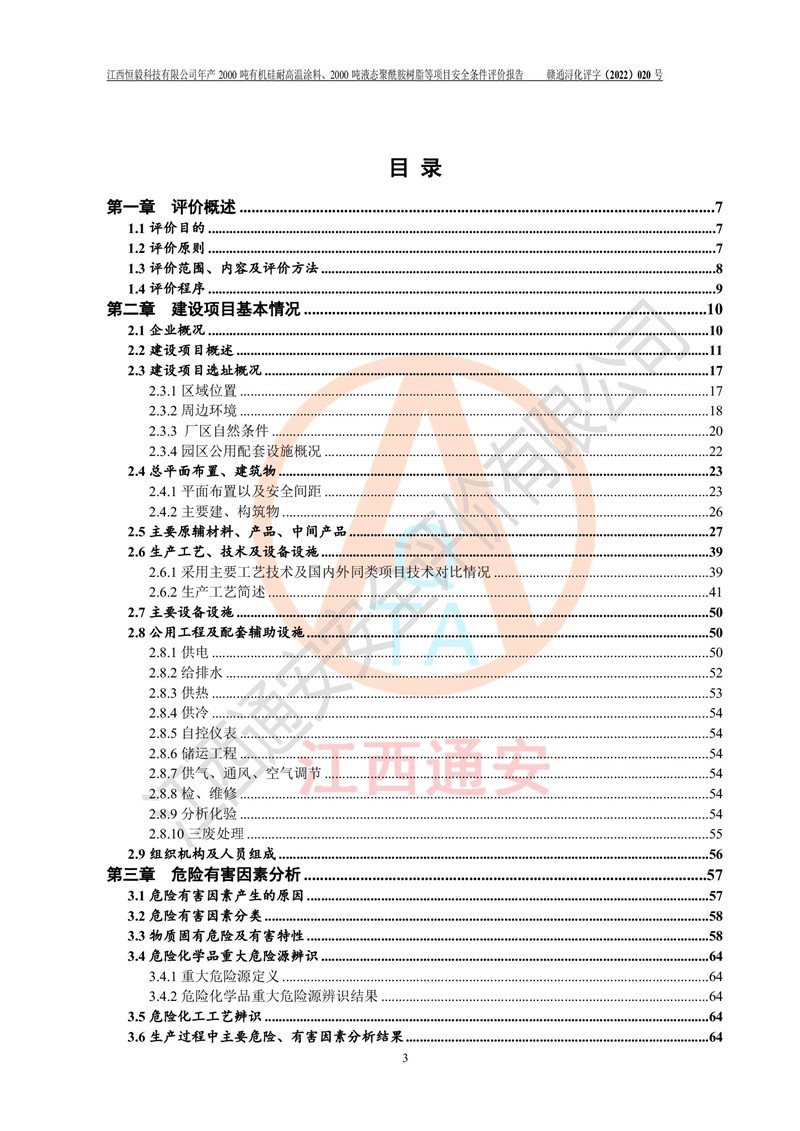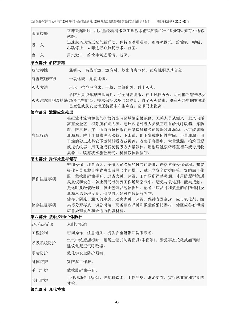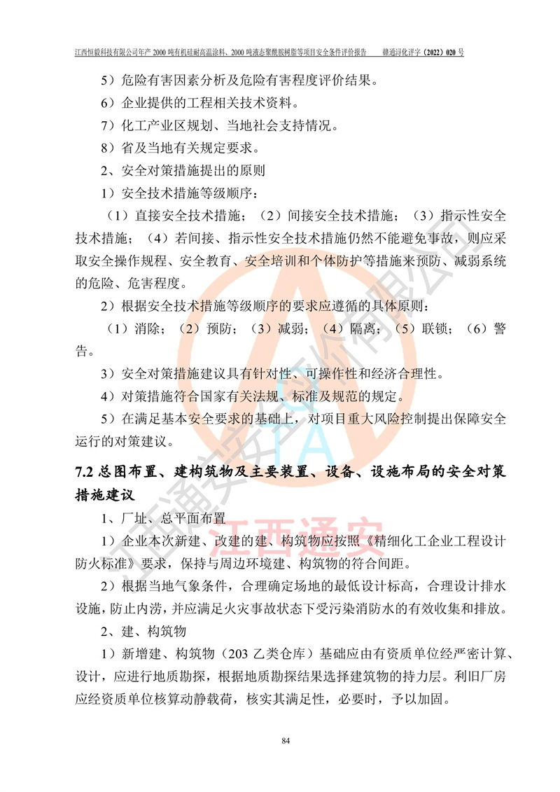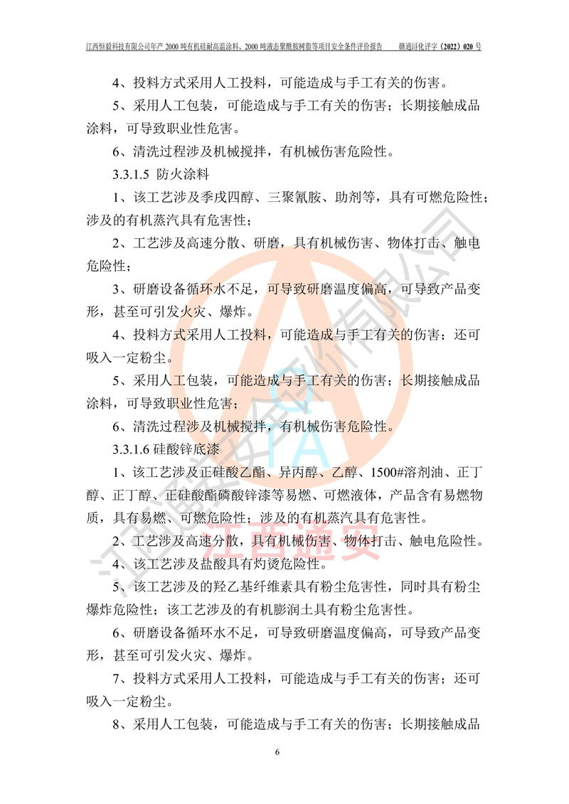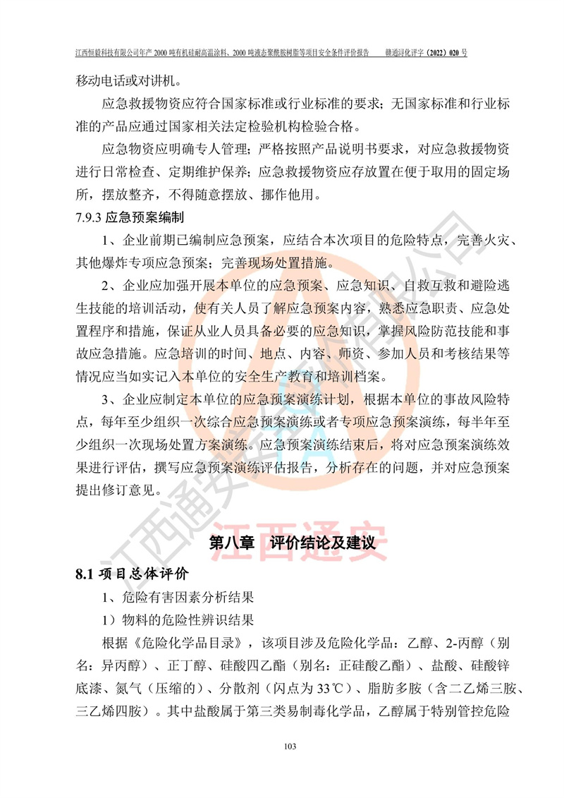 评价结论 | 江西恒毅科技有限公司年产2000吨有机硅耐高温涂料、2000吨液态聚酰胺树脂等项目的选址、总体布局、周边环境、自然环境能满足建设安全条件;项目选择的工艺过程及设备设施的安全可靠性能达到**法规、标准规定要求;项目存在的危险有害因素可控,在落实本评价报告提出的有关安全对策措施后,其危险有害程度能达到可以接受的程度,项目建设能够实现安 全运行的目标。 | ||||